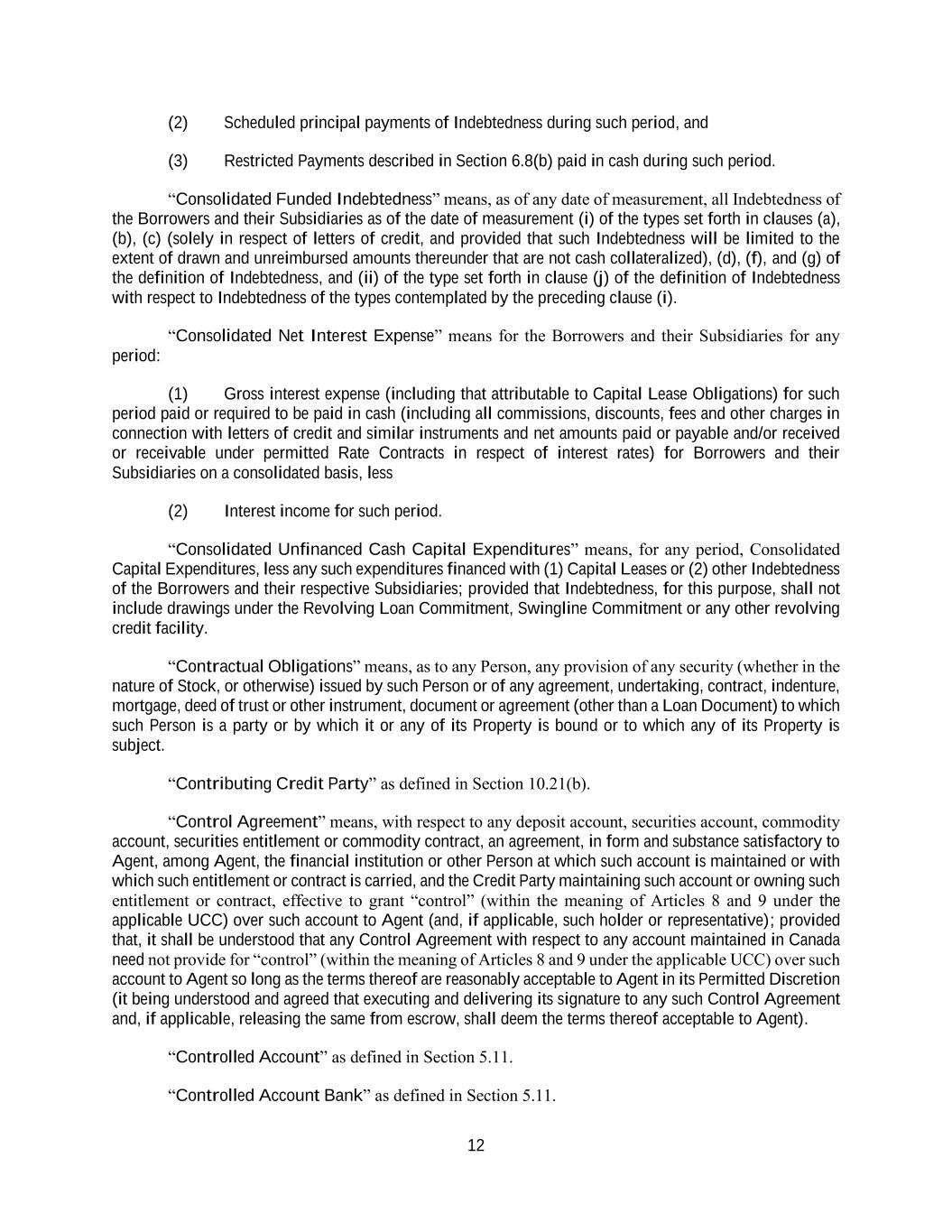 12 (2) Scheduled principal payments of Indebtedness during such period, and (3) Restricted Payments described in Section 6.8(b) paid in cash during such period. “Consolidated Funded Indebtedness” means, as of any date of measurement, all Indebtedness of the Borrowers and their Subsidiaries as of the date of measurement (i) of the types set forth in clauses (a), (b), (c) (solely in respect of letters of credit, and provided that such Indebtedness will be limited to the extent of drawn and unreimbursed amounts thereunder that are not cash collateralized), (d), (f), and (g) of the definition of Indebtedness, and (ii) of the type set forth in clause (j) of the definition of Indebtedness with respect to Indebtedness of the types contemplated by the preceding clause (i). “Consolidated Net Interest Expense” means for the Borrowers and their Subsidiaries for any period: (1) Gross interest expense (including that attributable to Capital Lease Obligations) for such period paid or required to be paid in cash (including all commissions, discounts, fees and other charges in connection with letters of credit and similar instruments and net amounts paid or payable and/or received or receivable under permitted Rate Contracts in respect of interest rates) for Borrowers and their Subsidiaries on a consolidated basis, less (2) Interest income for such period. “Consolidated Unfinanced Cash Capital Expenditures” means, for any period, Consolidated Capital Expenditures, less any such expenditures financed with (1) Capital Leases or (2) other Indebtedness of the Borrowers and their respective Subsidiaries; provided that Indebtedness, for this purpose, shall not include drawings under the Revolving Loan Commitment, Swingline Commitment or any other revolving credit facility. “Contractual Obligations” means, as to any Person, any provision of any security (whether in the nature of Stock, or otherwise) issued by such Person or of any agreement, undertaking, contract, indenture, mortgage, deed of trust or other instrument, document or agreement (other than a Loan Document) to which such Person is a party or by which it or any of its Property is bound or to which any of its Property is subject. “Contributing Credit Party” as defined in Section 10.21(b). “Control Agreement” means, with respect to any deposit account, securities account, commodity account, securities entitlement or commodity contract, an agreement, in form and substance satisfactory to Agent, among Agent, the financial institution or other Person at which such account is maintained or with which such entitlement or contract is carried, and the Credit Party maintaining such account or owning such entitlement or contract, effective to grant “control” (within the meaning of Articles 8 and 9 under the applicable UCC) over such account to Agent (and, if applicable, such holder or representative); provided that, it shall be understood that any Control Agreement with respect to any account maintained in Canada need not provide for “control” (within the meaning of Articles 8 and 9 under the applicable UCC) over such account to Agent so long as the terms thereof are reasonably acceptable to Agent in its Permitted Discretion (it being understood and agreed that executing and delivering its signature to any such Control Agreement and, if applicable, releasing the same from escrow, shall deem the terms thereof acceptable to Agent). “Controlled Account” as defined in Section 5.11. “Controlled Account Bank” as defined in Section 5.11.