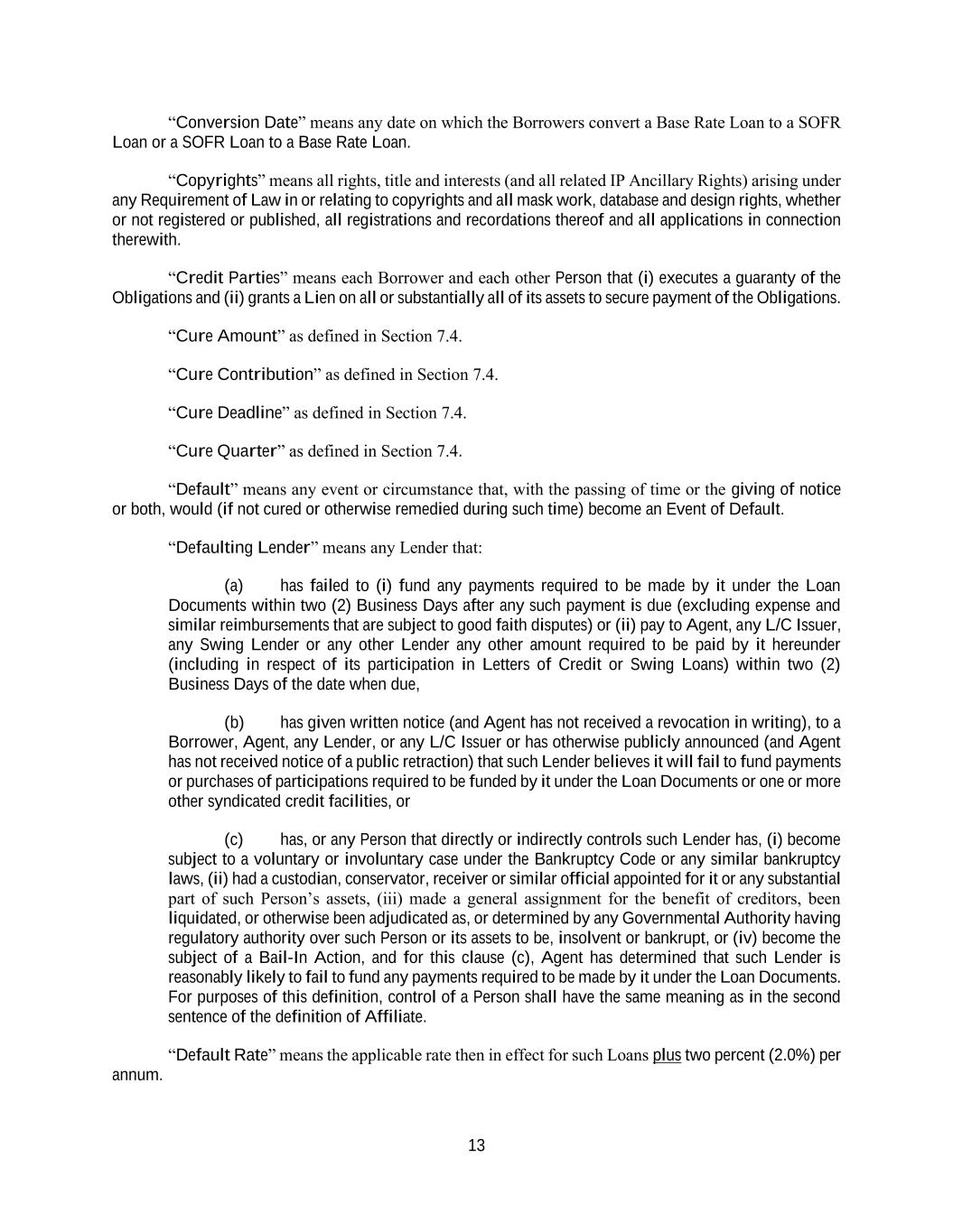 13 “Conversion Date” means any date on which the Borrowers convert a Base Rate Loan to a SOFR Loan or a SOFR Loan to a Base Rate Loan. “Copyrights” means all rights, title and interests (and all related IP Ancillary Rights) arising under any Requirement of Law in or relating to copyrights and all mask work, database and design rights, whether or not registered or published, all registrations and recordations thereof and all applications in connection therewith. “Credit Parties” means each Borrower and each other Person that (i) executes a guaranty of the Obligations and (ii) grants a Lien on all or substantially all of its assets to secure payment of the Obligations. “Cure Amount” as defined in Section 7.4. “Cure Contribution” as defined in Section 7.4. “Cure Deadline” as defined in Section 7.4. “Cure Quarter” as defined in Section 7.4. “Default” means any event or circumstance that, with the passing of time or the giving of notice or both, would (if not cured or otherwise remedied during such time) become an Event of Default. “Defaulting Lender” means any Lender that: (a) has failed to (i) fund any payments required to be made by it under the Loan Documents within two (2) Business Days after any such payment is due (excluding expense and similar reimbursements that are subject to good faith disputes) or (ii) pay to Agent, any L/C Issuer, any Swing Lender or any other Lender any other amount required to be paid by it hereunder (including in respect of its participation in Letters of Credit or Swing Loans) within two (2) Business Days of the date when due, (b) has given written notice (and Agent has not received a revocation in writing), to a Borrower, Agent, any Lender, or any L/C Issuer or has otherwise publicly announced (and Agent has not received notice of a public retraction) that such Lender believes it will fail to fund payments or purchases of participations required to be funded by it under the Loan Documents or one or more other syndicated credit facilities, or (c) has, or any Person that directly or indirectly controls such Lender has, (i) become subject to a voluntary or involuntary case under the Bankruptcy Code or any similar bankruptcy laws, (ii) had a custodian, conservator, receiver or similar official appointed for it or any substantial part of such Person’s assets, (iii) made a general assignment for the benefit of creditors, been liquidated, or otherwise been adjudicated as, or determined by any Governmental Authority having regulatory authority over such Person or its assets to be, insolvent or bankrupt, or (iv) become the subject of a Bail-In Action, and for this clause (c), Agent has determined that such Lender is reasonably likely to fail to fund any payments required to be made by it under the Loan Documents. For purposes of this definition, control of a Person shall have the same meaning as in the second sentence of the definition of Affiliate. “Default Rate” means the applicable rate then in effect for such Loans plus two percent (2.0%) per annum.