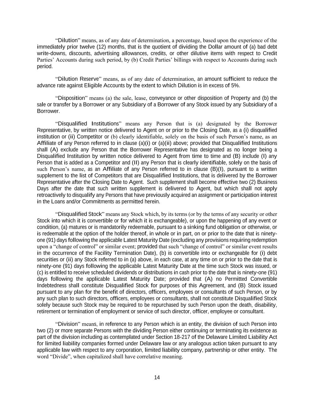 14 “Dilution” means, as of any date of determination, a percentage, based upon the experience of the immediately prior twelve (12) months, that is the quotient of dividing the Dollar amount of (a) bad debt write-downs, discounts, advertising allowances, credits, or other dilutive items with respect to Credit Parties’ Accounts during such period, by (b) Credit Parties’ billings with respect to Accounts during such period. “Dilution Reserve” means, as of any date of determination, an amount sufficient to reduce the advance rate against Eligible Accounts by the extent to which Dilution is in excess of 5%. “Disposition” means (a) the sale, lease, conveyance or other disposition of Property and (b) the sale or transfer by a Borrower or any Subsidiary of a Borrower of any Stock issued by any Subsidiary of a Borrower. “Disqualified Institutions” means any Person that is (a) designated by the Borrower Representative, by written notice delivered to Agent on or prior to the Closing Date, as a (i) disqualified institution or (ii) Competitor or (b) clearly identifiable, solely on the basis of such Person’s name, as an Affiliate of any Person referred to in clause (a)(i) or (a)(ii) above; provided that Disqualified Institutions shall (A) exclude any Person that the Borrower Representative has designated as no longer being a Disqualified Institution by written notice delivered to Agent from time to time and (B) include (I) any Person that is added as a Competitor and (II) any Person that is clearly identifiable, solely on the basis of such Person’s name, as an Affiliate of any Person referred to in clause (B)(I), pursuant to a written supplement to the list of Competitors that are Disqualified Institutions, that is delivered by the Borrower Representative after the Closing Date to Agent. Such supplement shall become effective two (2) Business Days after the date that such written supplement is delivered to Agent, but which shall not apply retroactively to disqualify any Persons that have previously acquired an assignment or participation interest in the Loans and/or Commitments as permitted herein. “Disqualified Stock” means any Stock which, by its terms (or by the terms of any security or other Stock into which it is convertible or for which it is exchangeable), or upon the happening of any event or condition, (a) matures or is mandatorily redeemable, pursuant to a sinking fund obligation or otherwise, or is redeemable at the option of the holder thereof, in whole or in part, on or prior to the date that is ninety- one (91) days following the applicable Latest Maturity Date (excluding any provisions requiring redemption upon a “change of control” or similar event; provided that such “change of control” or similar event results in the occurrence of the Facility Termination Date), (b) is convertible into or exchangeable for (i) debt securities or (ii) any Stock referred to in (a) above, in each case, at any time on or prior to the date that is ninety-one (91) days following the applicable Latest Maturity Date at the time such Stock was issued, or (c) is entitled to receive scheduled dividends or distributions in cash prior to the date that is ninety-one (91) days following the applicable Latest Maturity Date; provided that (A) no Permitted Convertible Indebtedness shall constitute Disqualified Stock for purposes of this Agreement, and (B) Stock issued pursuant to any plan for the benefit of directors, officers, employees or consultants of such Person, or by any such plan to such directors, officers, employees or consultants, shall not constitute Disqualified Stock solely because such Stock may be required to be repurchased by such Person upon the death, disability, retirement or termination of employment or service of such director, officer, employee or consultant. “Division” means, in reference to any Person which is an entity, the division of such Person into two (2) or more separate Persons with the dividing Person either continuing or terminating its existence as part of the division including as contemplated under Section 18-217 of the Delaware Limited Liability Act for limited liability companies formed under Delaware law or any analogous action taken pursuant to any applicable law with respect to any corporation, limited liability company, partnership or other entity. The word “Divide”, when capitalized shall have correlative meaning.