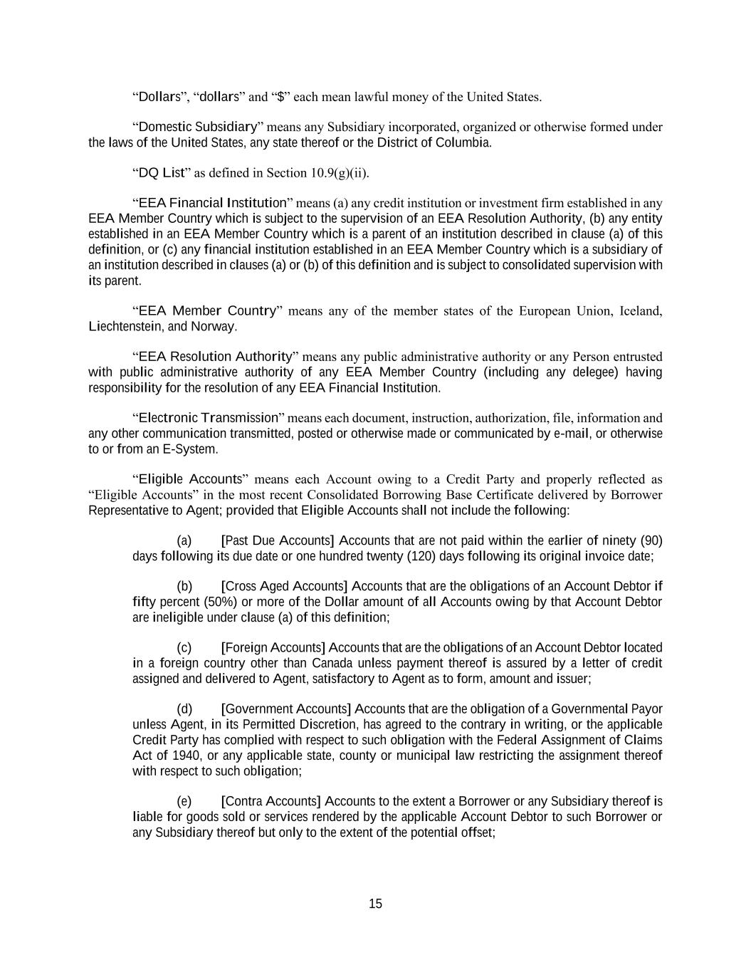 15 “Dollars”, “dollars” and “$” each mean lawful money of the United States. “Domestic Subsidiary” means any Subsidiary incorporated, organized or otherwise formed under the laws of the United States, any state thereof or the District of Columbia. “DQ List” as defined in Section 10.9(g)(ii). “EEA Financial Institution” means (a) any credit institution or investment firm established in any EEA Member Country which is subject to the supervision of an EEA Resolution Authority, (b) any entity established in an EEA Member Country which is a parent of an institution described in clause (a) of this definition, or (c) any financial institution established in an EEA Member Country which is a subsidiary of an institution described in clauses (a) or (b) of this definition and is subject to consolidated supervision with its parent. “EEA Member Country” means any of the member states of the European Union, Iceland, Liechtenstein, and Norway. “EEA Resolution Authority” means any public administrative authority or any Person entrusted with public administrative authority of any EEA Member Country (including any delegee) having responsibility for the resolution of any EEA Financial Institution. “Electronic Transmission” means each document, instruction, authorization, file, information and any other communication transmitted, posted or otherwise made or communicated by e-mail, or otherwise to or from an E-System. “Eligible Accounts” means each Account owing to a Credit Party and properly reflected as “Eligible Accounts” in the most recent Consolidated Borrowing Base Certificate delivered by Borrower Representative to Agent; provided that Eligible Accounts shall not include the following: (a) [Past Due Accounts] Accounts that are not paid within the earlier of ninety (90) days following its due date or one hundred twenty (120) days following its original invoice date; (b) [Cross Aged Accounts] Accounts that are the obligations of an Account Debtor if fifty percent (50%) or more of the Dollar amount of all Accounts owing by that Account Debtor are ineligible under clause (a) of this definition; (c) [Foreign Accounts] Accounts that are the obligations of an Account Debtor located in a foreign country other than Canada unless payment thereof is assured by a letter of credit assigned and delivered to Agent, satisfactory to Agent as to form, amount and issuer; (d) [Government Accounts] Accounts that are the obligation of a Governmental Payor unless Agent, in its Permitted Discretion, has agreed to the contrary in writing, or the applicable Credit Party has complied with respect to such obligation with the Federal Assignment of Claims Act of 1940, or any applicable state, county or municipal law restricting the assignment thereof with respect to such obligation; (e) [Contra Accounts] Accounts to the extent a Borrower or any Subsidiary thereof is liable for goods sold or services rendered by the applicable Account Debtor to such Borrower or any Subsidiary thereof but only to the extent of the potential offset;