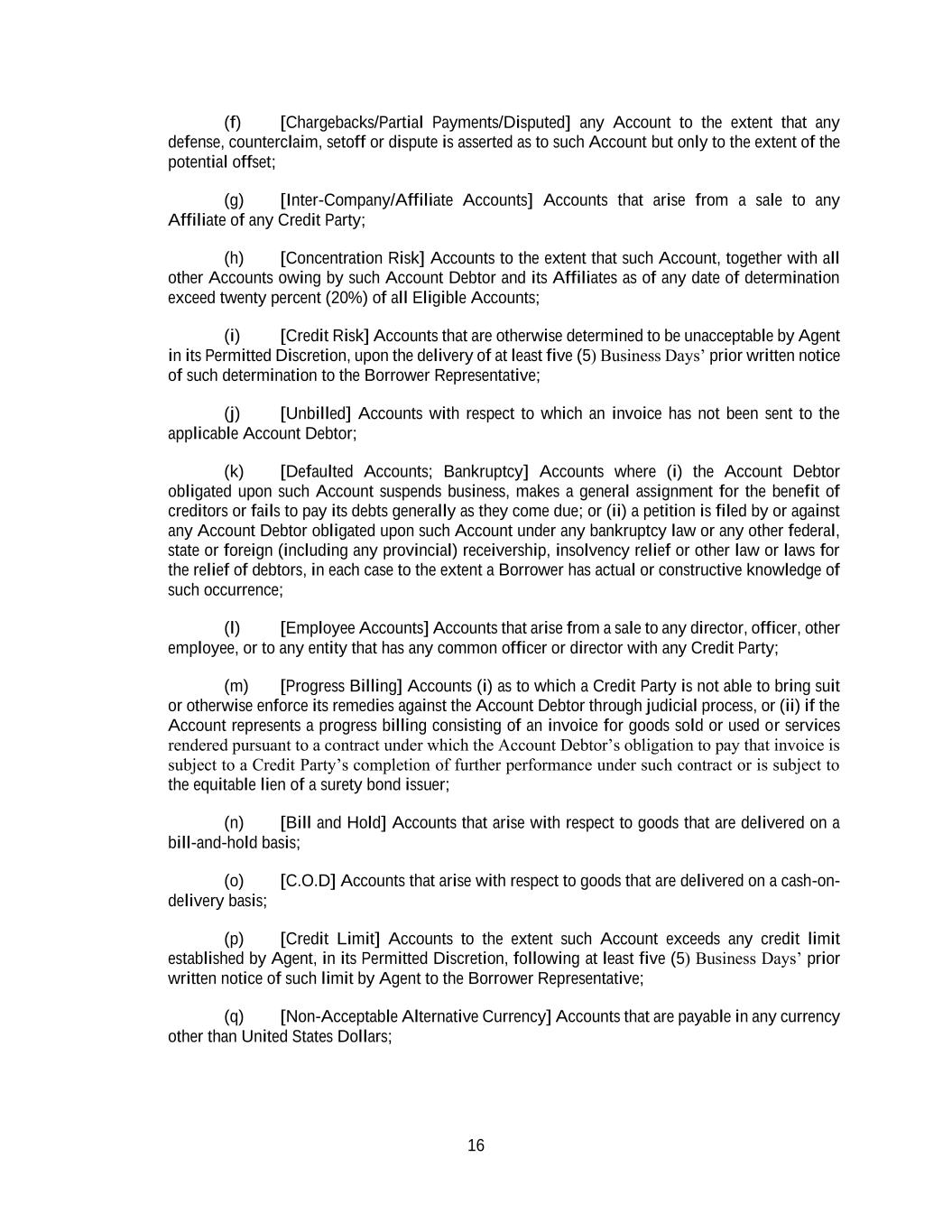 16 (f) [Chargebacks/Partial Payments/Disputed] any Account to the extent that any defense, counterclaim, setoff or dispute is asserted as to such Account but only to the extent of the potential offset; (g) [Inter-Company/Affiliate Accounts] Accounts that arise from a sale to any Affiliate of any Credit Party; (h) [Concentration Risk] Accounts to the extent that such Account, together with all other Accounts owing by such Account Debtor and its Affiliates as of any date of determination exceed twenty percent (20%) of all Eligible Accounts; (i) [Credit Risk] Accounts that are otherwise determined to be unacceptable by Agent in its Permitted Discretion, upon the delivery of at least five (5) Business Days’ prior written notice of such determination to the Borrower Representative; (j) [Unbilled] Accounts with respect to which an invoice has not been sent to the applicable Account Debtor; (k) [Defaulted Accounts; Bankruptcy] Accounts where (i) the Account Debtor obligated upon such Account suspends business, makes a general assignment for the benefit of creditors or fails to pay its debts generally as they come due; or (ii) a petition is filed by or against any Account Debtor obligated upon such Account under any bankruptcy law or any other federal, state or foreign (including any provincial) receivership, insolvency relief or other law or laws for the relief of debtors, in each case to the extent a Borrower has actual or constructive knowledge of such occurrence; (l) [Employee Accounts] Accounts that arise from a sale to any director, officer, other employee, or to any entity that has any common officer or director with any Credit Party; (m) [Progress Billing] Accounts (i) as to which a Credit Party is not able to bring suit or otherwise enforce its remedies against the Account Debtor through judicial process, or (ii) if the Account represents a progress billing consisting of an invoice for goods sold or used or services rendered pursuant to a contract under which the Account Debtor’s obligation to pay that invoice is subject to a Credit Party’s completion of further performance under such contract or is subject to the equitable lien of a surety bond issuer; (n) [Bill and Hold] Accounts that arise with respect to goods that are delivered on a bill-and-hold basis; (o) [C.O.D] Accounts that arise with respect to goods that are delivered on a cash-on- delivery basis; (p) [Credit Limit] Accounts to the extent such Account exceeds any credit limit established by Agent, in its Permitted Discretion, following at least five (5) Business Days’ prior written notice of such limit by Agent to the Borrower Representative; (q) [Non-Acceptable Alternative Currency] Accounts that are payable in any currency other than United States Dollars;