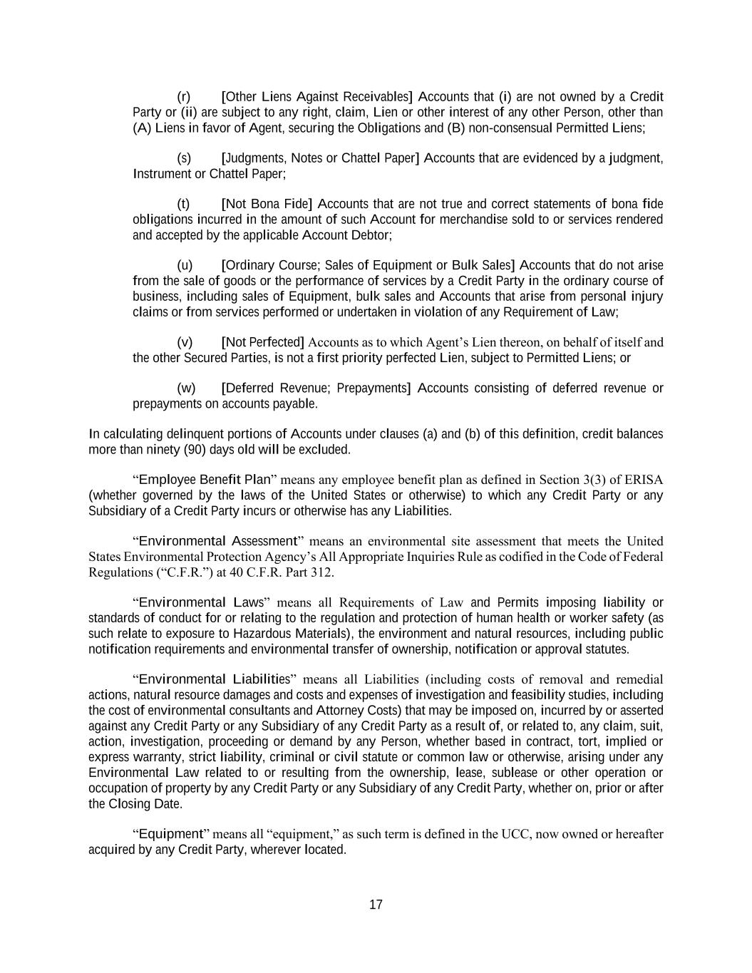 17 (r) [Other Liens Against Receivables] Accounts that (i) are not owned by a Credit Party or (ii) are subject to any right, claim, Lien or other interest of any other Person, other than (A) Liens in favor of Agent, securing the Obligations and (B) non-consensual Permitted Liens; (s) [Judgments, Notes or Chattel Paper] Accounts that are evidenced by a judgment, Instrument or Chattel Paper; (t) [Not Bona Fide] Accounts that are not true and correct statements of bona fide obligations incurred in the amount of such Account for merchandise sold to or services rendered and accepted by the applicable Account Debtor; (u) [Ordinary Course; Sales of Equipment or Bulk Sales] Accounts that do not arise from the sale of goods or the performance of services by a Credit Party in the ordinary course of business, including sales of Equipment, bulk sales and Accounts that arise from personal injury claims or from services performed or undertaken in violation of any Requirement of Law; (v) [Not Perfected] Accounts as to which Agent’s Lien thereon, on behalf of itself and the other Secured Parties, is not a first priority perfected Lien, subject to Permitted Liens; or (w) [Deferred Revenue; Prepayments] Accounts consisting of deferred revenue or prepayments on accounts payable. In calculating delinquent portions of Accounts under clauses (a) and (b) of this definition, credit balances more than ninety (90) days old will be excluded. “Employee Benefit Plan” means any employee benefit plan as defined in Section 3(3) of ERISA (whether governed by the laws of the United States or otherwise) to which any Credit Party or any Subsidiary of a Credit Party incurs or otherwise has any Liabilities. “Environmental Assessment” means an environmental site assessment that meets the United States Environmental Protection Agency’s All Appropriate Inquiries Rule as codified in the Code of Federal Regulations (“C.F.R.”) at 40 C.F.R. Part 312. “Environmental Laws” means all Requirements of Law and Permits imposing liability or standards of conduct for or relating to the regulation and protection of human health or worker safety (as such relate to exposure to Hazardous Materials), the environment and natural resources, including public notification requirements and environmental transfer of ownership, notification or approval statutes. “Environmental Liabilities” means all Liabilities (including costs of removal and remedial actions, natural resource damages and costs and expenses of investigation and feasibility studies, including the cost of environmental consultants and Attorney Costs) that may be imposed on, incurred by or asserted against any Credit Party or any Subsidiary of any Credit Party as a result of, or related to, any claim, suit, action, investigation, proceeding or demand by any Person, whether based in contract, tort, implied or express warranty, strict liability, criminal or civil statute or common law or otherwise, arising under any Environmental Law related to or resulting from the ownership, lease, sublease or other operation or occupation of property by any Credit Party or any Subsidiary of any Credit Party, whether on, prior or after the Closing Date. “Equipment” means all “equipment,” as such term is defined in the UCC, now owned or hereafter acquired by any Credit Party, wherever located.
