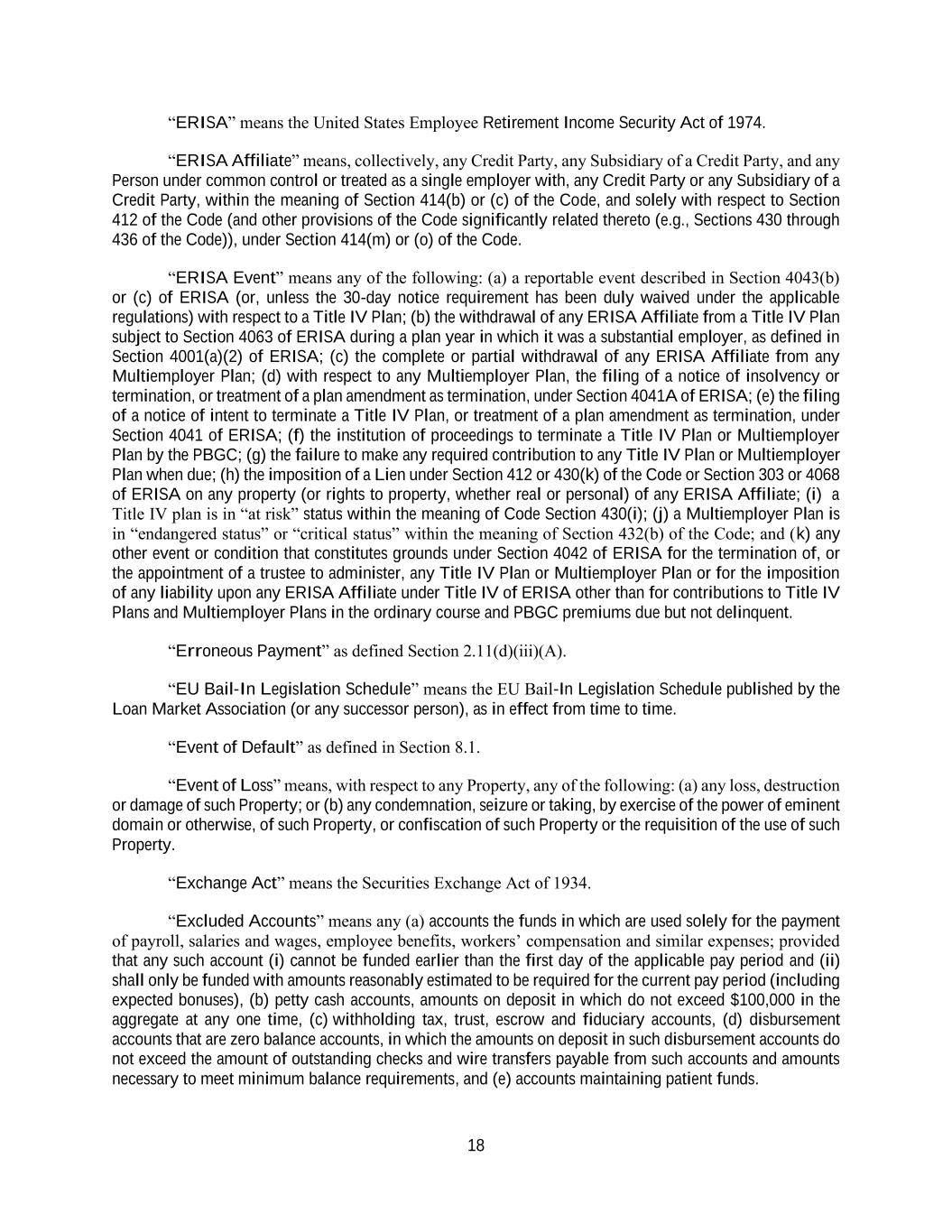 18 “ERISA” means the United States Employee Retirement Income Security Act of 1974. “ERISA Affiliate” means, collectively, any Credit Party, any Subsidiary of a Credit Party, and any Person under common control or treated as a single employer with, any Credit Party or any Subsidiary of a Credit Party, within the meaning of Section 414(b) or (c) of the Code, and solely with respect to Section 412 of the Code (and other provisions of the Code significantly related thereto (e.g., Sections 430 through 436 of the Code)), under Section 414(m) or (o) of the Code. “ERISA Event” means any of the following: (a) a reportable event described in Section 4043(b) or (c) of ERISA (or, unless the 30-day notice requirement has been duly waived under the applicable regulations) with respect to a Title IV Plan; (b) the withdrawal of any ERISA Affiliate from a Title IV Plan subject to Section 4063 of ERISA during a plan year in which it was a substantial employer, as defined in Section 4001(a)(2) of ERISA; (c) the complete or partial withdrawal of any ERISA Affiliate from any Multiemployer Plan; (d) with respect to any Multiemployer Plan, the filing of a notice of insolvency or termination, or treatment of a plan amendment as termination, under Section 4041A of ERISA; (e) the filing of a notice of intent to terminate a Title IV Plan, or treatment of a plan amendment as termination, under Section 4041 of ERISA; (f) the institution of proceedings to terminate a Title IV Plan or Multiemployer Plan by the PBGC; (g) the failure to make any required contribution to any Title IV Plan or Multiemployer Plan when due; (h) the imposition of a Lien under Section 412 or 430(k) of the Code or Section 303 or 4068 of ERISA on any property (or rights to property, whether real or personal) of any ERISA Affiliate; (i) a Title IV plan is in “at risk” status within the meaning of Code Section 430(i); (j) a Multiemployer Plan is in “endangered status” or “critical status” within the meaning of Section 432(b) of the Code; and (k) any other event or condition that constitutes grounds under Section 4042 of ERISA for the termination of, or the appointment of a trustee to administer, any Title IV Plan or Multiemployer Plan or for the imposition of any liability upon any ERISA Affiliate under Title IV of ERISA other than for contributions to Title IV Plans and Multiemployer Plans in the ordinary course and PBGC premiums due but not delinquent. “Erroneous Payment” as defined Section 2.11(d)(iii)(A). “EU Bail-In Legislation Schedule” means the EU Bail-In Legislation Schedule published by the Loan Market Association (or any successor person), as in effect from time to time. “Event of Default” as defined in Section 8.1. “Event of Loss” means, with respect to any Property, any of the following: (a) any loss, destruction or damage of such Property; or (b) any condemnation, seizure or taking, by exercise of the power of eminent domain or otherwise, of such Property, or confiscation of such Property or the requisition of the use of such Property. “Exchange Act” means the Securities Exchange Act of 1934. “Excluded Accounts” means any (a) accounts the funds in which are used solely for the payment of payroll, salaries and wages, employee benefits, workers’ compensation and similar expenses; provided that any such account (i) cannot be funded earlier than the first day of the applicable pay period and (ii) shall only be funded with amounts reasonably estimated to be required for the current pay period (including expected bonuses), (b) petty cash accounts, amounts on deposit in which do not exceed $100,000 in the aggregate at any one time, (c) withholding tax, trust, escrow and fiduciary accounts, (d) disbursement accounts that are zero balance accounts, in which the amounts on deposit in such disbursement accounts do not exceed the amount of outstanding checks and wire transfers payable from such accounts and amounts necessary to meet minimum balance requirements, and (e) accounts maintaining patient funds.