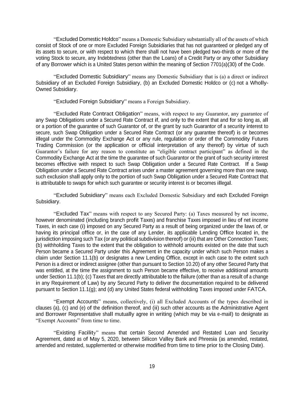 19 “Excluded Domestic Holdco” means a Domestic Subsidiary substantially all of the assets of which consist of Stock of one or more Excluded Foreign Subsidiaries that has not guaranteed or pledged any of its assets to secure, or with respect to which there shall not have been pledged two-thirds or more of the voting Stock to secure, any Indebtedness (other than the Loans) of a Credit Party or any other Subsidiary of any Borrower which is a United States person within the meaning of Section 7701(a)(30) of the Code. “Excluded Domestic Subsidiary” means any Domestic Subsidiary that is (a) a direct or indirect Subsidiary of an Excluded Foreign Subsidiary, (b) an Excluded Domestic Holdco or (c) not a Wholly- Owned Subsidiary. “Excluded Foreign Subsidiary” means a Foreign Subsidiary. “Excluded Rate Contract Obligation” means, with respect to any Guarantor, any guarantee of any Swap Obligations under a Secured Rate Contract if, and only to the extent that and for so long as, all or a portion of the guarantee of such Guarantor of, or the grant by such Guarantor of a security interest to secure, such Swap Obligation under a Secured Rate Contract (or any guarantee thereof) is or becomes illegal under the Commodity Exchange Act or any rule, regulation or order of the Commodity Futures Trading Commission (or the application or official interpretation of any thereof) by virtue of such Guarantor’s failure for any reason to constitute an “eligible contract participant” as defined in the Commodity Exchange Act at the time the guarantee of such Guarantor or the grant of such security interest becomes effective with respect to such Swap Obligation under a Secured Rate Contract. If a Swap Obligation under a Secured Rate Contract arises under a master agreement governing more than one swap, such exclusion shall apply only to the portion of such Swap Obligation under a Secured Rate Contract that is attributable to swaps for which such guarantee or security interest is or becomes illegal. “Excluded Subsidiary” means each Excluded Domestic Subsidiary and each Excluded Foreign Subsidiary. “Excluded Tax” means with respect to any Secured Party: (a) Taxes measured by net income, however denominated (including branch profit Taxes) and franchise Taxes imposed in lieu of net income Taxes, in each case (i) imposed on any Secured Party as a result of being organized under the laws of, or having its principal office or, in the case of any Lender, its applicable Lending Office located in, the jurisdiction imposing such Tax (or any political subdivision thereof) or (ii) that are Other Connection Taxes; (b) withholding Taxes to the extent that the obligation to withhold amounts existed on the date that such Person became a Secured Party under this Agreement in the capacity under which such Person makes a claim under Section 11.1(b) or designates a new Lending Office, except in each case to the extent such Person is a direct or indirect assignee (other than pursuant to Section 10.20) of any other Secured Party that was entitled, at the time the assignment to such Person became effective, to receive additional amounts under Section 11.1(b); (c) Taxes that are directly attributable to the failure (other than as a result of a change in any Requirement of Law) by any Secured Party to deliver the documentation required to be delivered pursuant to Section 11.1(g); and (d) any United States federal withholding Taxes imposed under FATCA. “Exempt Accounts” means, collectively, (i) all Excluded Accounts of the types described in clauses (a), (c) and (e) of the definition thereof, and (ii) such other accounts as the Administrative Agent and Borrower Representative shall mutually agree in writing (which may be via e-mail) to designate as “Exempt Accounts” from time to time. “Existing Facility” means that certain Second Amended and Restated Loan and Security Agreement, dated as of May 5, 2020, between Silicon Valley Bank and Phreesia (as amended, restated, amended and restated, supplemented or otherwise modified from time to time prior to the Closing Date).