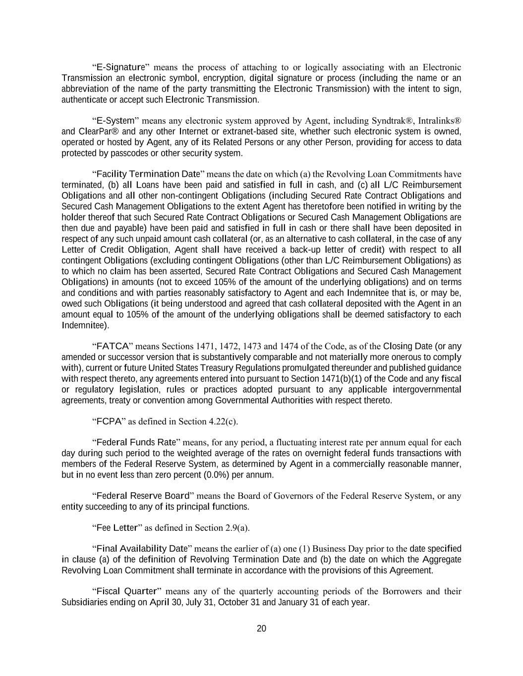 20 “E-Signature” means the process of attaching to or logically associating with an Electronic Transmission an electronic symbol, encryption, digital signature or process (including the name or an abbreviation of the name of the party transmitting the Electronic Transmission) with the intent to sign, authenticate or accept such Electronic Transmission. “E-System” means any electronic system approved by Agent, including Syndtrak®, Intralinks® and ClearPar® and any other Internet or extranet-based site, whether such electronic system is owned, operated or hosted by Agent, any of its Related Persons or any other Person, providing for access to data protected by passcodes or other security system. “Facility Termination Date” means the date on which (a) the Revolving Loan Commitments have terminated, (b) all Loans have been paid and satisfied in full in cash, and (c) all L/C Reimbursement Obligations and all other non-contingent Obligations (including Secured Rate Contract Obligations and Secured Cash Management Obligations to the extent Agent has theretofore been notified in writing by the holder thereof that such Secured Rate Contract Obligations or Secured Cash Management Obligations are then due and payable) have been paid and satisfied in full in cash or there shall have been deposited in respect of any such unpaid amount cash collateral (or, as an alternative to cash collateral, in the case of any Letter of Credit Obligation, Agent shall have received a back-up letter of credit) with respect to all contingent Obligations (excluding contingent Obligations (other than L/C Reimbursement Obligations) as to which no claim has been asserted, Secured Rate Contract Obligations and Secured Cash Management Obligations) in amounts (not to exceed 105% of the amount of the underlying obligations) and on terms and conditions and with parties reasonably satisfactory to Agent and each Indemnitee that is, or may be, owed such Obligations (it being understood and agreed that cash collateral deposited with the Agent in an amount equal to 105% of the amount of the underlying obligations shall be deemed satisfactory to each Indemnitee). “FATCA” means Sections 1471, 1472, 1473 and 1474 of the Code, as of the Closing Date (or any amended or successor version that is substantively comparable and not materially more onerous to comply with), current or future United States Treasury Regulations promulgated thereunder and published guidance with respect thereto, any agreements entered into pursuant to Section 1471(b)(1) of the Code and any fiscal or regulatory legislation, rules or practices adopted pursuant to any applicable intergovernmental agreements, treaty or convention among Governmental Authorities with respect thereto. “FCPA” as defined in Section 4.22(c). “Federal Funds Rate” means, for any period, a fluctuating interest rate per annum equal for each day during such period to the weighted average of the rates on overnight federal funds transactions with members of the Federal Reserve System, as determined by Agent in a commercially reasonable manner, but in no event less than zero percent (0.0%) per annum. “Federal Reserve Board” means the Board of Governors of the Federal Reserve System, or any entity succeeding to any of its principal functions. “Fee Letter” as defined in Section 2.9(a). “Final Availability Date” means the earlier of (a) one (1) Business Day prior to the date specified in clause (a) of the definition of Revolving Termination Date and (b) the date on which the Aggregate Revolving Loan Commitment shall terminate in accordance with the provisions of this Agreement. “Fiscal Quarter” means any of the quarterly accounting periods of the Borrowers and their Subsidiaries ending on April 30, July 31, October 31 and January 31 of each year.