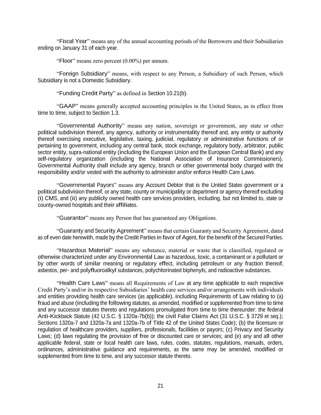 21 “Fiscal Year” means any of the annual accounting periods of the Borrowers and their Subsidiaries ending on January 31 of each year. “Floor” means zero percent (0.00%) per annum. “Foreign Subsidiary” means, with respect to any Person, a Subsidiary of such Person, which Subsidiary is not a Domestic Subsidiary. “Funding Credit Party” as defined in Section 10.21(b). “GAAP” means generally accepted accounting principles in the United States, as in effect from time to time, subject to Section 1.3. “Governmental Authority” means any nation, sovereign or government, any state or other political subdivision thereof, any agency, authority or instrumentality thereof and, any entity or authority thereof exercising executive, legislative, taxing, judicial, regulatory or administrative functions of or pertaining to government, including any central bank, stock exchange, regulatory body, arbitrator, public sector entity, supra-national entity (including the European Union and the European Central Bank) and any self-regulatory organization (including the National Association of Insurance Commissioners). Governmental Authority shall include any agency, branch or other governmental body charged with the responsibility and/or vested with the authority to administer and/or enforce Health Care Laws. “Governmental Payors” means any Account Debtor that is the United States government or a political subdivision thereof, or any state, county or municipality or department or agency thereof excluding (i) CMS, and (ii) any publicly owned health care services providers, including, but not limited to, state or county-owned hospitals and their affiliates. “Guarantor” means any Person that has guaranteed any Obligations. “Guaranty and Security Agreement” means that certain Guaranty and Security Agreement, dated as of even date herewith, made by the Credit Parties in favor of Agent, for the benefit of the Secured Parties. “Hazardous Material” means any substance, material or waste that is classified, regulated or otherwise characterized under any Environmental Law as hazardous, toxic, a contaminant or a pollutant or by other words of similar meaning or regulatory effect, including petroleum or any fraction thereof, asbestos, per- and polyfluoroalkyl substances, polychlorinated biphenyls, and radioactive substances. “Health Care Laws” means all Requirements of Law at any time applicable to each respective Credit Party’s and/or its respective Subsidiaries’ health care services and/or arrangements with individuals and entities providing health care services (as applicable), including Requirements of Law relating to (a) fraud and abuse (including the following statutes, as amended, modified or supplemented from time to time and any successor statutes thereto and regulations promulgated from time to time thereunder: the federal Anti-Kickback Statute (42 U.S.C. § 1320a-7b(b)); the civil False Claims Act (31 U.S.C. § 3729 et seq.); Sections 1320a-7 and 1320a-7a and 1320a-7b of Title 42 of the United States Code); (b) the licensure or regulation of healthcare providers, suppliers, professionals, facilities or payors; (c) Privacy and Security Laws; (d) laws regulating the provision of free or discounted care or services; and (e) any and all other applicable federal, state or local health care laws, rules, codes, statutes, regulations, manuals, orders, ordinances, administrative guidance and requirements, as the same may be amended, modified or supplemented from time to time, and any successor statute thereto.