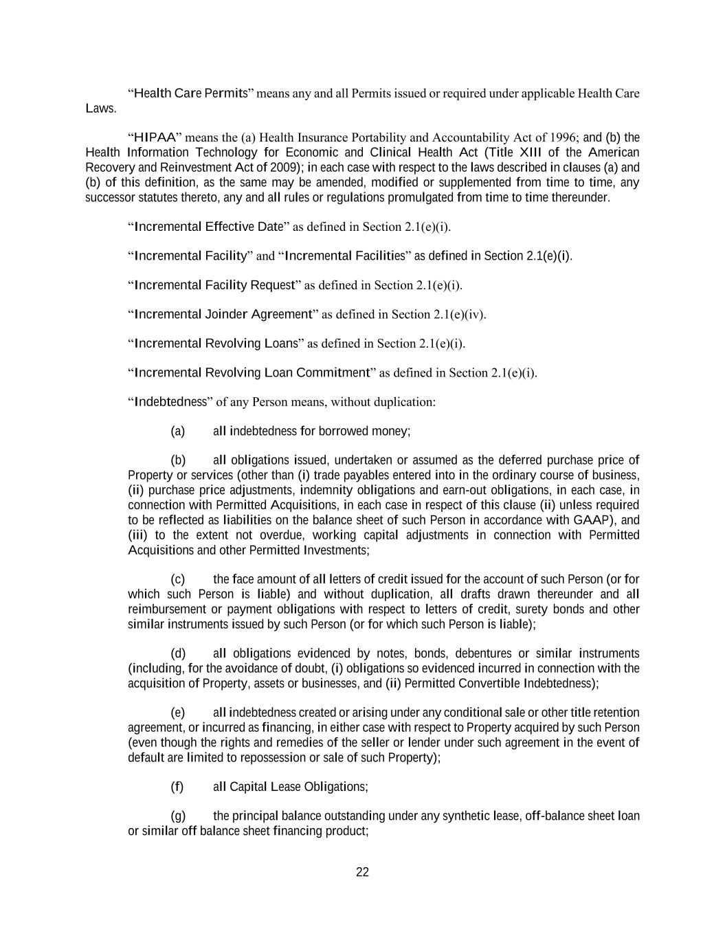 22 “Health Care Permits” means any and all Permits issued or required under applicable Health Care Laws. “HIPAA” means the (a) Health Insurance Portability and Accountability Act of 1996; and (b) the Health Information Technology for Economic and Clinical Health Act (Title XIII of the American Recovery and Reinvestment Act of 2009); in each case with respect to the laws described in clauses (a) and (b) of this definition, as the same may be amended, modified or supplemented from time to time, any successor statutes thereto, any and all rules or regulations promulgated from time to time thereunder. “Incremental Effective Date” as defined in Section 2.1(e)(i). “Incremental Facility” and “Incremental Facilities” as defined in Section 2.1(e)(i). “Incremental Facility Request” as defined in Section 2.1(e)(i). “Incremental Joinder Agreement” as defined in Section 2.1(e)(iv). “Incremental Revolving Loans” as defined in Section 2.1(e)(i). “Incremental Revolving Loan Commitment” as defined in Section 2.1(e)(i). “Indebtedness” of any Person means, without duplication: (a) all indebtedness for borrowed money; (b) all obligations issued, undertaken or assumed as the deferred purchase price of Property or services (other than (i) trade payables entered into in the ordinary course of business, (ii) purchase price adjustments, indemnity obligations and earn-out obligations, in each case, in connection with Permitted Acquisitions, in each case in respect of this clause (ii) unless required to be reflected as liabilities on the balance sheet of such Person in accordance with GAAP), and (iii) to the extent not overdue, working capital adjustments in connection with Permitted Acquisitions and other Permitted Investments; (c) the face amount of all letters of credit issued for the account of such Person (or for which such Person is liable) and without duplication, all drafts drawn thereunder and all reimbursement or payment obligations with respect to letters of credit, surety bonds and other similar instruments issued by such Person (or for which such Person is liable); (d) all obligations evidenced by notes, bonds, debentures or similar instruments (including, for the avoidance of doubt, (i) obligations so evidenced incurred in connection with the acquisition of Property, assets or businesses, and (ii) Permitted Convertible Indebtedness); (e) all indebtedness created or arising under any conditional sale or other title retention agreement, or incurred as financing, in either case with respect to Property acquired by such Person (even though the rights and remedies of the seller or lender under such agreement in the event of default are limited to repossession or sale of such Property); (f) all Capital Lease Obligations; (g) the principal balance outstanding under any synthetic lease, off-balance sheet loan or similar off balance sheet financing product;
