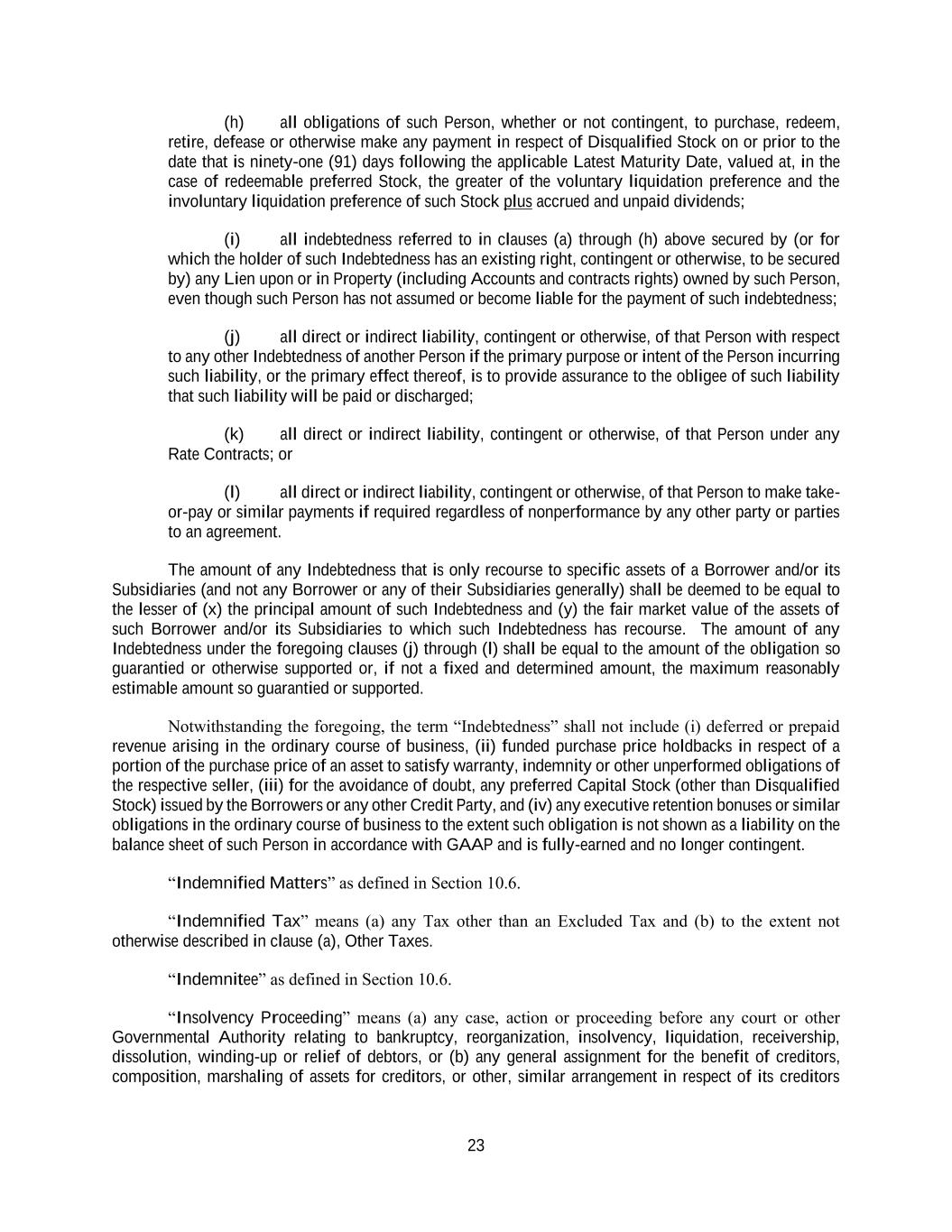 23 (h) all obligations of such Person, whether or not contingent, to purchase, redeem, retire, defease or otherwise make any payment in respect of Disqualified Stock on or prior to the date that is ninety-one (91) days following the applicable Latest Maturity Date, valued at, in the case of redeemable preferred Stock, the greater of the voluntary liquidation preference and the involuntary liquidation preference of such Stock plus accrued and unpaid dividends; (i) all indebtedness referred to in clauses (a) through (h) above secured by (or for which the holder of such Indebtedness has an existing right, contingent or otherwise, to be secured by) any Lien upon or in Property (including Accounts and contracts rights) owned by such Person, even though such Person has not assumed or become liable for the payment of such indebtedness; (j) all direct or indirect liability, contingent or otherwise, of that Person with respect to any other Indebtedness of another Person if the primary purpose or intent of the Person incurring such liability, or the primary effect thereof, is to provide assurance to the obligee of such liability that such liability will be paid or discharged; (k) all direct or indirect liability, contingent or otherwise, of that Person under any Rate Contracts; or (l) all direct or indirect liability, contingent or otherwise, of that Person to make take- or-pay or similar payments if required regardless of nonperformance by any other party or parties to an agreement. The amount of any Indebtedness that is only recourse to specific assets of a Borrower and/or its Subsidiaries (and not any Borrower or any of their Subsidiaries generally) shall be deemed to be equal to the lesser of (x) the principal amount of such Indebtedness and (y) the fair market value of the assets of such Borrower and/or its Subsidiaries to which such Indebtedness has recourse. The amount of any Indebtedness under the foregoing clauses (j) through (l) shall be equal to the amount of the obligation so guarantied or otherwise supported or, if not a fixed and determined amount, the maximum reasonably estimable amount so guarantied or supported. Notwithstanding the foregoing, the term “Indebtedness” shall not include (i) deferred or prepaid revenue arising in the ordinary course of business, (ii) funded purchase price holdbacks in respect of a portion of the purchase price of an asset to satisfy warranty, indemnity or other unperformed obligations of the respective seller, (iii) for the avoidance of doubt, any preferred Capital Stock (other than Disqualified Stock) issued by the Borrowers or any other Credit Party, and (iv) any executive retention bonuses or similar obligations in the ordinary course of business to the extent such obligation is not shown as a liability on the balance sheet of such Person in accordance with GAAP and is fully-earned and no longer contingent. “Indemnified Matters” as defined in Section 10.6. “Indemnified Tax” means (a) any Tax other than an Excluded Tax and (b) to the extent not otherwise described in clause (a), Other Taxes. “Indemnitee” as defined in Section 10.6. “Insolvency Proceeding” means (a) any case, action or proceeding before any court or other Governmental Authority relating to bankruptcy, reorganization, insolvency, liquidation, receivership, dissolution, winding-up or relief of debtors, or (b) any general assignment for the benefit of creditors, composition, marshaling of assets for creditors, or other, similar arrangement in respect of its creditors