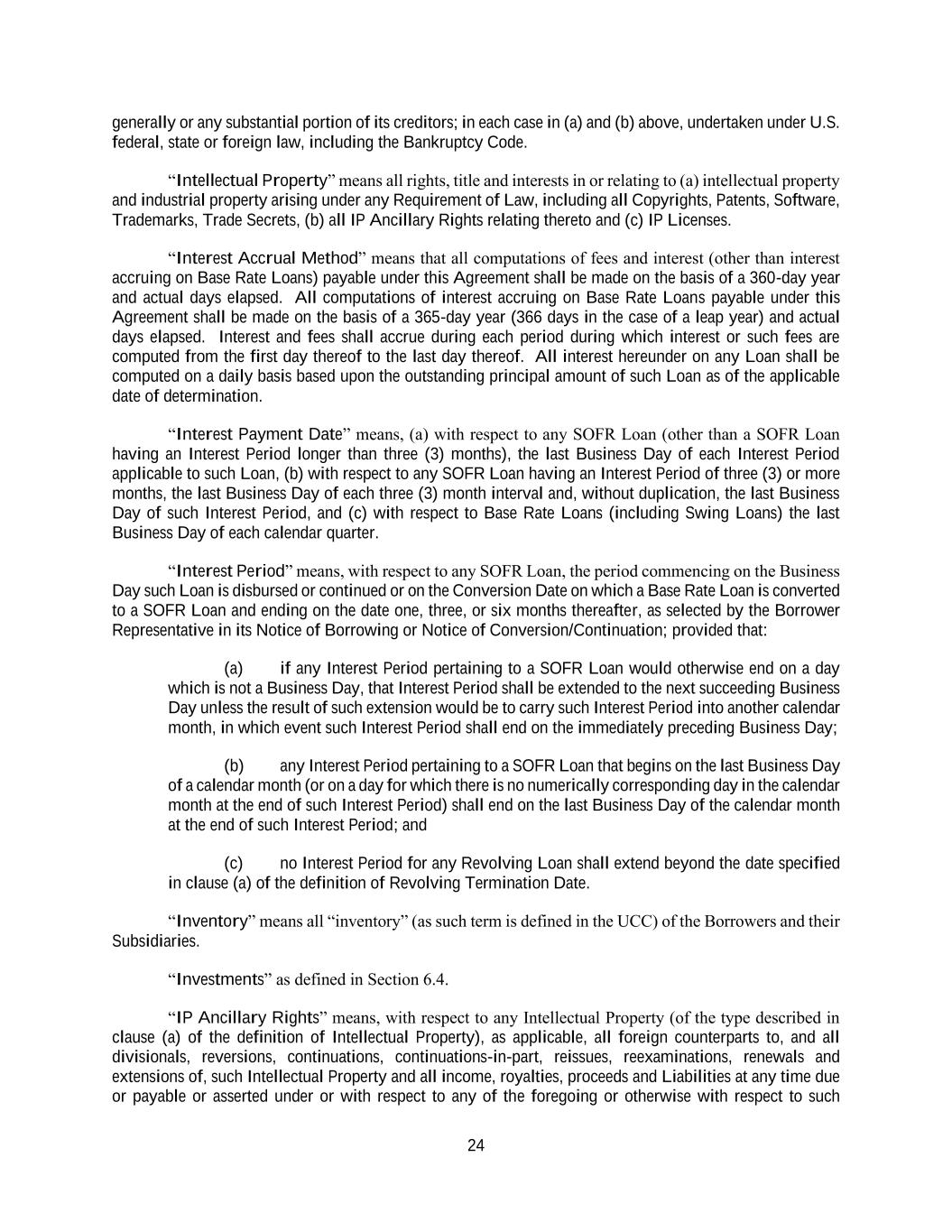 24 generally or any substantial portion of its creditors; in each case in (a) and (b) above, undertaken under U.S. federal, state or foreign law, including the Bankruptcy Code. “Intellectual Property” means all rights, title and interests in or relating to (a) intellectual property and industrial property arising under any Requirement of Law, including all Copyrights, Patents, Software, Trademarks, Trade Secrets, (b) all IP Ancillary Rights relating thereto and (c) IP Licenses. “Interest Accrual Method” means that all computations of fees and interest (other than interest accruing on Base Rate Loans) payable under this Agreement shall be made on the basis of a 360-day year and actual days elapsed. All computations of interest accruing on Base Rate Loans payable under this Agreement shall be made on the basis of a 365-day year (366 days in the case of a leap year) and actual days elapsed. Interest and fees shall accrue during each period during which interest or such fees are computed from the first day thereof to the last day thereof. All interest hereunder on any Loan shall be computed on a daily basis based upon the outstanding principal amount of such Loan as of the applicable date of determination. “Interest Payment Date” means, (a) with respect to any SOFR Loan (other than a SOFR Loan having an Interest Period longer than three (3) months), the last Business Day of each Interest Period applicable to such Loan, (b) with respect to any SOFR Loan having an Interest Period of three (3) or more months, the last Business Day of each three (3) month interval and, without duplication, the last Business Day of such Interest Period, and (c) with respect to Base Rate Loans (including Swing Loans) the last Business Day of each calendar quarter. “Interest Period” means, with respect to any SOFR Loan, the period commencing on the Business Day such Loan is disbursed or continued or on the Conversion Date on which a Base Rate Loan is converted to a SOFR Loan and ending on the date one, three, or six months thereafter, as selected by the Borrower Representative in its Notice of Borrowing or Notice of Conversion/Continuation; provided that: (a) if any Interest Period pertaining to a SOFR Loan would otherwise end on a day which is not a Business Day, that Interest Period shall be extended to the next succeeding Business Day unless the result of such extension would be to carry such Interest Period into another calendar month, in which event such Interest Period shall end on the immediately preceding Business Day; (b) any Interest Period pertaining to a SOFR Loan that begins on the last Business Day of a calendar month (or on a day for which there is no numerically corresponding day in the calendar month at the end of such Interest Period) shall end on the last Business Day of the calendar month at the end of such Interest Period; and (c) no Interest Period for any Revolving Loan shall extend beyond the date specified in clause (a) of the definition of Revolving Termination Date. “Inventory” means all “inventory” (as such term is defined in the UCC) of the Borrowers and their Subsidiaries. “Investments” as defined in Section 6.4. “IP Ancillary Rights” means, with respect to any Intellectual Property (of the type described in clause (a) of the definition of Intellectual Property), as applicable, all foreign counterparts to, and all divisionals, reversions, continuations, continuations-in-part, reissues, reexaminations, renewals and extensions of, such Intellectual Property and all income, royalties, proceeds and Liabilities at any time due or payable or asserted under or with respect to any of the foregoing or otherwise with respect to such