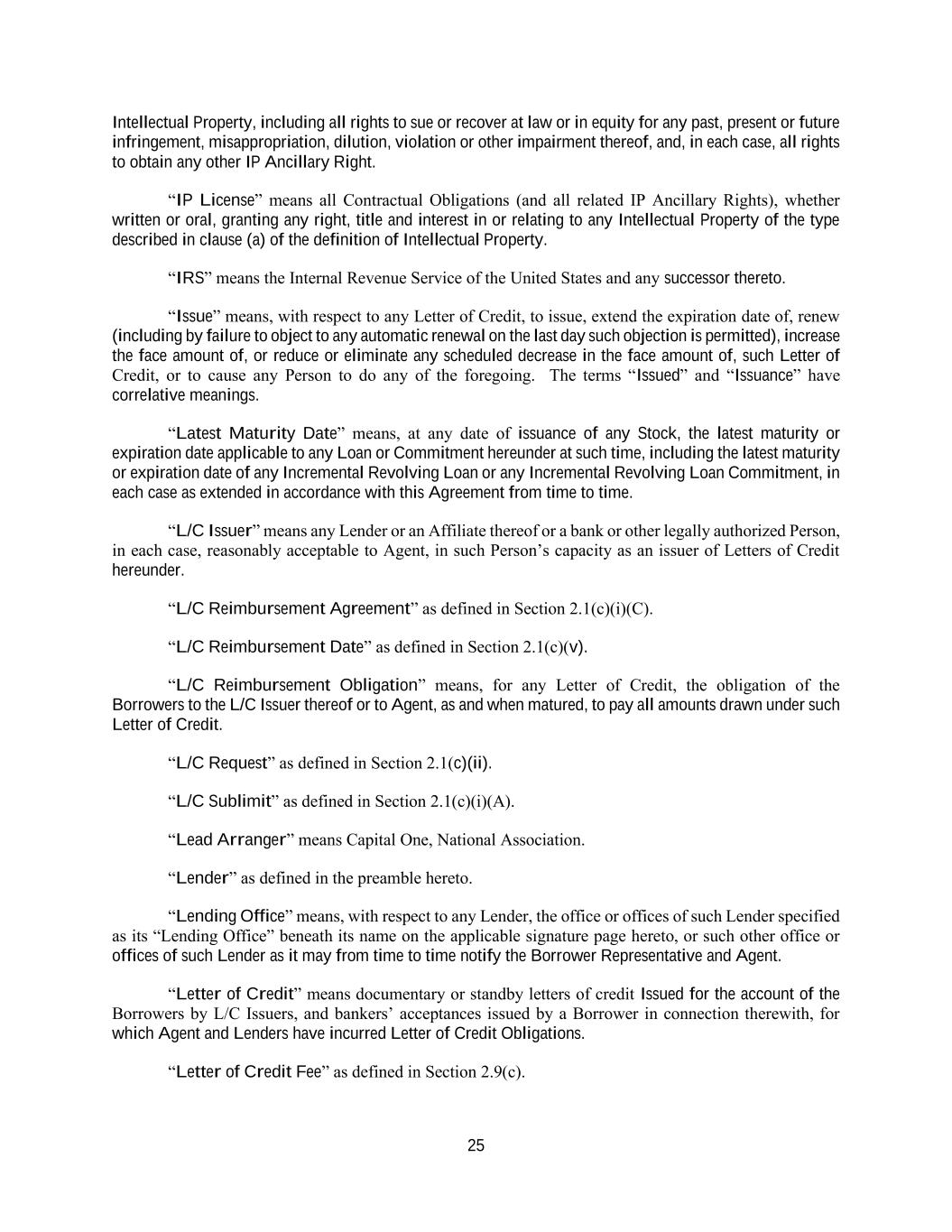 25 Intellectual Property, including all rights to sue or recover at law or in equity for any past, present or future infringement, misappropriation, dilution, violation or other impairment thereof, and, in each case, all rights to obtain any other IP Ancillary Right. “IP License” means all Contractual Obligations (and all related IP Ancillary Rights), whether written or oral, granting any right, title and interest in or relating to any Intellectual Property of the type described in clause (a) of the definition of Intellectual Property. “IRS” means the Internal Revenue Service of the United States and any successor thereto. “Issue” means, with respect to any Letter of Credit, to issue, extend the expiration date of, renew (including by failure to object to any automatic renewal on the last day such objection is permitted), increase the face amount of, or reduce or eliminate any scheduled decrease in the face amount of, such Letter of Credit, or to cause any Person to do any of the foregoing. The terms “Issued” and “Issuance” have correlative meanings. “Latest Maturity Date” means, at any date of issuance of any Stock, the latest maturity or expiration date applicable to any Loan or Commitment hereunder at such time, including the latest maturity or expiration date of any Incremental Revolving Loan or any Incremental Revolving Loan Commitment, in each case as extended in accordance with this Agreement from time to time. “L/C Issuer” means any Lender or an Affiliate thereof or a bank or other legally authorized Person, in each case, reasonably acceptable to Agent, in such Person’s capacity as an issuer of Letters of Credit hereunder. “L/C Reimbursement Agreement” as defined in Section 2.1(c)(i)(C). “L/C Reimbursement Date” as defined in Section 2.1(c)(v). “L/C Reimbursement Obligation” means, for any Letter of Credit, the obligation of the Borrowers to the L/C Issuer thereof or to Agent, as and when matured, to pay all amounts drawn under such Letter of Credit. “L/C Request” as defined in Section 2.1(c)(ii). “L/C Sublimit” as defined in Section 2.1(c)(i)(A). “Lead Arranger” means Capital One, National Association. “Lender” as defined in the preamble hereto. “Lending Office” means, with respect to any Lender, the office or offices of such Lender specified as its “Lending Office” beneath its name on the applicable signature page hereto, or such other office or offices of such Lender as it may from time to time notify the Borrower Representative and Agent. “Letter of Credit” means documentary or standby letters of credit Issued for the account of the Borrowers by L/C Issuers, and bankers’ acceptances issued by a Borrower in connection therewith, for which Agent and Lenders have incurred Letter of Credit Obligations. “Letter of Credit Fee” as defined in Section 2.9(c).