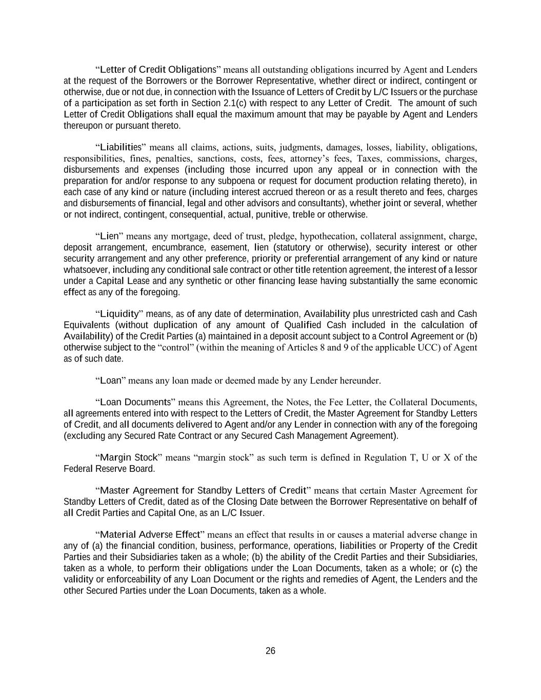 26 “Letter of Credit Obligations” means all outstanding obligations incurred by Agent and Lenders at the request of the Borrowers or the Borrower Representative, whether direct or indirect, contingent or otherwise, due or not due, in connection with the Issuance of Letters of Credit by L/C Issuers or the purchase of a participation as set forth in Section 2.1(c) with respect to any Letter of Credit. The amount of such Letter of Credit Obligations shall equal the maximum amount that may be payable by Agent and Lenders thereupon or pursuant thereto. “Liabilities” means all claims, actions, suits, judgments, damages, losses, liability, obligations, responsibilities, fines, penalties, sanctions, costs, fees, attorney’s fees, Taxes, commissions, charges, disbursements and expenses (including those incurred upon any appeal or in connection with the preparation for and/or response to any subpoena or request for document production relating thereto), in each case of any kind or nature (including interest accrued thereon or as a result thereto and fees, charges and disbursements of financial, legal and other advisors and consultants), whether joint or several, whether or not indirect, contingent, consequential, actual, punitive, treble or otherwise. “Lien” means any mortgage, deed of trust, pledge, hypothecation, collateral assignment, charge, deposit arrangement, encumbrance, easement, lien (statutory or otherwise), security interest or other security arrangement and any other preference, priority or preferential arrangement of any kind or nature whatsoever, including any conditional sale contract or other title retention agreement, the interest of a lessor under a Capital Lease and any synthetic or other financing lease having substantially the same economic effect as any of the foregoing. “Liquidity” means, as of any date of determination, Availability plus unrestricted cash and Cash Equivalents (without duplication of any amount of Qualified Cash included in the calculation of Availability) of the Credit Parties (a) maintained in a deposit account subject to a Control Agreement or (b) otherwise subject to the “control” (within the meaning of Articles 8 and 9 of the applicable UCC) of Agent as of such date. “Loan” means any loan made or deemed made by any Lender hereunder. “Loan Documents” means this Agreement, the Notes, the Fee Letter, the Collateral Documents, all agreements entered into with respect to the Letters of Credit, the Master Agreement for Standby Letters of Credit, and all documents delivered to Agent and/or any Lender in connection with any of the foregoing (excluding any Secured Rate Contract or any Secured Cash Management Agreement). “Margin Stock” means “margin stock” as such term is defined in Regulation T, U or X of the Federal Reserve Board. “Master Agreement for Standby Letters of Credit” means that certain Master Agreement for Standby Letters of Credit, dated as of the Closing Date between the Borrower Representative on behalf of all Credit Parties and Capital One, as an L/C Issuer. “Material Adverse Effect” means an effect that results in or causes a material adverse change in any of (a) the financial condition, business, performance, operations, liabilities or Property of the Credit Parties and their Subsidiaries taken as a whole; (b) the ability of the Credit Parties and their Subsidiaries, taken as a whole, to perform their obligations under the Loan Documents, taken as a whole; or (c) the validity or enforceability of any Loan Document or the rights and remedies of Agent, the Lenders and the other Secured Parties under the Loan Documents, taken as a whole.
