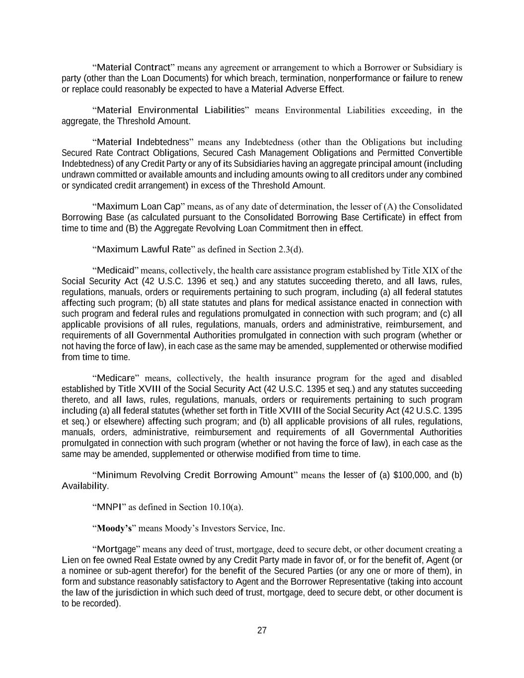 27 “Material Contract” means any agreement or arrangement to which a Borrower or Subsidiary is party (other than the Loan Documents) for which breach, termination, nonperformance or failure to renew or replace could reasonably be expected to have a Material Adverse Effect. “Material Environmental Liabilities” means Environmental Liabilities exceeding, in the aggregate, the Threshold Amount. “Material Indebtedness” means any Indebtedness (other than the Obligations but including Secured Rate Contract Obligations, Secured Cash Management Obligations and Permitted Convertible Indebtedness) of any Credit Party or any of its Subsidiaries having an aggregate principal amount (including undrawn committed or available amounts and including amounts owing to all creditors under any combined or syndicated credit arrangement) in excess of the Threshold Amount. “Maximum Loan Cap” means, as of any date of determination, the lesser of (A) the Consolidated Borrowing Base (as calculated pursuant to the Consolidated Borrowing Base Certificate) in effect from time to time and (B) the Aggregate Revolving Loan Commitment then in effect. “Maximum Lawful Rate” as defined in Section 2.3(d). “Medicaid” means, collectively, the health care assistance program established by Title XIX of the Social Security Act (42 U.S.C. 1396 et seq.) and any statutes succeeding thereto, and all laws, rules, regulations, manuals, orders or requirements pertaining to such program, including (a) all federal statutes affecting such program; (b) all state statutes and plans for medical assistance enacted in connection with such program and federal rules and regulations promulgated in connection with such program; and (c) all applicable provisions of all rules, regulations, manuals, orders and administrative, reimbursement, and requirements of all Governmental Authorities promulgated in connection with such program (whether or not having the force of law), in each case as the same may be amended, supplemented or otherwise modified from time to time. “Medicare” means, collectively, the health insurance program for the aged and disabled established by Title XVIII of the Social Security Act (42 U.S.C. 1395 et seq.) and any statutes succeeding thereto, and all laws, rules, regulations, manuals, orders or requirements pertaining to such program including (a) all federal statutes (whether set forth in Title XVIII of the Social Security Act (42 U.S.C. 1395 et seq.) or elsewhere) affecting such program; and (b) all applicable provisions of all rules, regulations, manuals, orders, administrative, reimbursement and requirements of all Governmental Authorities promulgated in connection with such program (whether or not having the force of law), in each case as the same may be amended, supplemented or otherwise modified from time to time. “Minimum Revolving Credit Borrowing Amount” means the lesser of (a) $100,000, and (b) Availability. “MNPI” as defined in Section 10.10(a). “Moody’s” means Moody’s Investors Service, Inc. “Mortgage” means any deed of trust, mortgage, deed to secure debt, or other document creating a Lien on fee owned Real Estate owned by any Credit Party made in favor of, or for the benefit of, Agent (or a nominee or sub-agent therefor) for the benefit of the Secured Parties (or any one or more of them), in form and substance reasonably satisfactory to Agent and the Borrower Representative (taking into account the law of the jurisdiction in which such deed of trust, mortgage, deed to secure debt, or other document is to be recorded).