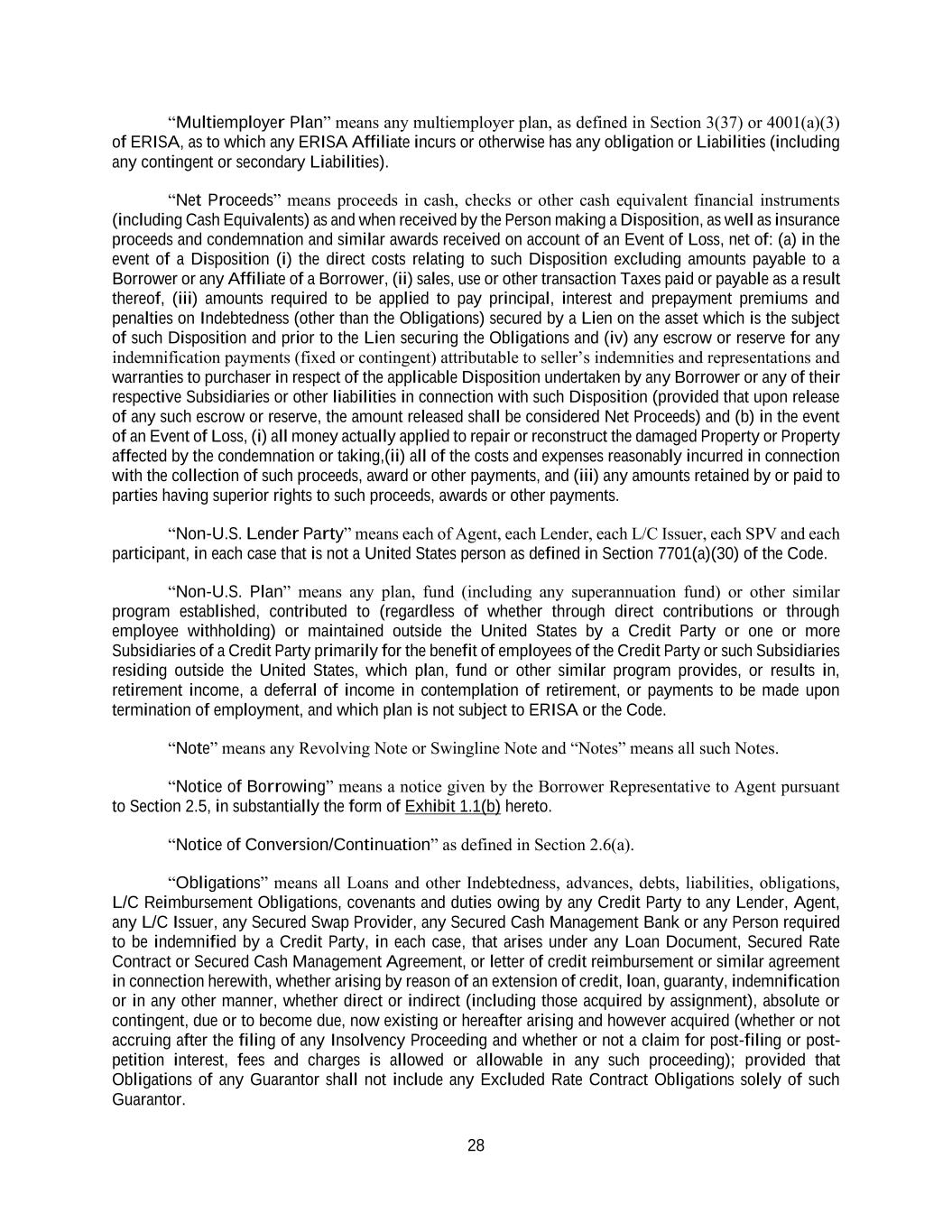 28 “Multiemployer Plan” means any multiemployer plan, as defined in Section 3(37) or 4001(a)(3) of ERISA, as to which any ERISA Affiliate incurs or otherwise has any obligation or Liabilities (including any contingent or secondary Liabilities). “Net Proceeds” means proceeds in cash, checks or other cash equivalent financial instruments (including Cash Equivalents) as and when received by the Person making a Disposition, as well as insurance proceeds and condemnation and similar awards received on account of an Event of Loss, net of: (a) in the event of a Disposition (i) the direct costs relating to such Disposition excluding amounts payable to a Borrower or any Affiliate of a Borrower, (ii) sales, use or other transaction Taxes paid or payable as a result thereof, (iii) amounts required to be applied to pay principal, interest and prepayment premiums and penalties on Indebtedness (other than the Obligations) secured by a Lien on the asset which is the subject of such Disposition and prior to the Lien securing the Obligations and (iv) any escrow or reserve for any indemnification payments (fixed or contingent) attributable to seller’s indemnities and representations and warranties to purchaser in respect of the applicable Disposition undertaken by any Borrower or any of their respective Subsidiaries or other liabilities in connection with such Disposition (provided that upon release of any such escrow or reserve, the amount released shall be considered Net Proceeds) and (b) in the event of an Event of Loss, (i) all money actually applied to repair or reconstruct the damaged Property or Property affected by the condemnation or taking,(ii) all of the costs and expenses reasonably incurred in connection with the collection of such proceeds, award or other payments, and (iii) any amounts retained by or paid to parties having superior rights to such proceeds, awards or other payments. “Non-U.S. Lender Party” means each of Agent, each Lender, each L/C Issuer, each SPV and each participant, in each case that is not a United States person as defined in Section 7701(a)(30) of the Code. “Non-U.S. Plan” means any plan, fund (including any superannuation fund) or other similar program established, contributed to (regardless of whether through direct contributions or through employee withholding) or maintained outside the United States by a Credit Party or one or more Subsidiaries of a Credit Party primarily for the benefit of employees of the Credit Party or such Subsidiaries residing outside the United States, which plan, fund or other similar program provides, or results in, retirement income, a deferral of income in contemplation of retirement, or payments to be made upon termination of employment, and which plan is not subject to ERISA or the Code. “Note” means any Revolving Note or Swingline Note and “Notes” means all such Notes. “Notice of Borrowing” means a notice given by the Borrower Representative to Agent pursuant to Section 2.5, in substantially the form of Exhibit 1.1(b) hereto. “Notice of Conversion/Continuation” as defined in Section 2.6(a). “Obligations” means all Loans and other Indebtedness, advances, debts, liabilities, obligations, L/C Reimbursement Obligations, covenants and duties owing by any Credit Party to any Lender, Agent, any L/C Issuer, any Secured Swap Provider, any Secured Cash Management Bank or any Person required to be indemnified by a Credit Party, in each case, that arises under any Loan Document, Secured Rate Contract or Secured Cash Management Agreement, or letter of credit reimbursement or similar agreement in connection herewith, whether arising by reason of an extension of credit, loan, guaranty, indemnification or in any other manner, whether direct or indirect (including those acquired by assignment), absolute or contingent, due or to become due, now existing or hereafter arising and however acquired (whether or not accruing after the filing of any Insolvency Proceeding and whether or not a claim for post-filing or post- petition interest, fees and charges is allowed or allowable in any such proceeding); provided that Obligations of any Guarantor shall not include any Excluded Rate Contract Obligations solely of such Guarantor.