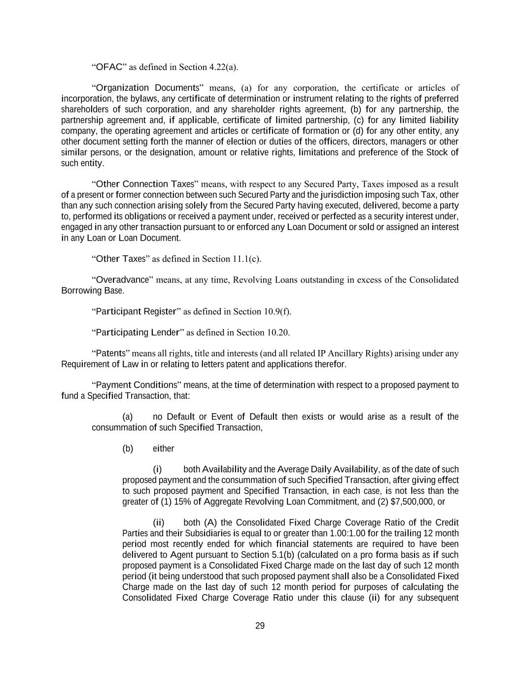 29 “OFAC” as defined in Section 4.22(a). “Organization Documents” means, (a) for any corporation, the certificate or articles of incorporation, the bylaws, any certificate of determination or instrument relating to the rights of preferred shareholders of such corporation, and any shareholder rights agreement, (b) for any partnership, the partnership agreement and, if applicable, certificate of limited partnership, (c) for any limited liability company, the operating agreement and articles or certificate of formation or (d) for any other entity, any other document setting forth the manner of election or duties of the officers, directors, managers or other similar persons, or the designation, amount or relative rights, limitations and preference of the Stock of such entity. “Other Connection Taxes” means, with respect to any Secured Party, Taxes imposed as a result of a present or former connection between such Secured Party and the jurisdiction imposing such Tax, other than any such connection arising solely from the Secured Party having executed, delivered, become a party to, performed its obligations or received a payment under, received or perfected as a security interest under, engaged in any other transaction pursuant to or enforced any Loan Document or sold or assigned an interest in any Loan or Loan Document. “Other Taxes” as defined in Section 11.1(c). “Overadvance” means, at any time, Revolving Loans outstanding in excess of the Consolidated Borrowing Base. “Participant Register” as defined in Section 10.9(f). “Participating Lender” as defined in Section 10.20. “Patents” means all rights, title and interests (and all related IP Ancillary Rights) arising under any Requirement of Law in or relating to letters patent and applications therefor. “Payment Conditions” means, at the time of determination with respect to a proposed payment to fund a Specified Transaction, that: (a) no Default or Event of Default then exists or would arise as a result of the consummation of such Specified Transaction, (b) either (i) both Availability and the Average Daily Availability, as of the date of such proposed payment and the consummation of such Specified Transaction, after giving effect to such proposed payment and Specified Transaction, in each case, is not less than the greater of (1) 15% of Aggregate Revolving Loan Commitment, and (2) $7,500,000, or (ii) both (A) the Consolidated Fixed Charge Coverage Ratio of the Credit Parties and their Subsidiaries is equal to or greater than 1.00:1.00 for the trailing 12 month period most recently ended for which financial statements are required to have been delivered to Agent pursuant to Section 5.1(b) (calculated on a pro forma basis as if such proposed payment is a Consolidated Fixed Charge made on the last day of such 12 month period (it being understood that such proposed payment shall also be a Consolidated Fixed Charge made on the last day of such 12 month period for purposes of calculating the Consolidated Fixed Charge Coverage Ratio under this clause (ii) for any subsequent