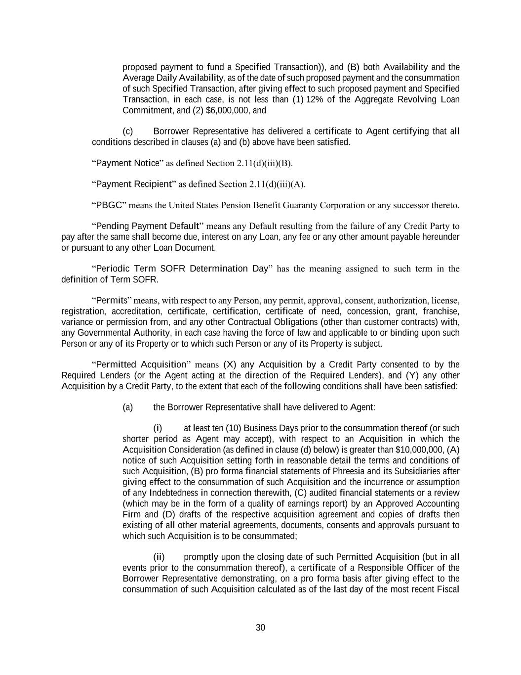 30 proposed payment to fund a Specified Transaction)), and (B) both Availability and the Average Daily Availability, as of the date of such proposed payment and the consummation of such Specified Transaction, after giving effect to such proposed payment and Specified Transaction, in each case, is not less than (1) 12% of the Aggregate Revolving Loan Commitment, and (2) $6,000,000, and (c) Borrower Representative has delivered a certificate to Agent certifying that all conditions described in clauses (a) and (b) above have been satisfied. “Payment Notice” as defined Section 2.11(d)(iii)(B). “Payment Recipient” as defined Section 2.11(d)(iii)(A). “PBGC” means the United States Pension Benefit Guaranty Corporation or any successor thereto. “Pending Payment Default” means any Default resulting from the failure of any Credit Party to pay after the same shall become due, interest on any Loan, any fee or any other amount payable hereunder or pursuant to any other Loan Document. “Periodic Term SOFR Determination Day” has the meaning assigned to such term in the definition of Term SOFR. “Permits” means, with respect to any Person, any permit, approval, consent, authorization, license, registration, accreditation, certificate, certification, certificate of need, concession, grant, franchise, variance or permission from, and any other Contractual Obligations (other than customer contracts) with, any Governmental Authority, in each case having the force of law and applicable to or binding upon such Person or any of its Property or to which such Person or any of its Property is subject. “Permitted Acquisition” means (X) any Acquisition by a Credit Party consented to by the Required Lenders (or the Agent acting at the direction of the Required Lenders), and (Y) any other Acquisition by a Credit Party, to the extent that each of the following conditions shall have been satisfied: (a) the Borrower Representative shall have delivered to Agent: (i) at least ten (10) Business Days prior to the consummation thereof (or such shorter period as Agent may accept), with respect to an Acquisition in which the Acquisition Consideration (as defined in clause (d) below) is greater than $10,000,000, (A) notice of such Acquisition setting forth in reasonable detail the terms and conditions of such Acquisition, (B) pro forma financial statements of Phreesia and its Subsidiaries after giving effect to the consummation of such Acquisition and the incurrence or assumption of any Indebtedness in connection therewith, (C) audited financial statements or a review (which may be in the form of a quality of earnings report) by an Approved Accounting Firm and (D) drafts of the respective acquisition agreement and copies of drafts then existing of all other material agreements, documents, consents and approvals pursuant to which such Acquisition is to be consummated; (ii) promptly upon the closing date of such Permitted Acquisition (but in all events prior to the consummation thereof), a certificate of a Responsible Officer of the Borrower Representative demonstrating, on a pro forma basis after giving effect to the consummation of such Acquisition calculated as of the last day of the most recent Fiscal