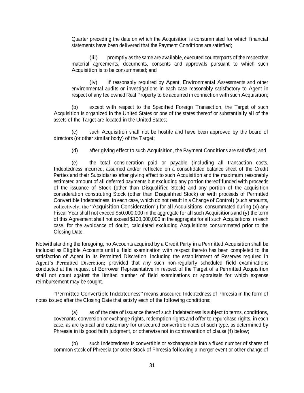 31 Quarter preceding the date on which the Acquisition is consummated for which financial statements have been delivered that the Payment Conditions are satisfied; (iii) promptly as the same are available, executed counterparts of the respective material agreements, documents, consents and approvals pursuant to which such Acquisition is to be consummated; and (iv) if reasonably required by Agent, Environmental Assessments and other environmental audits or investigations in each case reasonably satisfactory to Agent in respect of any fee owned Real Property to be acquired in connection with such Acquisition; (b) except with respect to the Specified Foreign Transaction, the Target of such Acquisition is organized in the United States or one of the states thereof or substantially all of the assets of the Target are located in the United States; (c) such Acquisition shall not be hostile and have been approved by the board of directors (or other similar body) of the Target; (d) after giving effect to such Acquisition, the Payment Conditions are satisfied; and (e) the total consideration paid or payable (including all transaction costs, Indebtedness incurred, assumed and/or reflected on a consolidated balance sheet of the Credit Parties and their Subsidiaries after giving effect to such Acquisition and the maximum reasonably estimated amount of all deferred payments but excluding any portion thereof funded with proceeds of the issuance of Stock (other than Disqualified Stock) and any portion of the acquisition consideration constituting Stock (other than Disqualified Stock) or with proceeds of Permitted Convertible Indebtedness, in each case, which do not result in a Change of Control) (such amounts, collectively, the “Acquisition Consideration”) for all Acquisitions consummated during (x) any Fiscal Year shall not exceed $50,000,000 in the aggregate for all such Acquisitions and (y) the term of this Agreement shall not exceed $100,000,000 in the aggregate for all such Acquisitions, in each case, for the avoidance of doubt, calculated excluding Acquisitions consummated prior to the Closing Date. Notwithstanding the foregoing, no Accounts acquired by a Credit Party in a Permitted Acquisition shall be included as Eligible Accounts until a field examination with respect thereto has been completed to the satisfaction of Agent in its Permitted Discretion, including the establishment of Reserves required in Agent’s Permitted Discretion; provided that any such non-regularly scheduled field examinations conducted at the request of Borrower Representative in respect of the Target of a Permitted Acquisition shall not count against the limited number of field examinations or appraisals for which expense reimbursement may be sought. “Permitted Convertible Indebtedness” means unsecured Indebtedness of Phreesia in the form of notes issued after the Closing Date that satisfy each of the following conditions: (a) as of the date of issuance thereof such Indebtedness is subject to terms, conditions, covenants, conversion or exchange rights, redemption rights and offer to repurchase rights, in each case, as are typical and customary for unsecured convertible notes of such type, as determined by Phreesia in its good faith judgment, or otherwise not in contravention of clause (f) below; (b) such Indebtedness is convertible or exchangeable into a fixed number of shares of common stock of Phreesia (or other Stock of Phreesia following a merger event or other change of