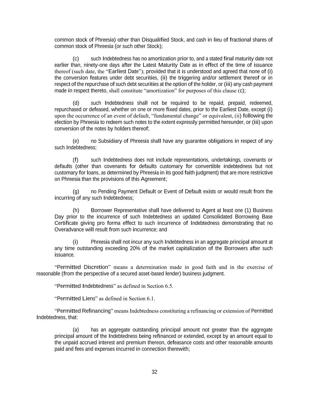 32 common stock of Phreesia) other than Disqualified Stock, and cash in lieu of fractional shares of common stock of Phreesia (or such other Stock); (c) such Indebtedness has no amortization prior to, and a stated final maturity date not earlier than, ninety-one days after the Latest Maturity Date as in effect of the time of issuance thereof (such date, the “Earliest Date”); provided that it is understood and agreed that none of (i) the conversion features under debt securities, (ii) the triggering and/or settlement thereof or in respect of the repurchase of such debt securities at the option of the holder, or (iii) any cash payment made in respect thereto, shall constitute “amortization” for purposes of this clause (c); (d) such Indebtedness shall not be required to be repaid, prepaid, redeemed, repurchased or defeased, whether on one or more fixed dates, prior to the Earliest Date, except (i) upon the occurrence of an event of default, “fundamental change” or equivalent, (ii) following the election by Phreesia to redeem such notes to the extent expressly permitted hereunder, or (iii) upon conversion of the notes by holders thereof; (e) no Subsidiary of Phreesia shall have any guarantee obligations in respect of any such Indebtedness; (f) such Indebtedness does not include representations, undertakings, covenants or defaults (other than covenants for defaults customary for convertible indebtedness but not customary for loans, as determined by Phreesia in its good faith judgment) that are more restrictive on Phreesia than the provisions of this Agreement; (g) no Pending Payment Default or Event of Default exists or would result from the incurring of any such Indebtedness; (h) Borrower Representative shall have delivered to Agent at least one (1) Business Day prior to the incurrence of such Indebtedness an updated Consolidated Borrowing Base Certificate giving pro forma effect to such incurrence of Indebtedness demonstrating that no Overadvance will result from such incurrence; and (i) Phreesia shall not incur any such Indebtedness in an aggregate principal amount at any time outstanding exceeding 20% of the market capitalization of the Borrowers after such issuance. “Permitted Discretion” means a determination made in good faith and in the exercise of reasonable (from the perspective of a secured asset-based lender) business judgment. “Permitted Indebtedness” as defined in Section 6.5. “Permitted Liens” as defined in Section 6.1. “Permitted Refinancing” means Indebtedness constituting a refinancing or extension of Permitted Indebtedness, that: (a) has an aggregate outstanding principal amount not greater than the aggregate principal amount of the Indebtedness being refinanced or extended, except by an amount equal to the unpaid accrued interest and premium thereon, defeasance costs and other reasonable amounts paid and fees and expenses incurred in connection therewith;