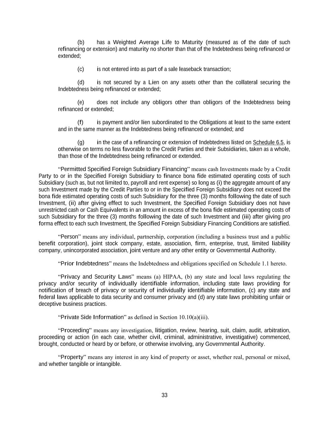 33 (b) has a Weighted Average Life to Maturity (measured as of the date of such refinancing or extension) and maturity no shorter than that of the Indebtedness being refinanced or extended; (c) is not entered into as part of a sale leaseback transaction; (d) is not secured by a Lien on any assets other than the collateral securing the Indebtedness being refinanced or extended; (e) does not include any obligors other than obligors of the Indebtedness being refinanced or extended; (f) is payment and/or lien subordinated to the Obligations at least to the same extent and in the same manner as the Indebtedness being refinanced or extended; and (g) in the case of a refinancing or extension of Indebtedness listed on Schedule 6.5, is otherwise on terms no less favorable to the Credit Parties and their Subsidiaries, taken as a whole, than those of the Indebtedness being refinanced or extended. “Permitted Specified Foreign Subsidiary Financing” means cash Investments made by a Credit Party to or in the Specified Foreign Subsidiary to finance bona fide estimated operating costs of such Subsidiary (such as, but not limited to, payroll and rent expense) so long as (i) the aggregate amount of any such Investment made by the Credit Parties to or in the Specified Foreign Subsidiary does not exceed the bona fide estimated operating costs of such Subsidiary for the three (3) months following the date of such Investment, (ii) after giving effect to such Investment, the Specified Foreign Subsidiary does not have unrestricted cash or Cash Equivalents in an amount in excess of the bona fide estimated operating costs of such Subsidiary for the three (3) months following the date of such Investment and (iii) after giving pro forma effect to each such Investment, the Specified Foreign Subsidiary Financing Conditions are satisfied. “Person” means any individual, partnership, corporation (including a business trust and a public benefit corporation), joint stock company, estate, association, firm, enterprise, trust, limited liability company, unincorporated association, joint venture and any other entity or Governmental Authority. “Prior Indebtedness” means the Indebtedness and obligations specified on Schedule 1.1 hereto. “Privacy and Security Laws” means (a) HIPAA, (b) any state and local laws regulating the privacy and/or security of individually identifiable information, including state laws providing for notification of breach of privacy or security of individually identifiable information, (c) any state and federal laws applicable to data security and consumer privacy and (d) any state laws prohibiting unfair or deceptive business practices. “Private Side Information” as defined in Section 10.10(a)(iii). “Proceeding” means any investigation, litigation, review, hearing, suit, claim, audit, arbitration, proceeding or action (in each case, whether civil, criminal, administrative, investigative) commenced, brought, conducted or heard by or before, or otherwise involving, any Governmental Authority. “Property” means any interest in any kind of property or asset, whether real, personal or mixed, and whether tangible or intangible.