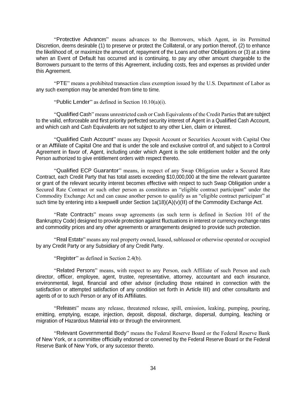 34 “Protective Advances” means advances to the Borrowers, which Agent, in its Permitted Discretion, deems desirable (1) to preserve or protect the Collateral, or any portion thereof, (2) to enhance the likelihood of, or maximize the amount of, repayment of the Loans and other Obligations or (3) at a time when an Event of Default has occurred and is continuing, to pay any other amount chargeable to the Borrowers pursuant to the terms of this Agreement, including costs, fees and expenses as provided under this Agreement. “PTE” means a prohibited transaction class exemption issued by the U.S. Department of Labor as any such exemption may be amended from time to time. “Public Lender” as defined in Section 10.10(a)(i). “Qualified Cash” means unrestricted cash or Cash Equivalents of the Credit Parties that are subject to the valid, enforceable and first priority perfected security interest of Agent in a Qualified Cash Account, and which cash and Cash Equivalents are not subject to any other Lien, claim or interest. “Qualified Cash Account” means any Deposit Account or Securities Account with Capital One or an Affiliate of Capital One and that is under the sole and exclusive control of, and subject to a Control Agreement in favor of, Agent, including under which Agent is the sole entitlement holder and the only Person authorized to give entitlement orders with respect thereto. “Qualified ECP Guarantor” means, in respect of any Swap Obligation under a Secured Rate Contract, each Credit Party that has total assets exceeding $10,000,000 at the time the relevant guarantee or grant of the relevant security interest becomes effective with respect to such Swap Obligation under a Secured Rate Contract or such other person as constitutes an “eligible contract participant” under the Commodity Exchange Act and can cause another person to qualify as an “eligible contract participant” at such time by entering into a keepwell under Section 1a(18)(A)(v)(II) of the Commodity Exchange Act. “Rate Contracts” means swap agreements (as such term is defined in Section 101 of the Bankruptcy Code) designed to provide protection against fluctuations in interest or currency exchange rates and commodity prices and any other agreements or arrangements designed to provide such protection. “Real Estate” means any real property owned, leased, subleased or otherwise operated or occupied by any Credit Party or any Subsidiary of any Credit Party. “Register” as defined in Section 2.4(b). “Related Persons” means, with respect to any Person, each Affiliate of such Person and each director, officer, employee, agent, trustee, representative, attorney, accountant and each insurance, environmental, legal, financial and other advisor (including those retained in connection with the satisfaction or attempted satisfaction of any condition set forth in Article III) and other consultants and agents of or to such Person or any of its Affiliates. “Releases” means any release, threatened release, spill, emission, leaking, pumping, pouring, emitting, emptying, escape, injection, deposit, disposal, discharge, dispersal, dumping, leaching or migration of Hazardous Material into or through the environment. “Relevant Governmental Body” means the Federal Reserve Board or the Federal Reserve Bank of New York, or a committee officially endorsed or convened by the Federal Reserve Board or the Federal Reserve Bank of New York, or any successor thereto.