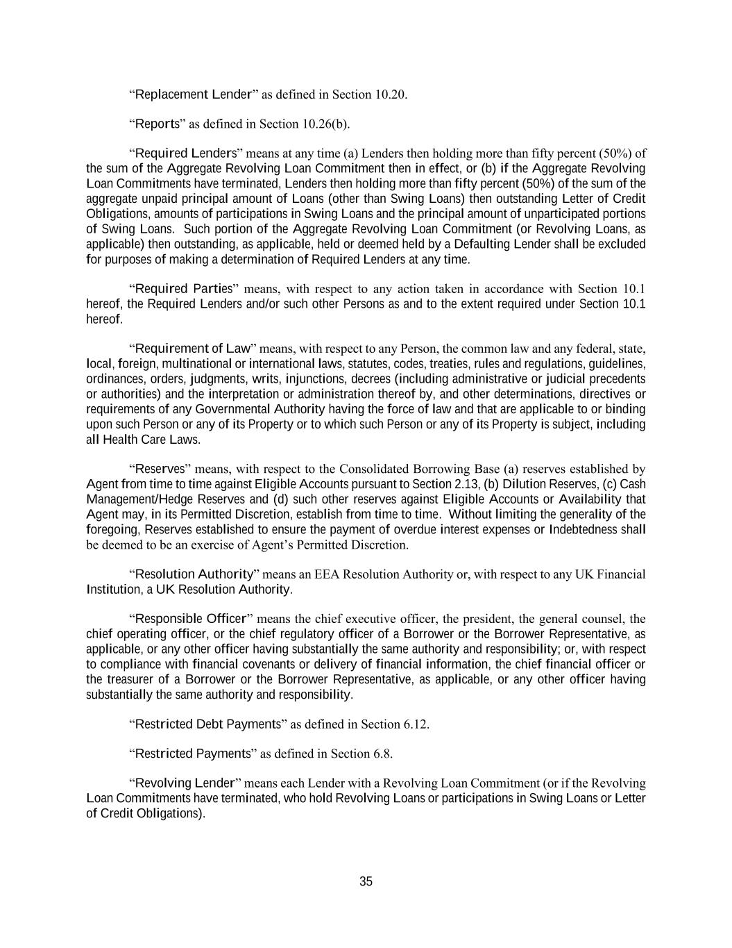 35 “Replacement Lender” as defined in Section 10.20. “Reports” as defined in Section 10.26(b). “Required Lenders” means at any time (a) Lenders then holding more than fifty percent (50%) of the sum of the Aggregate Revolving Loan Commitment then in effect, or (b) if the Aggregate Revolving Loan Commitments have terminated, Lenders then holding more than fifty percent (50%) of the sum of the aggregate unpaid principal amount of Loans (other than Swing Loans) then outstanding Letter of Credit Obligations, amounts of participations in Swing Loans and the principal amount of unparticipated portions of Swing Loans. Such portion of the Aggregate Revolving Loan Commitment (or Revolving Loans, as applicable) then outstanding, as applicable, held or deemed held by a Defaulting Lender shall be excluded for purposes of making a determination of Required Lenders at any time. “Required Parties” means, with respect to any action taken in accordance with Section 10.1 hereof, the Required Lenders and/or such other Persons as and to the extent required under Section 10.1 hereof. “Requirement of Law” means, with respect to any Person, the common law and any federal, state, local, foreign, multinational or international laws, statutes, codes, treaties, rules and regulations, guidelines, ordinances, orders, judgments, writs, injunctions, decrees (including administrative or judicial precedents or authorities) and the interpretation or administration thereof by, and other determinations, directives or requirements of any Governmental Authority having the force of law and that are applicable to or binding upon such Person or any of its Property or to which such Person or any of its Property is subject, including all Health Care Laws. “Reserves” means, with respect to the Consolidated Borrowing Base (a) reserves established by Agent from time to time against Eligible Accounts pursuant to Section 2.13, (b) Dilution Reserves, (c) Cash Management/Hedge Reserves and (d) such other reserves against Eligible Accounts or Availability that Agent may, in its Permitted Discretion, establish from time to time. Without limiting the generality of the foregoing, Reserves established to ensure the payment of overdue interest expenses or Indebtedness shall be deemed to be an exercise of Agent’s Permitted Discretion. “Resolution Authority” means an EEA Resolution Authority or, with respect to any UK Financial Institution, a UK Resolution Authority. “Responsible Officer” means the chief executive officer, the president, the general counsel, the chief operating officer, or the chief regulatory officer of a Borrower or the Borrower Representative, as applicable, or any other officer having substantially the same authority and responsibility; or, with respect to compliance with financial covenants or delivery of financial information, the chief financial officer or the treasurer of a Borrower or the Borrower Representative, as applicable, or any other officer having substantially the same authority and responsibility. “Restricted Debt Payments” as defined in Section 6.12. “Restricted Payments” as defined in Section 6.8. “Revolving Lender” means each Lender with a Revolving Loan Commitment (or if the Revolving Loan Commitments have terminated, who hold Revolving Loans or participations in Swing Loans or Letter of Credit Obligations).