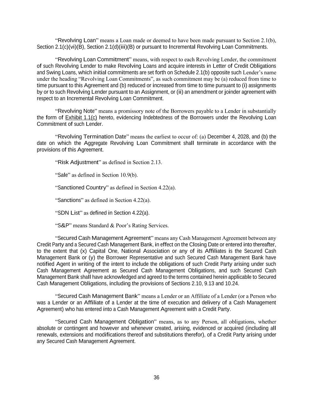 36 “Revolving Loan” means a Loan made or deemed to have been made pursuant to Section 2.1(b), Section 2.1(c)(vi)(B), Section 2.1(d)(iii)(B) or pursuant to Incremental Revolving Loan Commitments. “Revolving Loan Commitment” means, with respect to each Revolving Lender, the commitment of such Revolving Lender to make Revolving Loans and acquire interests in Letter of Credit Obligations and Swing Loans, which initial commitments are set forth on Schedule 2.1(b) opposite such Lender’s name under the heading “Revolving Loan Commitments”, as such commitment may be (a) reduced from time to time pursuant to this Agreement and (b) reduced or increased from time to time pursuant to (i) assignments by or to such Revolving Lender pursuant to an Assignment, or (ii) an amendment or joinder agreement with respect to an Incremental Revolving Loan Commitment. “Revolving Note” means a promissory note of the Borrowers payable to a Lender in substantially the form of Exhibit 1.1(c) hereto, evidencing Indebtedness of the Borrowers under the Revolving Loan Commitment of such Lender. “Revolving Termination Date” means the earliest to occur of: (a) December 4, 2028, and (b) the date on which the Aggregate Revolving Loan Commitment shall terminate in accordance with the provisions of this Agreement. “Risk Adjustment” as defined in Section 2.13. “Sale” as defined in Section 10.9(b). “Sanctioned Country” as defined in Section 4.22(a). “Sanctions” as defined in Section 4.22(a). “SDN List” as defined in Section 4.22(a). “S&P” means Standard & Poor’s Rating Services. “Secured Cash Management Agreement” means any Cash Management Agreement between any Credit Party and a Secured Cash Management Bank, in effect on the Closing Date or entered into thereafter, to the extent that (x) Capital One, National Association or any of its Affiliates is the Secured Cash Management Bank or (y) the Borrower Representative and such Secured Cash Management Bank have notified Agent in writing of the intent to include the obligations of such Credit Party arising under such Cash Management Agreement as Secured Cash Management Obligations, and such Secured Cash Management Bank shall have acknowledged and agreed to the terms contained herein applicable to Secured Cash Management Obligations, including the provisions of Sections 2.10, 9.13 and 10.24. “Secured Cash Management Bank” means a Lender or an Affiliate of a Lender (or a Person who was a Lender or an Affiliate of a Lender at the time of execution and delivery of a Cash Management Agreement) who has entered into a Cash Management Agreement with a Credit Party. “Secured Cash Management Obligation” means, as to any Person, all obligations, whether absolute or contingent and however and whenever created, arising, evidenced or acquired (including all renewals, extensions and modifications thereof and substitutions therefor), of a Credit Party arising under any Secured Cash Management Agreement.