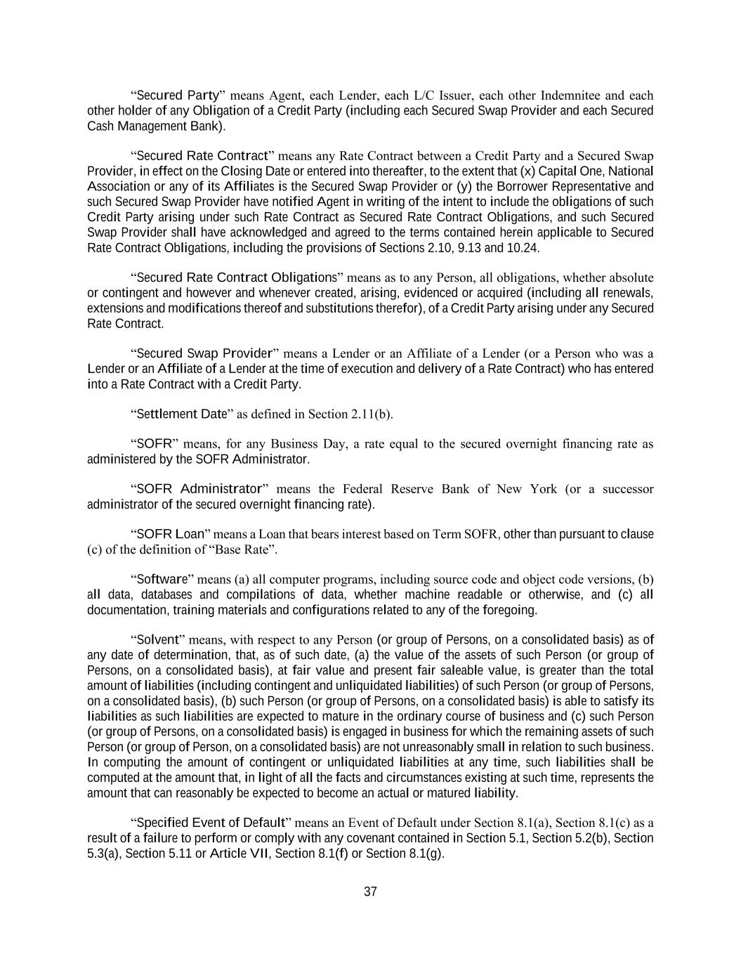 37 “Secured Party” means Agent, each Lender, each L/C Issuer, each other Indemnitee and each other holder of any Obligation of a Credit Party (including each Secured Swap Provider and each Secured Cash Management Bank). “Secured Rate Contract” means any Rate Contract between a Credit Party and a Secured Swap Provider, in effect on the Closing Date or entered into thereafter, to the extent that (x) Capital One, National Association or any of its Affiliates is the Secured Swap Provider or (y) the Borrower Representative and such Secured Swap Provider have notified Agent in writing of the intent to include the obligations of such Credit Party arising under such Rate Contract as Secured Rate Contract Obligations, and such Secured Swap Provider shall have acknowledged and agreed to the terms contained herein applicable to Secured Rate Contract Obligations, including the provisions of Sections 2.10, 9.13 and 10.24. “Secured Rate Contract Obligations” means as to any Person, all obligations, whether absolute or contingent and however and whenever created, arising, evidenced or acquired (including all renewals, extensions and modifications thereof and substitutions therefor), of a Credit Party arising under any Secured Rate Contract. “Secured Swap Provider” means a Lender or an Affiliate of a Lender (or a Person who was a Lender or an Affiliate of a Lender at the time of execution and delivery of a Rate Contract) who has entered into a Rate Contract with a Credit Party. “Settlement Date” as defined in Section 2.11(b). “SOFR” means, for any Business Day, a rate equal to the secured overnight financing rate as administered by the SOFR Administrator. “SOFR Administrator” means the Federal Reserve Bank of New York (or a successor administrator of the secured overnight financing rate). “SOFR Loan” means a Loan that bears interest based on Term SOFR, other than pursuant to clause (c) of the definition of “Base Rate”. “Software” means (a) all computer programs, including source code and object code versions, (b) all data, databases and compilations of data, whether machine readable or otherwise, and (c) all documentation, training materials and configurations related to any of the foregoing. “Solvent” means, with respect to any Person (or group of Persons, on a consolidated basis) as of any date of determination, that, as of such date, (a) the value of the assets of such Person (or group of Persons, on a consolidated basis), at fair value and present fair saleable value, is greater than the total amount of liabilities (including contingent and unliquidated liabilities) of such Person (or group of Persons, on a consolidated basis), (b) such Person (or group of Persons, on a consolidated basis) is able to satisfy its liabilities as such liabilities are expected to mature in the ordinary course of business and (c) such Person (or group of Persons, on a consolidated basis) is engaged in business for which the remaining assets of such Person (or group of Person, on a consolidated basis) are not unreasonably small in relation to such business. In computing the amount of contingent or unliquidated liabilities at any time, such liabilities shall be computed at the amount that, in light of all the facts and circumstances existing at such time, represents the amount that can reasonably be expected to become an actual or matured liability. “Specified Event of Default” means an Event of Default under Section 8.1(a), Section 8.1(c) as a result of a failure to perform or comply with any covenant contained in Section 5.1, Section 5.2(b), Section 5.3(a), Section 5.11 or Article VII, Section 8.1(f) or Section 8.1(g).