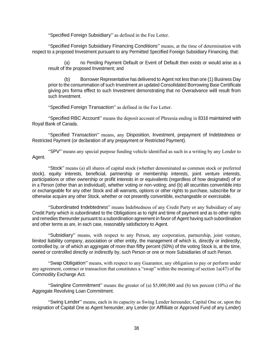 38 “Specified Foreign Subsidiary” as defined in the Fee Letter. “Specified Foreign Subsidiary Financing Conditions” means, at the time of determination with respect to a proposed Investment pursuant to any Permitted Specified Foreign Subsidiary Financing, that: (a) no Pending Payment Default or Event of Default then exists or would arise as a result of the proposed Investment; and (b) Borrower Representative has delivered to Agent not less than one (1) Business Day prior to the consummation of such Investment an updated Consolidated Borrowing Base Certificate giving pro forma effect to such Investment demonstrating that no Overadvance will result from such Investment. “Specified Foreign Transaction” as defined in the Fee Letter. “Specified RBC Account” means the deposit account of Phreesia ending in 8316 maintained with Royal Bank of Canada. “Specified Transaction” means, any Disposition, Investment, prepayment of Indebtedness or Restricted Payment (or declaration of any prepayment or Restricted Payment). “SPV” means any special purpose funding vehicle identified as such in a writing by any Lender to Agent. “Stock” means (a) all shares of capital stock (whether denominated as common stock or preferred stock), equity interests, beneficial, partnership or membership interests, joint venture interests, participations or other ownership or profit interests in or equivalents (regardless of how designated) of or in a Person (other than an individual), whether voting or non-voting; and (b) all securities convertible into or exchangeable for any other Stock and all warrants, options or other rights to purchase, subscribe for or otherwise acquire any other Stock, whether or not presently convertible, exchangeable or exercisable. “Subordinated Indebtedness” means Indebtedness of any Credit Party or any Subsidiary of any Credit Party which is subordinated to the Obligations as to right and time of payment and as to other rights and remedies thereunder pursuant to a subordination agreement in favor of Agent having such subordination and other terms as are, in each case, reasonably satisfactory to Agent. “Subsidiary” means, with respect to any Person, any corporation, partnership, joint venture, limited liability company, association or other entity, the management of which is, directly or indirectly, controlled by, or of which an aggregate of more than fifty percent (50%) of the voting Stock is, at the time, owned or controlled directly or indirectly by, such Person or one or more Subsidiaries of such Person. “Swap Obligation” means, with respect to any Guarantor, any obligation to pay or perform under any agreement, contract or transaction that constitutes a “swap” within the meaning of section 1a(47) of the Commodity Exchange Act. “Swingline Commitment” means the greater of (a) $5,000,000 and (b) ten percent (10%) of the Aggregate Revolving Loan Commitment. “Swing Lender” means, each in its capacity as Swing Lender hereunder, Capital One or, upon the resignation of Capital One as Agent hereunder, any Lender (or Affiliate or Approved Fund of any Lender)