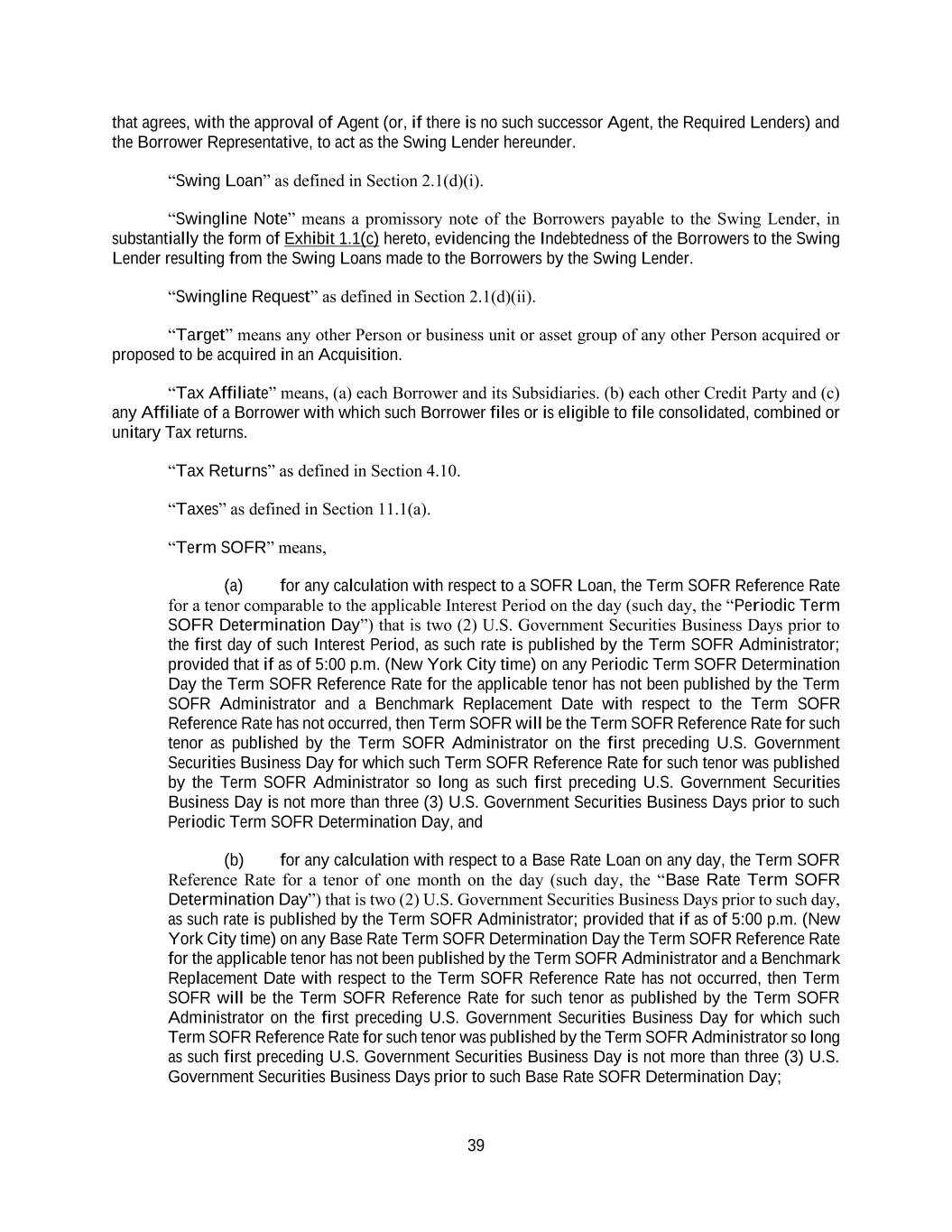39 that agrees, with the approval of Agent (or, if there is no such successor Agent, the Required Lenders) and the Borrower Representative, to act as the Swing Lender hereunder. “Swing Loan” as defined in Section 2.1(d)(i). “Swingline Note” means a promissory note of the Borrowers payable to the Swing Lender, in substantially the form of Exhibit 1.1(c) hereto, evidencing the Indebtedness of the Borrowers to the Swing Lender resulting from the Swing Loans made to the Borrowers by the Swing Lender. “Swingline Request” as defined in Section 2.1(d)(ii). “Target” means any other Person or business unit or asset group of any other Person acquired or proposed to be acquired in an Acquisition. “Tax Affiliate” means, (a) each Borrower and its Subsidiaries. (b) each other Credit Party and (c) any Affiliate of a Borrower with which such Borrower files or is eligible to file consolidated, combined or unitary Tax returns. “Tax Returns” as defined in Section 4.10. “Taxes” as defined in Section 11.1(a). “Term SOFR” means, (a) for any calculation with respect to a SOFR Loan, the Term SOFR Reference Rate for a tenor comparable to the applicable Interest Period on the day (such day, the “Periodic Term SOFR Determination Day”) that is two (2) U.S. Government Securities Business Days prior to the first day of such Interest Period, as such rate is published by the Term SOFR Administrator; provided that if as of 5:00 p.m. (New York City time) on any Periodic Term SOFR Determination Day the Term SOFR Reference Rate for the applicable tenor has not been published by the Term SOFR Administrator and a Benchmark Replacement Date with respect to the Term SOFR Reference Rate has not occurred, then Term SOFR will be the Term SOFR Reference Rate for such tenor as published by the Term SOFR Administrator on the first preceding U.S. Government Securities Business Day for which such Term SOFR Reference Rate for such tenor was published by the Term SOFR Administrator so long as such first preceding U.S. Government Securities Business Day is not more than three (3) U.S. Government Securities Business Days prior to such Periodic Term SOFR Determination Day, and (b) for any calculation with respect to a Base Rate Loan on any day, the Term SOFR Reference Rate for a tenor of one month on the day (such day, the “Base Rate Term SOFR Determination Day”) that is two (2) U.S. Government Securities Business Days prior to such day, as such rate is published by the Term SOFR Administrator; provided that if as of 5:00 p.m. (New York City time) on any Base Rate Term SOFR Determination Day the Term SOFR Reference Rate for the applicable tenor has not been published by the Term SOFR Administrator and a Benchmark Replacement Date with respect to the Term SOFR Reference Rate has not occurred, then Term SOFR will be the Term SOFR Reference Rate for such tenor as published by the Term SOFR Administrator on the first preceding U.S. Government Securities Business Day for which such Term SOFR Reference Rate for such tenor was published by the Term SOFR Administrator so long as such first preceding U.S. Government Securities Business Day is not more than three (3) U.S. Government Securities Business Days prior to such Base Rate SOFR Determination Day;
