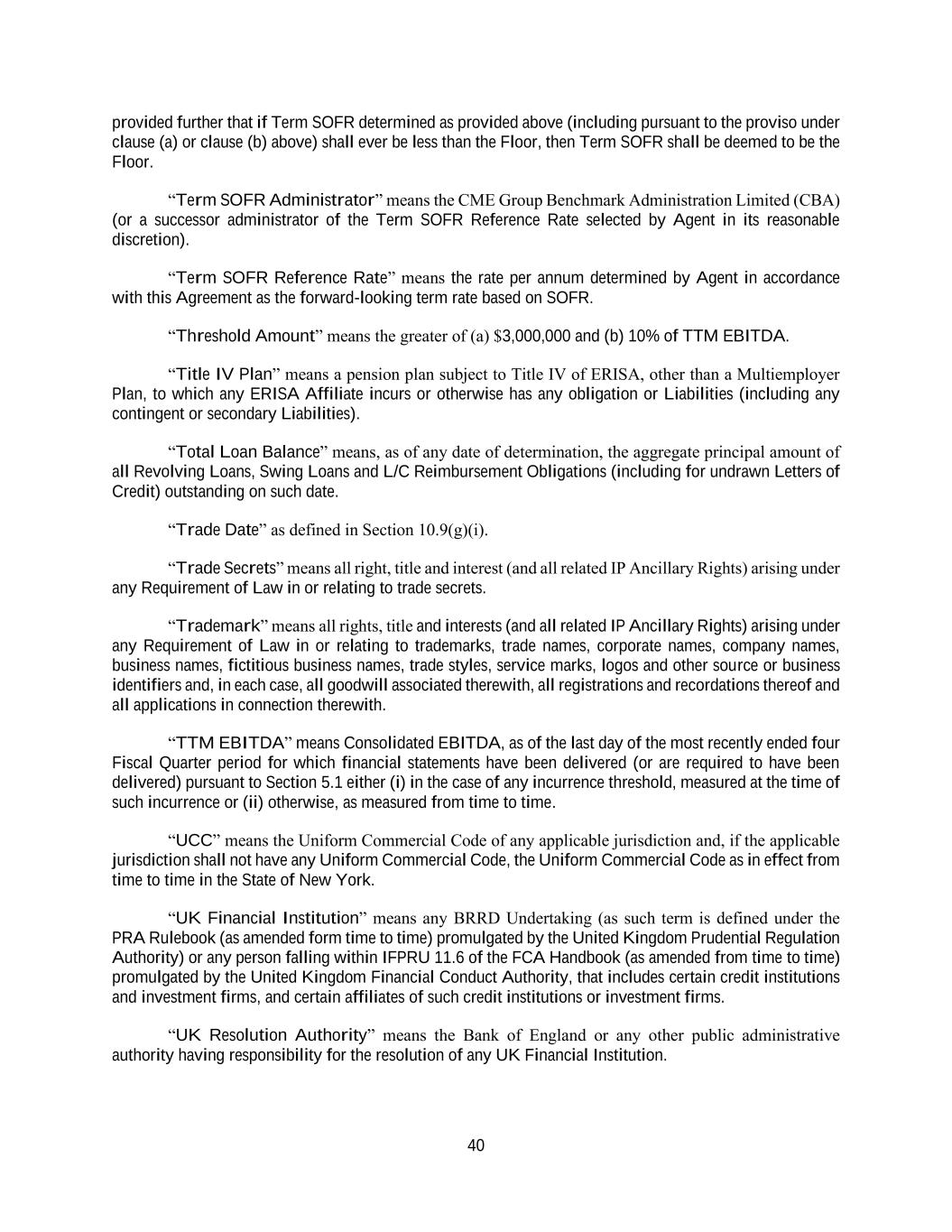 40 provided further that if Term SOFR determined as provided above (including pursuant to the proviso under clause (a) or clause (b) above) shall ever be less than the Floor, then Term SOFR shall be deemed to be the Floor. “Term SOFR Administrator” means the CME Group Benchmark Administration Limited (CBA) (or a successor administrator of the Term SOFR Reference Rate selected by Agent in its reasonable discretion). “Term SOFR Reference Rate” means the rate per annum determined by Agent in accordance with this Agreement as the forward-looking term rate based on SOFR. “Threshold Amount” means the greater of (a) $3,000,000 and (b) 10% of TTM EBITDA. “Title IV Plan” means a pension plan subject to Title IV of ERISA, other than a Multiemployer Plan, to which any ERISA Affiliate incurs or otherwise has any obligation or Liabilities (including any contingent or secondary Liabilities). “Total Loan Balance” means, as of any date of determination, the aggregate principal amount of all Revolving Loans, Swing Loans and L/C Reimbursement Obligations (including for undrawn Letters of Credit) outstanding on such date. “Trade Date” as defined in Section 10.9(g)(i). “Trade Secrets” means all right, title and interest (and all related IP Ancillary Rights) arising under any Requirement of Law in or relating to trade secrets. “Trademark” means all rights, title and interests (and all related IP Ancillary Rights) arising under any Requirement of Law in or relating to trademarks, trade names, corporate names, company names, business names, fictitious business names, trade styles, service marks, logos and other source or business identifiers and, in each case, all goodwill associated therewith, all registrations and recordations thereof and all applications in connection therewith. “TTM EBITDA” means Consolidated EBITDA, as of the last day of the most recently ended four Fiscal Quarter period for which financial statements have been delivered (or are required to have been delivered) pursuant to Section 5.1 either (i) in the case of any incurrence threshold, measured at the time of such incurrence or (ii) otherwise, as measured from time to time. “UCC” means the Uniform Commercial Code of any applicable jurisdiction and, if the applicable jurisdiction shall not have any Uniform Commercial Code, the Uniform Commercial Code as in effect from time to time in the State of New York. “UK Financial Institution” means any BRRD Undertaking (as such term is defined under the PRA Rulebook (as amended form time to time) promulgated by the United Kingdom Prudential Regulation Authority) or any person falling within IFPRU 11.6 of the FCA Handbook (as amended from time to time) promulgated by the United Kingdom Financial Conduct Authority, that includes certain credit institutions and investment firms, and certain affiliates of such credit institutions or investment firms. “UK Resolution Authority” means the Bank of England or any other public administrative authority having responsibility for the resolution of any UK Financial Institution.