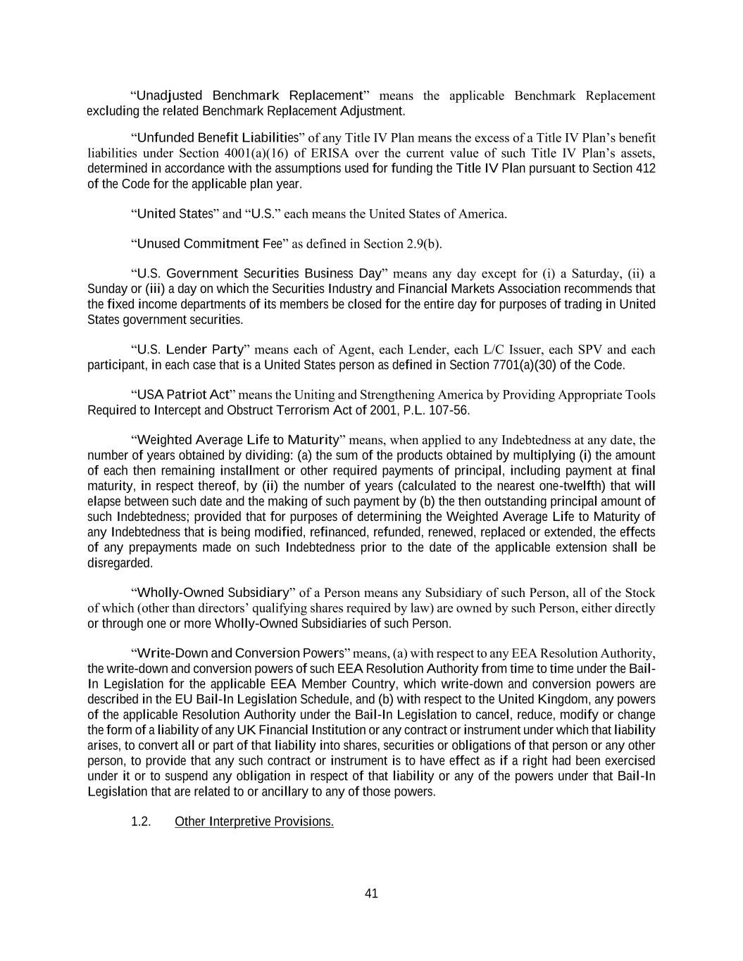 41 “Unadjusted Benchmark Replacement” means the applicable Benchmark Replacement excluding the related Benchmark Replacement Adjustment. “Unfunded Benefit Liabilities” of any Title IV Plan means the excess of a Title IV Plan’s benefit liabilities under Section 4001(a)(16) of ERISA over the current value of such Title IV Plan’s assets, determined in accordance with the assumptions used for funding the Title IV Plan pursuant to Section 412 of the Code for the applicable plan year. “United States” and “U.S.” each means the United States of America. “Unused Commitment Fee” as defined in Section 2.9(b). “U.S. Government Securities Business Day” means any day except for (i) a Saturday, (ii) a Sunday or (iii) a day on which the Securities Industry and Financial Markets Association recommends that the fixed income departments of its members be closed for the entire day for purposes of trading in United States government securities. “U.S. Lender Party” means each of Agent, each Lender, each L/C Issuer, each SPV and each participant, in each case that is a United States person as defined in Section 7701(a)(30) of the Code. “USA Patriot Act” means the Uniting and Strengthening America by Providing Appropriate Tools Required to Intercept and Obstruct Terrorism Act of 2001, P.L. 107-56. “Weighted Average Life to Maturity” means, when applied to any Indebtedness at any date, the number of years obtained by dividing: (a) the sum of the products obtained by multiplying (i) the amount of each then remaining installment or other required payments of principal, including payment at final maturity, in respect thereof, by (ii) the number of years (calculated to the nearest one-twelfth) that will elapse between such date and the making of such payment by (b) the then outstanding principal amount of such Indebtedness; provided that for purposes of determining the Weighted Average Life to Maturity of any Indebtedness that is being modified, refinanced, refunded, renewed, replaced or extended, the effects of any prepayments made on such Indebtedness prior to the date of the applicable extension shall be disregarded. “Wholly-Owned Subsidiary” of a Person means any Subsidiary of such Person, all of the Stock of which (other than directors’ qualifying shares required by law) are owned by such Person, either directly or through one or more Wholly-Owned Subsidiaries of such Person. “Write-Down and Conversion Powers” means, (a) with respect to any EEA Resolution Authority, the write-down and conversion powers of such EEA Resolution Authority from time to time under the Bail- In Legislation for the applicable EEA Member Country, which write-down and conversion powers are described in the EU Bail-In Legislation Schedule, and (b) with respect to the United Kingdom, any powers of the applicable Resolution Authority under the Bail-In Legislation to cancel, reduce, modify or change the form of a liability of any UK Financial Institution or any contract or instrument under which that liability arises, to convert all or part of that liability into shares, securities or obligations of that person or any other person, to provide that any such contract or instrument is to have effect as if a right had been exercised under it or to suspend any obligation in respect of that liability or any of the powers under that Bail-In Legislation that are related to or ancillary to any of those powers. 1.2. Other Interpretive Provisions.