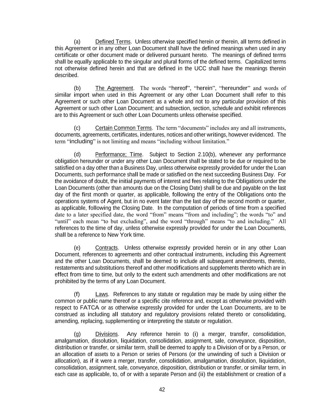 42 (a) Defined Terms. Unless otherwise specified herein or therein, all terms defined in this Agreement or in any other Loan Document shall have the defined meanings when used in any certificate or other document made or delivered pursuant hereto. The meanings of defined terms shall be equally applicable to the singular and plural forms of the defined terms. Capitalized terms not otherwise defined herein and that are defined in the UCC shall have the meanings therein described. (b) The Agreement. The words “hereof”, “herein”, “hereunder” and words of similar import when used in this Agreement or any other Loan Document shall refer to this Agreement or such other Loan Document as a whole and not to any particular provision of this Agreement or such other Loan Document; and subsection, section, schedule and exhibit references are to this Agreement or such other Loan Documents unless otherwise specified. (c) Certain Common Terms. The term “documents” includes any and all instruments, documents, agreements, certificates, indentures, notices and other writings, however evidenced. The term “including” is not limiting and means “including without limitation.” (d) Performance; Time. Subject to Section 2.10(b), whenever any performance obligation hereunder or under any other Loan Document shall be stated to be due or required to be satisfied on a day other than a Business Day, unless otherwise expressly provided for under the Loan Documents, such performance shall be made or satisfied on the next succeeding Business Day. For the avoidance of doubt, the initial payments of interest and fees relating to the Obligations under the Loan Documents (other than amounts due on the Closing Date) shall be due and payable on the last day of the first month or quarter, as applicable, following the entry of the Obligations onto the operations systems of Agent, but in no event later than the last day of the second month or quarter, as applicable, following the Closing Date. In the computation of periods of time from a specified date to a later specified date, the word “from” means “from and including”; the words “to” and “until” each mean “to but excluding”, and the word “through” means “to and including.” All references to the time of day, unless otherwise expressly provided for under the Loan Documents, shall be a reference to New York time. (e) Contracts. Unless otherwise expressly provided herein or in any other Loan Document, references to agreements and other contractual instruments, including this Agreement and the other Loan Documents, shall be deemed to include all subsequent amendments, thereto, restatements and substitutions thereof and other modifications and supplements thereto which are in effect from time to time, but only to the extent such amendments and other modifications are not prohibited by the terms of any Loan Document. (f) Laws. References to any statute or regulation may be made by using either the common or public name thereof or a specific cite reference and, except as otherwise provided with respect to FATCA or as otherwise expressly provided for under the Loan Documents, are to be construed as including all statutory and regulatory provisions related thereto or consolidating, amending, replacing, supplementing or interpreting the statute or regulation. (g) Divisions. Any reference herein to (i) a merger, transfer, consolidation, amalgamation, dissolution, liquidation, consolidation, assignment, sale, conveyance, disposition, distribution or transfer, or similar term, shall be deemed to apply to a Division of or by a Person, or an allocation of assets to a Person or series of Persons (or the unwinding of such a Division or allocation), as if it were a merger, transfer, consolidation, amalgamation, dissolution, liquidation, consolidation, assignment, sale, conveyance, disposition, distribution or transfer, or similar term, in each case as applicable, to, of or with a separate Person and (ii) the establishment or creation of a