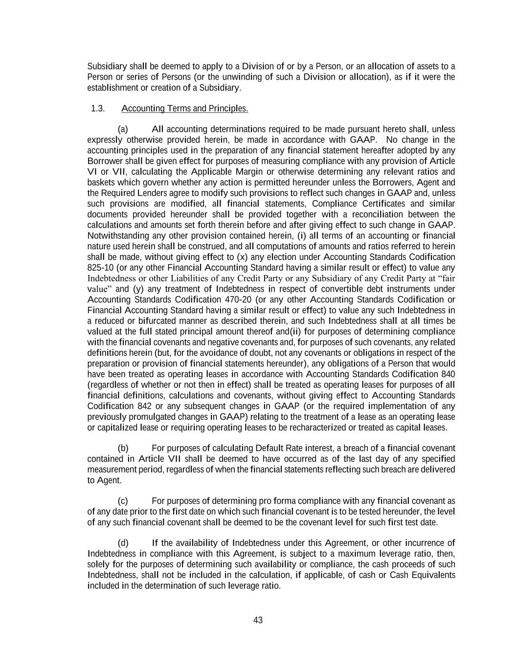 43 Subsidiary shall be deemed to apply to a Division of or by a Person, or an allocation of assets to a Person or series of Persons (or the unwinding of such a Division or allocation), as if it were the establishment or creation of a Subsidiary. 1.3. Accounting Terms and Principles. (a) All accounting determinations required to be made pursuant hereto shall, unless expressly otherwise provided herein, be made in accordance with GAAP. No change in the accounting principles used in the preparation of any financial statement hereafter adopted by any Borrower shall be given effect for purposes of measuring compliance with any provision of Article VI or VII, calculating the Applicable Margin or otherwise determining any relevant ratios and baskets which govern whether any action is permitted hereunder unless the Borrowers, Agent and the Required Lenders agree to modify such provisions to reflect such changes in GAAP and, unless such provisions are modified, all financial statements, Compliance Certificates and similar documents provided hereunder shall be provided together with a reconciliation between the calculations and amounts set forth therein before and after giving effect to such change in GAAP. Notwithstanding any other provision contained herein, (i) all terms of an accounting or financial nature used herein shall be construed, and all computations of amounts and ratios referred to herein shall be made, without giving effect to (x) any election under Accounting Standards Codification 825-10 (or any other Financial Accounting Standard having a similar result or effect) to value any Indebtedness or other Liabilities of any Credit Party or any Subsidiary of any Credit Party at “fair value” and (y) any treatment of Indebtedness in respect of convertible debt instruments under Accounting Standards Codification 470-20 (or any other Accounting Standards Codification or Financial Accounting Standard having a similar result or effect) to value any such Indebtedness in a reduced or bifurcated manner as described therein, and such Indebtedness shall at all times be valued at the full stated principal amount thereof and(ii) for purposes of determining compliance with the financial covenants and negative covenants and, for purposes of such covenants, any related definitions herein (but, for the avoidance of doubt, not any covenants or obligations in respect of the preparation or provision of financial statements hereunder), any obligations of a Person that would have been treated as operating leases in accordance with Accounting Standards Codification 840 (regardless of whether or not then in effect) shall be treated as operating leases for purposes of all financial definitions, calculations and covenants, without giving effect to Accounting Standards Codification 842 or any subsequent changes in GAAP (or the required implementation of any previously promulgated changes in GAAP) relating to the treatment of a lease as an operating lease or capitalized lease or requiring operating leases to be recharacterized or treated as capital leases. (b) For purposes of calculating Default Rate interest, a breach of a financial covenant contained in Article VII shall be deemed to have occurred as of the last day of any specified measurement period, regardless of when the financial statements reflecting such breach are delivered to Agent. (c) For purposes of determining pro forma compliance with any financial covenant as of any date prior to the first date on which such financial covenant is to be tested hereunder, the level of any such financial covenant shall be deemed to be the covenant level for such first test date. (d) If the availability of Indebtedness under this Agreement, or other incurrence of Indebtedness in compliance with this Agreement, is subject to a maximum leverage ratio, then, solely for the purposes of determining such availability or compliance, the cash proceeds of such Indebtedness, shall not be included in the calculation, if applicable, of cash or Cash Equivalents included in the determination of such leverage ratio.