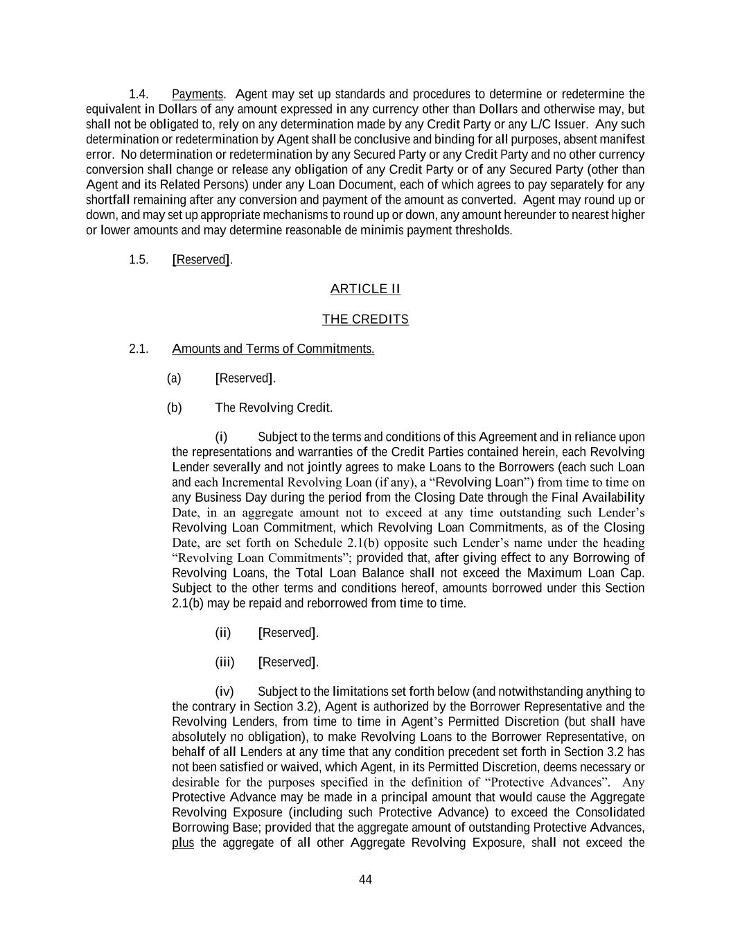 44 1.4. Payments. Agent may set up standards and procedures to determine or redetermine the equivalent in Dollars of any amount expressed in any currency other than Dollars and otherwise may, but shall not be obligated to, rely on any determination made by any Credit Party or any L/C Issuer. Any such determination or redetermination by Agent shall be conclusive and binding for all purposes, absent manifest error. No determination or redetermination by any Secured Party or any Credit Party and no other currency conversion shall change or release any obligation of any Credit Party or of any Secured Party (other than Agent and its Related Persons) under any Loan Document, each of which agrees to pay separately for any shortfall remaining after any conversion and payment of the amount as converted. Agent may round up or down, and may set up appropriate mechanisms to round up or down, any amount hereunder to nearest higher or lower amounts and may determine reasonable de minimis payment thresholds. 1.5. [Reserved]. ARTICLE II THE CREDITS 2.1. Amounts and Terms of Commitments. (a) [Reserved]. (b) The Revolving Credit. (i) Subject to the terms and conditions of this Agreement and in reliance upon the representations and warranties of the Credit Parties contained herein, each Revolving Lender severally and not jointly agrees to make Loans to the Borrowers (each such Loan and each Incremental Revolving Loan (if any), a “Revolving Loan”) from time to time on any Business Day during the period from the Closing Date through the Final Availability Date, in an aggregate amount not to exceed at any time outstanding such Lender’s Revolving Loan Commitment, which Revolving Loan Commitments, as of the Closing Date, are set forth on Schedule 2.1(b) opposite such Lender’s name under the heading “Revolving Loan Commitments”; provided that, after giving effect to any Borrowing of Revolving Loans, the Total Loan Balance shall not exceed the Maximum Loan Cap. Subject to the other terms and conditions hereof, amounts borrowed under this Section 2.1(b) may be repaid and reborrowed from time to time. (ii) [Reserved]. (iii) [Reserved]. (iv) Subject to the limitations set forth below (and notwithstanding anything to the contrary in Section 3.2), Agent is authorized by the Borrower Representative and the Revolving Lenders, from time to time in Agent’s Permitted Discretion (but shall have absolutely no obligation), to make Revolving Loans to the Borrower Representative, on behalf of all Lenders at any time that any condition precedent set forth in Section 3.2 has not been satisfied or waived, which Agent, in its Permitted Discretion, deems necessary or desirable for the purposes specified in the definition of “Protective Advances”. Any Protective Advance may be made in a principal amount that would cause the Aggregate Revolving Exposure (including such Protective Advance) to exceed the Consolidated Borrowing Base; provided that the aggregate amount of outstanding Protective Advances, plus the aggregate of all other Aggregate Revolving Exposure, shall not exceed the