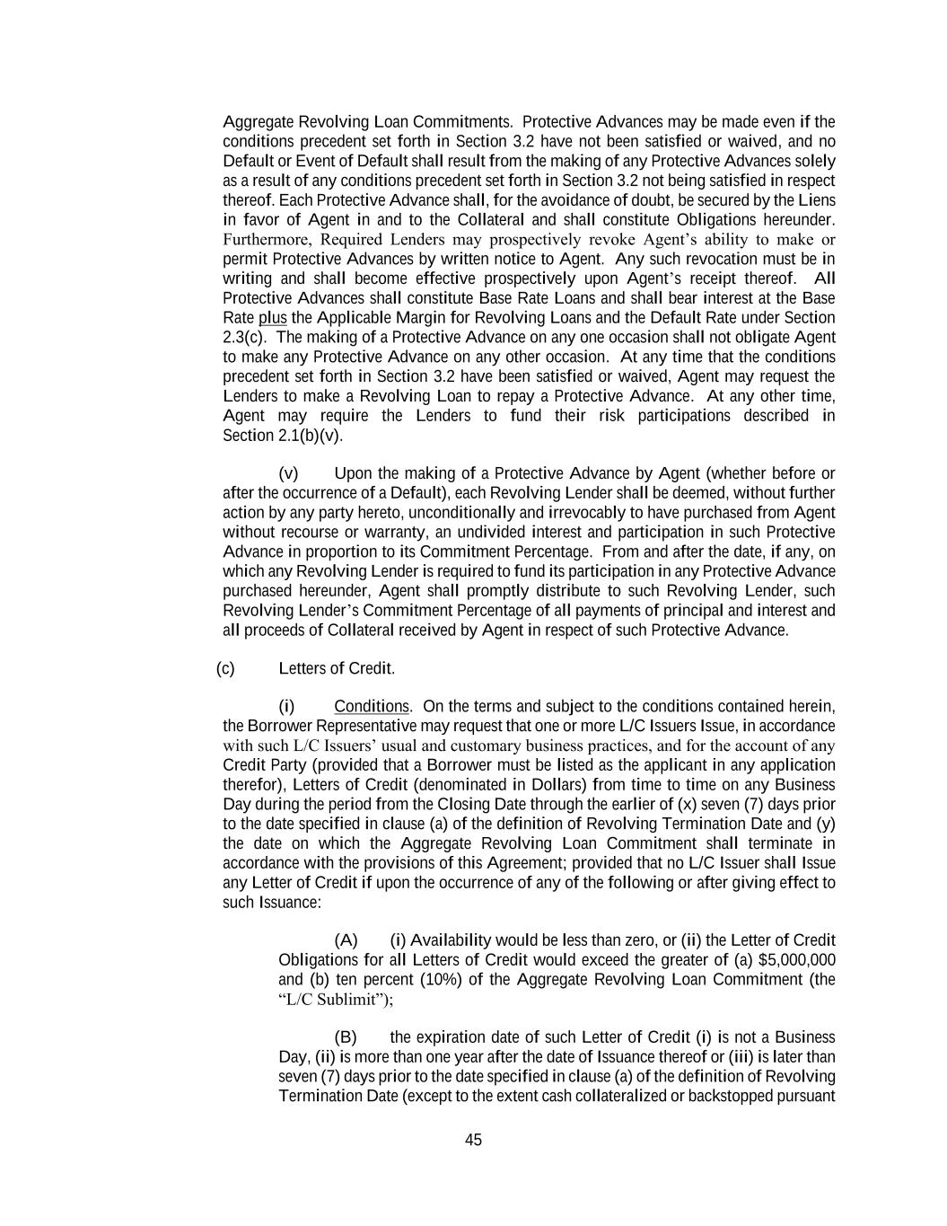 45 Aggregate Revolving Loan Commitments. Protective Advances may be made even if the conditions precedent set forth in Section 3.2 have not been satisfied or waived, and no Default or Event of Default shall result from the making of any Protective Advances solely as a result of any conditions precedent set forth in Section 3.2 not being satisfied in respect thereof. Each Protective Advance shall, for the avoidance of doubt, be secured by the Liens in favor of Agent in and to the Collateral and shall constitute Obligations hereunder. Furthermore, Required Lenders may prospectively revoke Agent’s ability to make or permit Protective Advances by written notice to Agent. Any such revocation must be in writing and shall become effective prospectively upon Agent’s receipt thereof. All Protective Advances shall constitute Base Rate Loans and shall bear interest at the Base Rate plus the Applicable Margin for Revolving Loans and the Default Rate under Section 2.3(c). The making of a Protective Advance on any one occasion shall not obligate Agent to make any Protective Advance on any other occasion. At any time that the conditions precedent set forth in Section 3.2 have been satisfied or waived, Agent may request the Lenders to make a Revolving Loan to repay a Protective Advance. At any other time, Agent may require the Lenders to fund their risk participations described in Section 2.1(b)(v). (v) Upon the making of a Protective Advance by Agent (whether before or after the occurrence of a Default), each Revolving Lender shall be deemed, without further action by any party hereto, unconditionally and irrevocably to have purchased from Agent without recourse or warranty, an undivided interest and participation in such Protective Advance in proportion to its Commitment Percentage. From and after the date, if any, on which any Revolving Lender is required to fund its participation in any Protective Advance purchased hereunder, Agent shall promptly distribute to such Revolving Lender, such Revolving Lender’s Commitment Percentage of all payments of principal and interest and all proceeds of Collateral received by Agent in respect of such Protective Advance. (c) Letters of Credit. (i) Conditions. On the terms and subject to the conditions contained herein, the Borrower Representative may request that one or more L/C Issuers Issue, in accordance with such L/C Issuers’ usual and customary business practices, and for the account of any Credit Party (provided that a Borrower must be listed as the applicant in any application therefor), Letters of Credit (denominated in Dollars) from time to time on any Business Day during the period from the Closing Date through the earlier of (x) seven (7) days prior to the date specified in clause (a) of the definition of Revolving Termination Date and (y) the date on which the Aggregate Revolving Loan Commitment shall terminate in accordance with the provisions of this Agreement; provided that no L/C Issuer shall Issue any Letter of Credit if upon the occurrence of any of the following or after giving effect to such Issuance: (A) (i) Availability would be less than zero, or (ii) the Letter of Credit Obligations for all Letters of Credit would exceed the greater of (a) $5,000,000 and (b) ten percent (10%) of the Aggregate Revolving Loan Commitment (the “L/C Sublimit”); (B) the expiration date of such Letter of Credit (i) is not a Business Day, (ii) is more than one year after the date of Issuance thereof or (iii) is later than seven (7) days prior to the date specified in clause (a) of the definition of Revolving Termination Date (except to the extent cash collateralized or backstopped pursuant