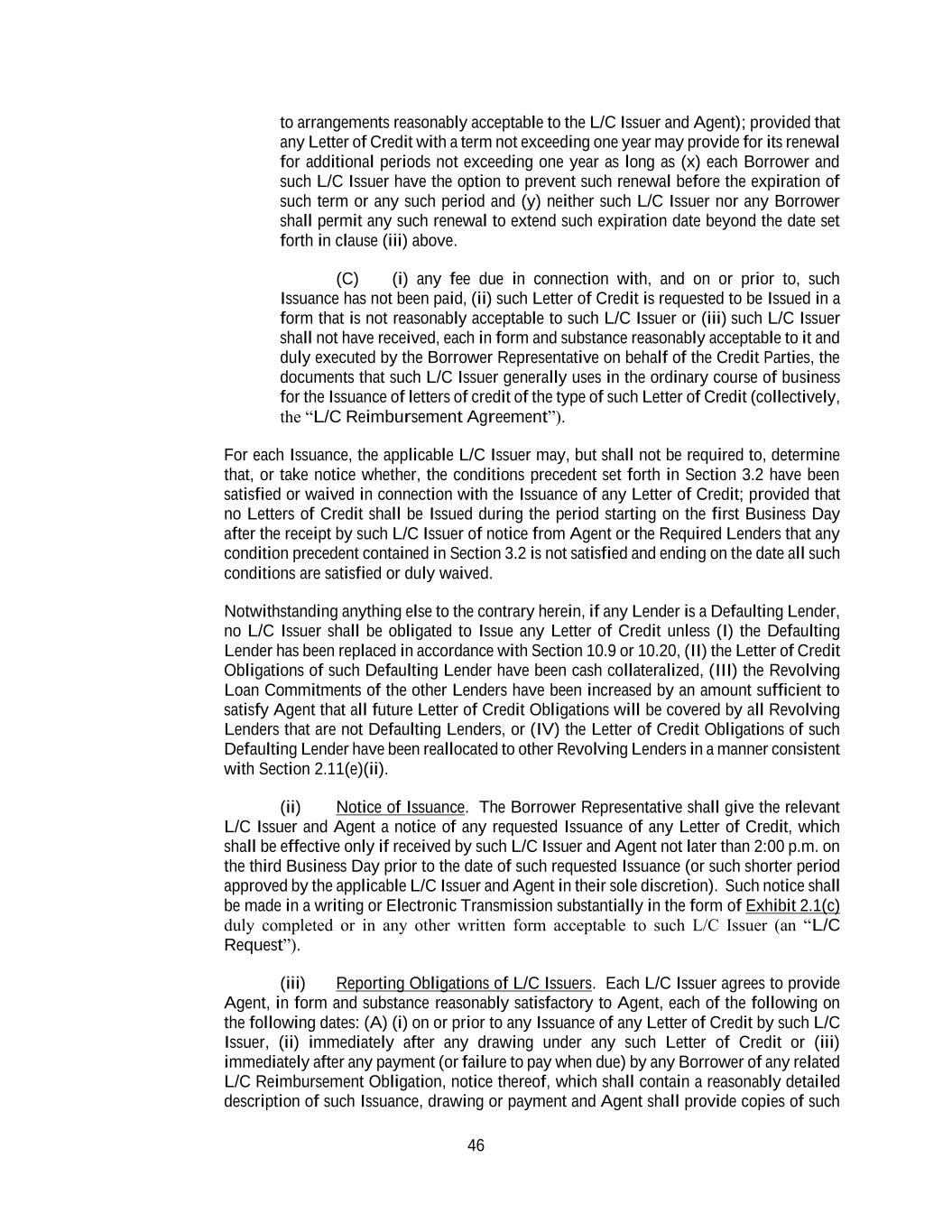 46 to arrangements reasonably acceptable to the L/C Issuer and Agent); provided that any Letter of Credit with a term not exceeding one year may provide for its renewal for additional periods not exceeding one year as long as (x) each Borrower and such L/C Issuer have the option to prevent such renewal before the expiration of such term or any such period and (y) neither such L/C Issuer nor any Borrower shall permit any such renewal to extend such expiration date beyond the date set forth in clause (iii) above. (C) (i) any fee due in connection with, and on or prior to, such Issuance has not been paid, (ii) such Letter of Credit is requested to be Issued in a form that is not reasonably acceptable to such L/C Issuer or (iii) such L/C Issuer shall not have received, each in form and substance reasonably acceptable to it and duly executed by the Borrower Representative on behalf of the Credit Parties, the documents that such L/C Issuer generally uses in the ordinary course of business for the Issuance of letters of credit of the type of such Letter of Credit (collectively, the “L/C Reimbursement Agreement”). For each Issuance, the applicable L/C Issuer may, but shall not be required to, determine that, or take notice whether, the conditions precedent set forth in Section 3.2 have been satisfied or waived in connection with the Issuance of any Letter of Credit; provided that no Letters of Credit shall be Issued during the period starting on the first Business Day after the receipt by such L/C Issuer of notice from Agent or the Required Lenders that any condition precedent contained in Section 3.2 is not satisfied and ending on the date all such conditions are satisfied or duly waived. Notwithstanding anything else to the contrary herein, if any Lender is a Defaulting Lender, no L/C Issuer shall be obligated to Issue any Letter of Credit unless (I) the Defaulting Lender has been replaced in accordance with Section 10.9 or 10.20, (II) the Letter of Credit Obligations of such Defaulting Lender have been cash collateralized, (III) the Revolving Loan Commitments of the other Lenders have been increased by an amount sufficient to satisfy Agent that all future Letter of Credit Obligations will be covered by all Revolving Lenders that are not Defaulting Lenders, or (IV) the Letter of Credit Obligations of such Defaulting Lender have been reallocated to other Revolving Lenders in a manner consistent with Section 2.11(e)(ii). (ii) Notice of Issuance. The Borrower Representative shall give the relevant L/C Issuer and Agent a notice of any requested Issuance of any Letter of Credit, which shall be effective only if received by such L/C Issuer and Agent not later than 2:00 p.m. on the third Business Day prior to the date of such requested Issuance (or such shorter period approved by the applicable L/C Issuer and Agent in their sole discretion). Such notice shall be made in a writing or Electronic Transmission substantially in the form of Exhibit 2.1(c) duly completed or in any other written form acceptable to such L/C Issuer (an “L/C Request”). (iii) Reporting Obligations of L/C Issuers. Each L/C Issuer agrees to provide Agent, in form and substance reasonably satisfactory to Agent, each of the following on the following dates: (A) (i) on or prior to any Issuance of any Letter of Credit by such L/C Issuer, (ii) immediately after any drawing under any such Letter of Credit or (iii) immediately after any payment (or failure to pay when due) by any Borrower of any related L/C Reimbursement Obligation, notice thereof, which shall contain a reasonably detailed description of such Issuance, drawing or payment and Agent shall provide copies of such