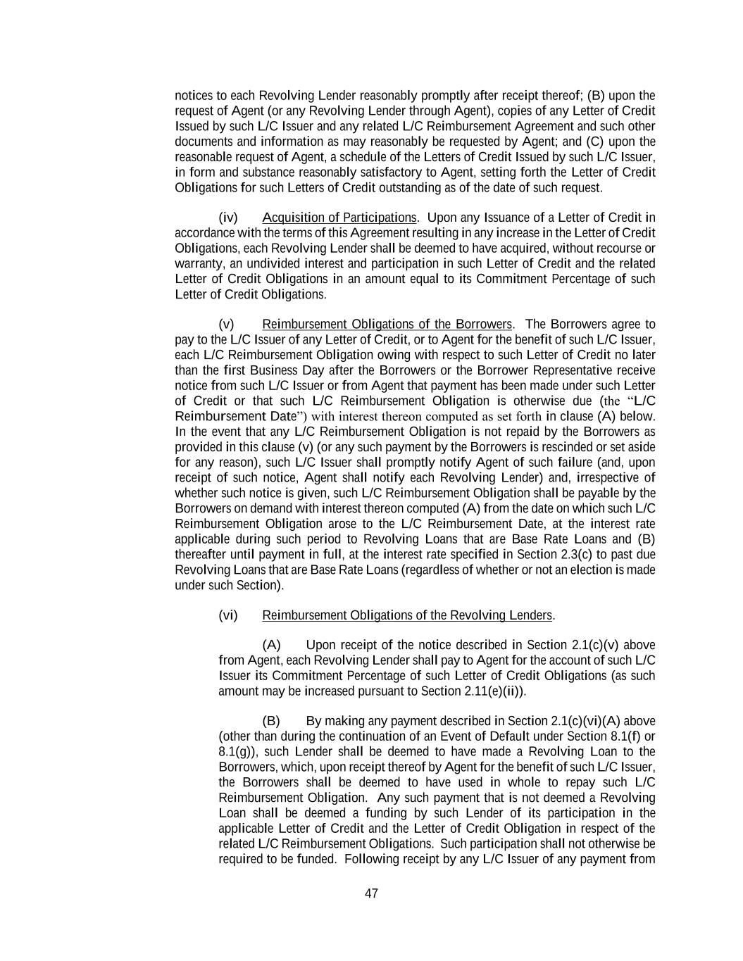 47 notices to each Revolving Lender reasonably promptly after receipt thereof; (B) upon the request of Agent (or any Revolving Lender through Agent), copies of any Letter of Credit Issued by such L/C Issuer and any related L/C Reimbursement Agreement and such other documents and information as may reasonably be requested by Agent; and (C) upon the reasonable request of Agent, a schedule of the Letters of Credit Issued by such L/C Issuer, in form and substance reasonably satisfactory to Agent, setting forth the Letter of Credit Obligations for such Letters of Credit outstanding as of the date of such request. (iv) Acquisition of Participations. Upon any Issuance of a Letter of Credit in accordance with the terms of this Agreement resulting in any increase in the Letter of Credit Obligations, each Revolving Lender shall be deemed to have acquired, without recourse or warranty, an undivided interest and participation in such Letter of Credit and the related Letter of Credit Obligations in an amount equal to its Commitment Percentage of such Letter of Credit Obligations. (v) Reimbursement Obligations of the Borrowers. The Borrowers agree to pay to the L/C Issuer of any Letter of Credit, or to Agent for the benefit of such L/C Issuer, each L/C Reimbursement Obligation owing with respect to such Letter of Credit no later than the first Business Day after the Borrowers or the Borrower Representative receive notice from such L/C Issuer or from Agent that payment has been made under such Letter of Credit or that such L/C Reimbursement Obligation is otherwise due (the “L/C Reimbursement Date”) with interest thereon computed as set forth in clause (A) below. In the event that any L/C Reimbursement Obligation is not repaid by the Borrowers as provided in this clause (v) (or any such payment by the Borrowers is rescinded or set aside for any reason), such L/C Issuer shall promptly notify Agent of such failure (and, upon receipt of such notice, Agent shall notify each Revolving Lender) and, irrespective of whether such notice is given, such L/C Reimbursement Obligation shall be payable by the Borrowers on demand with interest thereon computed (A) from the date on which such L/C Reimbursement Obligation arose to the L/C Reimbursement Date, at the interest rate applicable during such period to Revolving Loans that are Base Rate Loans and (B) thereafter until payment in full, at the interest rate specified in Section 2.3(c) to past due Revolving Loans that are Base Rate Loans (regardless of whether or not an election is made under such Section). (vi) Reimbursement Obligations of the Revolving Lenders. (A) Upon receipt of the notice described in Section 2.1(c)(v) above from Agent, each Revolving Lender shall pay to Agent for the account of such L/C Issuer its Commitment Percentage of such Letter of Credit Obligations (as such amount may be increased pursuant to Section 2.11(e)(ii)). (B) By making any payment described in Section 2.1(c)(vi)(A) above (other than during the continuation of an Event of Default under Section 8.1(f) or 8.1(g)), such Lender shall be deemed to have made a Revolving Loan to the Borrowers, which, upon receipt thereof by Agent for the benefit of such L/C Issuer, the Borrowers shall be deemed to have used in whole to repay such L/C Reimbursement Obligation. Any such payment that is not deemed a Revolving Loan shall be deemed a funding by such Lender of its participation in the applicable Letter of Credit and the Letter of Credit Obligation in respect of the related L/C Reimbursement Obligations. Such participation shall not otherwise be required to be funded. Following receipt by any L/C Issuer of any payment from
