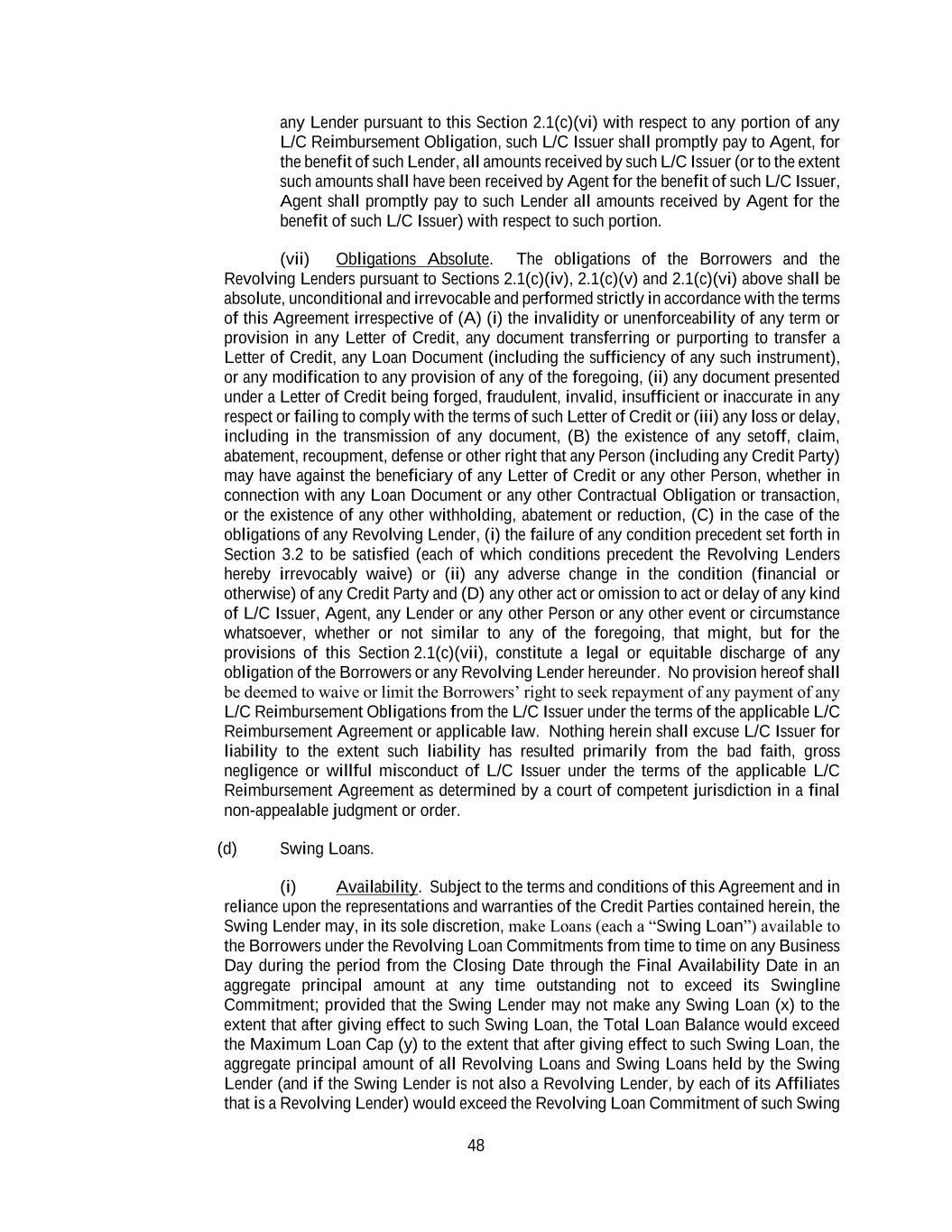48 any Lender pursuant to this Section 2.1(c)(vi) with respect to any portion of any L/C Reimbursement Obligation, such L/C Issuer shall promptly pay to Agent, for the benefit of such Lender, all amounts received by such L/C Issuer (or to the extent such amounts shall have been received by Agent for the benefit of such L/C Issuer, Agent shall promptly pay to such Lender all amounts received by Agent for the benefit of such L/C Issuer) with respect to such portion. (vii) Obligations Absolute. The obligations of the Borrowers and the Revolving Lenders pursuant to Sections 2.1(c)(iv), 2.1(c)(v) and 2.1(c)(vi) above shall be absolute, unconditional and irrevocable and performed strictly in accordance with the terms of this Agreement irrespective of (A) (i) the invalidity or unenforceability of any term or provision in any Letter of Credit, any document transferring or purporting to transfer a Letter of Credit, any Loan Document (including the sufficiency of any such instrument), or any modification to any provision of any of the foregoing, (ii) any document presented under a Letter of Credit being forged, fraudulent, invalid, insufficient or inaccurate in any respect or failing to comply with the terms of such Letter of Credit or (iii) any loss or delay, including in the transmission of any document, (B) the existence of any setoff, claim, abatement, recoupment, defense or other right that any Person (including any Credit Party) may have against the beneficiary of any Letter of Credit or any other Person, whether in connection with any Loan Document or any other Contractual Obligation or transaction, or the existence of any other withholding, abatement or reduction, (C) in the case of the obligations of any Revolving Lender, (i) the failure of any condition precedent set forth in Section 3.2 to be satisfied (each of which conditions precedent the Revolving Lenders hereby irrevocably waive) or (ii) any adverse change in the condition (financial or otherwise) of any Credit Party and (D) any other act or omission to act or delay of any kind of L/C Issuer, Agent, any Lender or any other Person or any other event or circumstance whatsoever, whether or not similar to any of the foregoing, that might, but for the provisions of this Section 2.1(c)(vii), constitute a legal or equitable discharge of any obligation of the Borrowers or any Revolving Lender hereunder. No provision hereof shall be deemed to waive or limit the Borrowers’ right to seek repayment of any payment of any L/C Reimbursement Obligations from the L/C Issuer under the terms of the applicable L/C Reimbursement Agreement or applicable law. Nothing herein shall excuse L/C Issuer for liability to the extent such liability has resulted primarily from the bad faith, gross negligence or willful misconduct of L/C Issuer under the terms of the applicable L/C Reimbursement Agreement as determined by a court of competent jurisdiction in a final non-appealable judgment or order. (d) Swing Loans. (i) Availability. Subject to the terms and conditions of this Agreement and in reliance upon the representations and warranties of the Credit Parties contained herein, the Swing Lender may, in its sole discretion, make Loans (each a “Swing Loan”) available to the Borrowers under the Revolving Loan Commitments from time to time on any Business Day during the period from the Closing Date through the Final Availability Date in an aggregate principal amount at any time outstanding not to exceed its Swingline Commitment; provided that the Swing Lender may not make any Swing Loan (x) to the extent that after giving effect to such Swing Loan, the Total Loan Balance would exceed the Maximum Loan Cap (y) to the extent that after giving effect to such Swing Loan, the aggregate principal amount of all Revolving Loans and Swing Loans held by the Swing Lender (and if the Swing Lender is not also a Revolving Lender, by each of its Affiliates that is a Revolving Lender) would exceed the Revolving Loan Commitment of such Swing