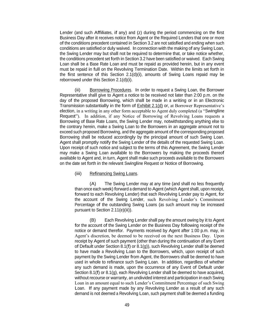 49 Lender (and such Affiliates, if any) and (z) during the period commencing on the first Business Day after it receives notice from Agent or the Required Lenders that one or more of the conditions precedent contained in Section 3.2 are not satisfied and ending when such conditions are satisfied or duly waived. In connection with the making of any Swing Loan, the Swing Lender may but shall not be required to determine that, or take notice whether, the conditions precedent set forth in Section 3.2 have been satisfied or waived. Each Swing Loan shall be a Base Rate Loan and must be repaid as provided herein, but in any event must be repaid in full on the Revolving Termination Date. Within the limits set forth in the first sentence of this Section 2.1(d)(i), amounts of Swing Loans repaid may be reborrowed under this Section 2.1(d)(i). (ii) Borrowing Procedures. In order to request a Swing Loan, the Borrower Representative shall give to Agent a notice to be received not later than 2:00 p.m. on the day of the proposed Borrowing, which shall be made in a writing or in an Electronic Transmission substantially in the form of Exhibit 2.1(d) or, at Borrower Representative’s election, in a writing in any other form acceptable to Agent duly completed (a “Swingline Request”). In addition, if any Notice of Borrowing of Revolving Loans requests a Borrowing of Base Rate Loans, the Swing Lender may, notwithstanding anything else to the contrary herein, make a Swing Loan to the Borrowers in an aggregate amount not to exceed such proposed Borrowing, and the aggregate amount of the corresponding proposed Borrowing shall be reduced accordingly by the principal amount of such Swing Loan. Agent shall promptly notify the Swing Lender of the details of the requested Swing Loan. Upon receipt of such notice and subject to the terms of this Agreement, the Swing Lender may make a Swing Loan available to the Borrowers by making the proceeds thereof available to Agent and, in turn, Agent shall make such proceeds available to the Borrowers on the date set forth in the relevant Swingline Request or Notice of Borrowing. (iii) Refinancing Swing Loans. (A) The Swing Lender may at any time (and shall no less frequently than once each week) forward a demand to Agent (which Agent shall, upon receipt, forward to each Revolving Lender) that each Revolving Lender pay to Agent, for the account of the Swing Lender, such Revolving Lender’s Commitment Percentage of the outstanding Swing Loans (as such amount may be increased pursuant to Section 2.11(e)(ii)). (B) Each Revolving Lender shall pay the amount owing by it to Agent for the account of the Swing Lender on the Business Day following receipt of the notice or demand therefor. Payments received by Agent after 1:00 p.m. may, in Agent’s discretion, be deemed to be received on the next Business Day. Upon receipt by Agent of such payment (other than during the continuation of any Event of Default under Section 8.1(f) or 8.1(g)), such Revolving Lender shall be deemed to have made a Revolving Loan to the Borrowers, which, upon receipt of such payment by the Swing Lender from Agent, the Borrowers shall be deemed to have used in whole to refinance such Swing Loan. In addition, regardless of whether any such demand is made, upon the occurrence of any Event of Default under Section 8.1(f) or 8.1(g), each Revolving Lender shall be deemed to have acquired, without recourse or warranty, an undivided interest and participation in each Swing Loan in an amount equal to such Lender’s Commitment Percentage of such Swing Loan. If any payment made by any Revolving Lender as a result of any such demand is not deemed a Revolving Loan, such payment shall be deemed a funding