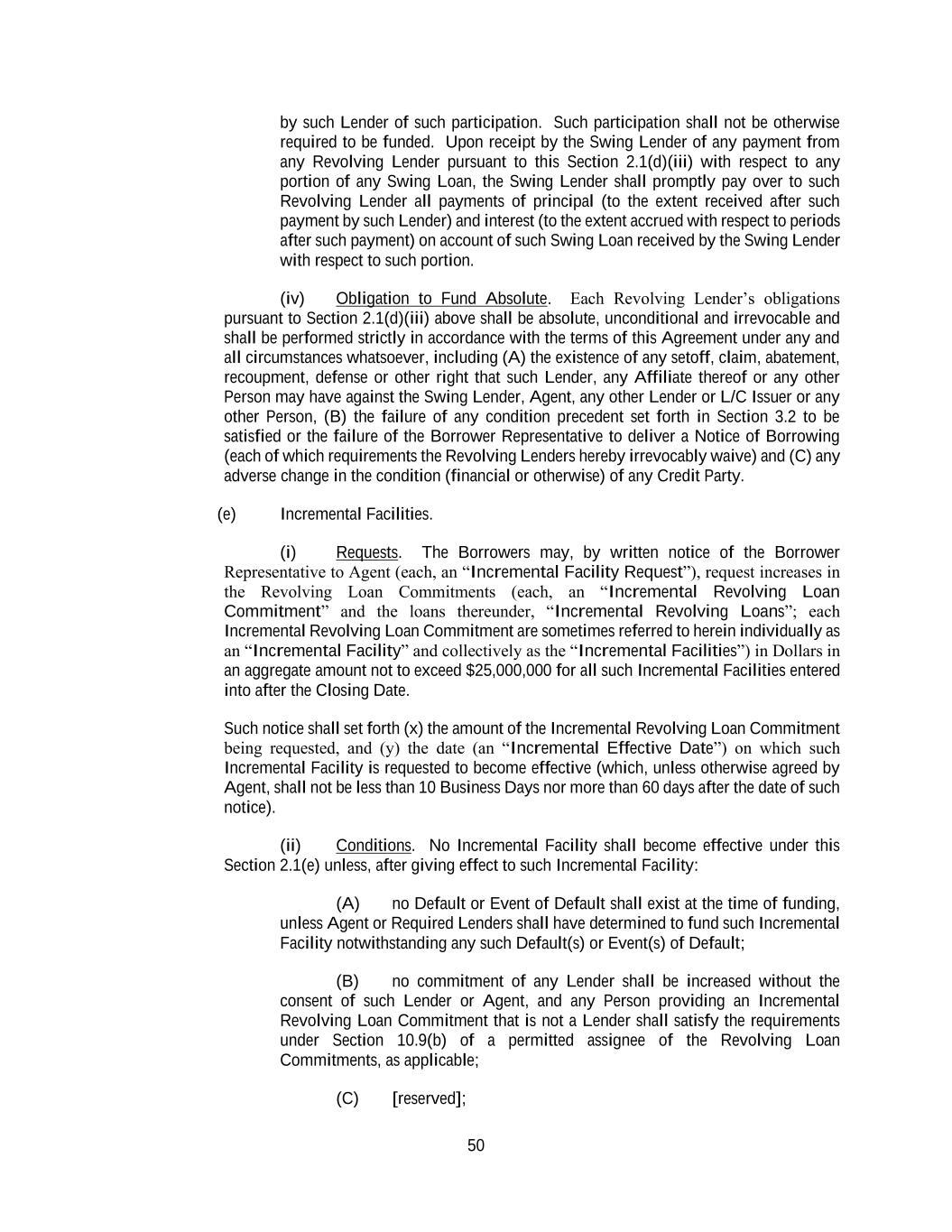 50 by such Lender of such participation. Such participation shall not be otherwise required to be funded. Upon receipt by the Swing Lender of any payment from any Revolving Lender pursuant to this Section 2.1(d)(iii) with respect to any portion of any Swing Loan, the Swing Lender shall promptly pay over to such Revolving Lender all payments of principal (to the extent received after such payment by such Lender) and interest (to the extent accrued with respect to periods after such payment) on account of such Swing Loan received by the Swing Lender with respect to such portion. (iv) Obligation to Fund Absolute. Each Revolving Lender’s obligations pursuant to Section 2.1(d)(iii) above shall be absolute, unconditional and irrevocable and shall be performed strictly in accordance with the terms of this Agreement under any and all circumstances whatsoever, including (A) the existence of any setoff, claim, abatement, recoupment, defense or other right that such Lender, any Affiliate thereof or any other Person may have against the Swing Lender, Agent, any other Lender or L/C Issuer or any other Person, (B) the failure of any condition precedent set forth in Section 3.2 to be satisfied or the failure of the Borrower Representative to deliver a Notice of Borrowing (each of which requirements the Revolving Lenders hereby irrevocably waive) and (C) any adverse change in the condition (financial or otherwise) of any Credit Party. (e) Incremental Facilities. (i) Requests. The Borrowers may, by written notice of the Borrower Representative to Agent (each, an “Incremental Facility Request”), request increases in the Revolving Loan Commitments (each, an “Incremental Revolving Loan Commitment” and the loans thereunder, “Incremental Revolving Loans”; each Incremental Revolving Loan Commitment are sometimes referred to herein individually as an “Incremental Facility” and collectively as the “Incremental Facilities”) in Dollars in an aggregate amount not to exceed $25,000,000 for all such Incremental Facilities entered into after the Closing Date. Such notice shall set forth (x) the amount of the Incremental Revolving Loan Commitment being requested, and (y) the date (an “Incremental Effective Date”) on which such Incremental Facility is requested to become effective (which, unless otherwise agreed by Agent, shall not be less than 10 Business Days nor more than 60 days after the date of such notice). (ii) Conditions. No Incremental Facility shall become effective under this Section 2.1(e) unless, after giving effect to such Incremental Facility: (A) no Default or Event of Default shall exist at the time of funding, unless Agent or Required Lenders shall have determined to fund such Incremental Facility notwithstanding any such Default(s) or Event(s) of Default; (B) no commitment of any Lender shall be increased without the consent of such Lender or Agent, and any Person providing an Incremental Revolving Loan Commitment that is not a Lender shall satisfy the requirements under Section 10.9(b) of a permitted assignee of the Revolving Loan Commitments, as applicable; (C) [reserved];