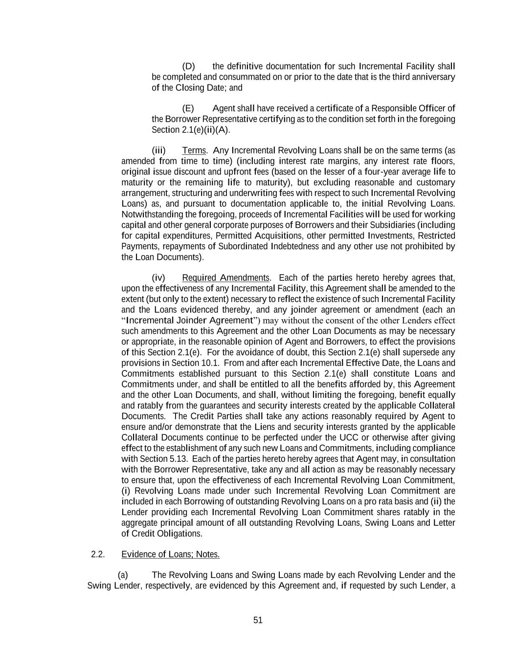 51 (D) the definitive documentation for such Incremental Facility shall be completed and consummated on or prior to the date that is the third anniversary of the Closing Date; and (E) Agent shall have received a certificate of a Responsible Officer of the Borrower Representative certifying as to the condition set forth in the foregoing Section 2.1(e)(ii)(A). (iii) Terms. Any Incremental Revolving Loans shall be on the same terms (as amended from time to time) (including interest rate margins, any interest rate floors, original issue discount and upfront fees (based on the lesser of a four-year average life to maturity or the remaining life to maturity), but excluding reasonable and customary arrangement, structuring and underwriting fees with respect to such Incremental Revolving Loans) as, and pursuant to documentation applicable to, the initial Revolving Loans. Notwithstanding the foregoing, proceeds of Incremental Facilities will be used for working capital and other general corporate purposes of Borrowers and their Subsidiaries (including for capital expenditures, Permitted Acquisitions, other permitted Investments, Restricted Payments, repayments of Subordinated Indebtedness and any other use not prohibited by the Loan Documents). (iv) Required Amendments. Each of the parties hereto hereby agrees that, upon the effectiveness of any Incremental Facility, this Agreement shall be amended to the extent (but only to the extent) necessary to reflect the existence of such Incremental Facility and the Loans evidenced thereby, and any joinder agreement or amendment (each an “Incremental Joinder Agreement”) may without the consent of the other Lenders effect such amendments to this Agreement and the other Loan Documents as may be necessary or appropriate, in the reasonable opinion of Agent and Borrowers, to effect the provisions of this Section 2.1(e). For the avoidance of doubt, this Section 2.1(e) shall supersede any provisions in Section 10.1. From and after each Incremental Effective Date, the Loans and Commitments established pursuant to this Section 2.1(e) shall constitute Loans and Commitments under, and shall be entitled to all the benefits afforded by, this Agreement and the other Loan Documents, and shall, without limiting the foregoing, benefit equally and ratably from the guarantees and security interests created by the applicable Collateral Documents. The Credit Parties shall take any actions reasonably required by Agent to ensure and/or demonstrate that the Liens and security interests granted by the applicable Collateral Documents continue to be perfected under the UCC or otherwise after giving effect to the establishment of any such new Loans and Commitments, including compliance with Section 5.13. Each of the parties hereto hereby agrees that Agent may, in consultation with the Borrower Representative, take any and all action as may be reasonably necessary to ensure that, upon the effectiveness of each Incremental Revolving Loan Commitment, (i) Revolving Loans made under such Incremental Revolving Loan Commitment are included in each Borrowing of outstanding Revolving Loans on a pro rata basis and (ii) the Lender providing each Incremental Revolving Loan Commitment shares ratably in the aggregate principal amount of all outstanding Revolving Loans, Swing Loans and Letter of Credit Obligations. 2.2. Evidence of Loans; Notes. (a) The Revolving Loans and Swing Loans made by each Revolving Lender and the Swing Lender, respectively, are evidenced by this Agreement and, if requested by such Lender, a
