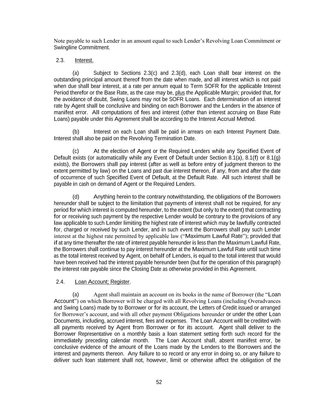 52 Note payable to such Lender in an amount equal to such Lender’s Revolving Loan Commitment or Swingline Commitment. 2.3. Interest. (a) Subject to Sections 2.3(c) and 2.3(d), each Loan shall bear interest on the outstanding principal amount thereof from the date when made, and all interest which is not paid when due shall bear interest, at a rate per annum equal to Term SOFR for the applicable Interest Period therefor or the Base Rate, as the case may be, plus the Applicable Margin; provided that, for the avoidance of doubt, Swing Loans may not be SOFR Loans. Each determination of an interest rate by Agent shall be conclusive and binding on each Borrower and the Lenders in the absence of manifest error. All computations of fees and interest (other than interest accruing on Base Rate Loans) payable under this Agreement shall be according to the Interest Accrual Method. (b) Interest on each Loan shall be paid in arrears on each Interest Payment Date. Interest shall also be paid on the Revolving Termination Date. (c) At the election of Agent or the Required Lenders while any Specified Event of Default exists (or automatically while any Event of Default under Section 8.1(a), 8.1(f) or 8.1(g) exists), the Borrowers shall pay interest (after as well as before entry of judgment thereon to the extent permitted by law) on the Loans and past due interest thereon, if any, from and after the date of occurrence of such Specified Event of Default, at the Default Rate. All such interest shall be payable in cash on demand of Agent or the Required Lenders. (d) Anything herein to the contrary notwithstanding, the obligations of the Borrowers hereunder shall be subject to the limitation that payments of interest shall not be required, for any period for which interest is computed hereunder, to the extent (but only to the extent) that contracting for or receiving such payment by the respective Lender would be contrary to the provisions of any law applicable to such Lender limiting the highest rate of interest which may be lawfully contracted for, charged or received by such Lender, and in such event the Borrowers shall pay such Lender interest at the highest rate permitted by applicable law (“Maximum Lawful Rate”); provided that if at any time thereafter the rate of interest payable hereunder is less than the Maximum Lawful Rate, the Borrowers shall continue to pay interest hereunder at the Maximum Lawful Rate until such time as the total interest received by Agent, on behalf of Lenders, is equal to the total interest that would have been received had the interest payable hereunder been (but for the operation of this paragraph) the interest rate payable since the Closing Date as otherwise provided in this Agreement. 2.4. Loan Account; Register. (a) Agent shall maintain an account on its books in the name of Borrower (the “Loan Account”) on which Borrower will be charged with all Revolving Loans (including Overadvances and Swing Loans) made by to Borrower or for its account, the Letters of Credit issued or arranged for Borrower’s account, and with all other payment Obligations hereunder or under the other Loan Documents, including, accrued interest, fees and expenses. The Loan Account will be credited with all payments received by Agent from Borrower or for its account. Agent shall deliver to the Borrower Representative on a monthly basis a loan statement setting forth such record for the immediately preceding calendar month. The Loan Account shall, absent manifest error, be conclusive evidence of the amount of the Loans made by the Lenders to the Borrowers and the interest and payments thereon. Any failure to so record or any error in doing so, or any failure to deliver such loan statement shall not, however, limit or otherwise affect the obligation of the