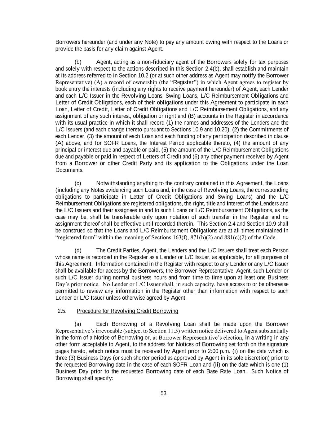 53 Borrowers hereunder (and under any Note) to pay any amount owing with respect to the Loans or provide the basis for any claim against Agent. (b) Agent, acting as a non-fiduciary agent of the Borrowers solely for tax purposes and solely with respect to the actions described in this Section 2.4(b), shall establish and maintain at its address referred to in Section 10.2 (or at such other address as Agent may notify the Borrower Representative) (A) a record of ownership (the “Register”) in which Agent agrees to register by book entry the interests (including any rights to receive payment hereunder) of Agent, each Lender and each L/C Issuer in the Revolving Loans, Swing Loans, L/C Reimbursement Obligations and Letter of Credit Obligations, each of their obligations under this Agreement to participate in each Loan, Letter of Credit, Letter of Credit Obligations and L/C Reimbursement Obligations, and any assignment of any such interest, obligation or right and (B) accounts in the Register in accordance with its usual practice in which it shall record (1) the names and addresses of the Lenders and the L/C Issuers (and each change thereto pursuant to Sections 10.9 and 10.20), (2) the Commitments of each Lender, (3) the amount of each Loan and each funding of any participation described in clause (A) above, and for SOFR Loans, the Interest Period applicable thereto, (4) the amount of any principal or interest due and payable or paid, (5) the amount of the L/C Reimbursement Obligations due and payable or paid in respect of Letters of Credit and (6) any other payment received by Agent from a Borrower or other Credit Party and its application to the Obligations under the Loan Documents. (c) Notwithstanding anything to the contrary contained in this Agreement, the Loans (including any Notes evidencing such Loans and, in the case of Revolving Loans, the corresponding obligations to participate in Letter of Credit Obligations and Swing Loans) and the L/C Reimbursement Obligations are registered obligations, the right, title and interest of the Lenders and the L/C Issuers and their assignees in and to such Loans or L/C Reimbursement Obligations, as the case may be, shall be transferable only upon notation of such transfer in the Register and no assignment thereof shall be effective until recorded therein. This Section 2.4 and Section 10.9 shall be construed so that the Loans and L/C Reimbursement Obligations are at all times maintained in “registered form” within the meaning of Sections 163(f), 871(h)(2) and 881(c)(2) of the Code. (d) The Credit Parties, Agent, the Lenders and the L/C Issuers shall treat each Person whose name is recorded in the Register as a Lender or L/C Issuer, as applicable, for all purposes of this Agreement. Information contained in the Register with respect to any Lender or any L/C Issuer shall be available for access by the Borrowers, the Borrower Representative, Agent, such Lender or such L/C Issuer during normal business hours and from time to time upon at least one Business Day’s prior notice. No Lender or L/C Issuer shall, in such capacity, have access to or be otherwise permitted to review any information in the Register other than information with respect to such Lender or L/C Issuer unless otherwise agreed by Agent. 2.5. Procedure for Revolving Credit Borrowing (a) Each Borrowing of a Revolving Loan shall be made upon the Borrower Representative’s irrevocable (subject to Section 11.5) written notice delivered to Agent substantially in the form of a Notice of Borrowing or, at Borrower Representative’s election, in a writing in any other form acceptable to Agent, to the address for Notices of Borrowing set forth on the signature pages hereto, which notice must be received by Agent prior to 2:00 p.m. (i) on the date which is three (3) Business Days (or such shorter period as approved by Agent in its sole discretion) prior to the requested Borrowing date in the case of each SOFR Loan and (ii) on the date which is one (1) Business Day prior to the requested Borrowing date of each Base Rate Loan. Such Notice of Borrowing shall specify: