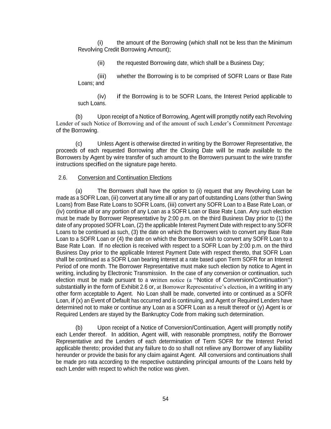 54 (i) the amount of the Borrowing (which shall not be less than the Minimum Revolving Credit Borrowing Amount); (ii) the requested Borrowing date, which shall be a Business Day; (iii) whether the Borrowing is to be comprised of SOFR Loans or Base Rate Loans; and (iv) if the Borrowing is to be SOFR Loans, the Interest Period applicable to such Loans. (b) Upon receipt of a Notice of Borrowing, Agent will promptly notify each Revolving Lender of such Notice of Borrowing and of the amount of such Lender’s Commitment Percentage of the Borrowing. (c) Unless Agent is otherwise directed in writing by the Borrower Representative, the proceeds of each requested Borrowing after the Closing Date will be made available to the Borrowers by Agent by wire transfer of such amount to the Borrowers pursuant to the wire transfer instructions specified on the signature page hereto. 2.6. Conversion and Continuation Elections (a) The Borrowers shall have the option to (i) request that any Revolving Loan be made as a SOFR Loan, (ii) convert at any time all or any part of outstanding Loans (other than Swing Loans) from Base Rate Loans to SOFR Loans, (iii) convert any SOFR Loan to a Base Rate Loan, or (iv) continue all or any portion of any Loan as a SOFR Loan or Base Rate Loan. Any such election must be made by Borrower Representative by 2:00 p.m. on the third Business Day prior to (1) the date of any proposed SOFR Loan, (2) the applicable Interest Payment Date with respect to any SOFR Loans to be continued as such, (3) the date on which the Borrowers wish to convert any Base Rate Loan to a SOFR Loan or (4) the date on which the Borrowers wish to convert any SOFR Loan to a Base Rate Loan. If no election is received with respect to a SOFR Loan by 2:00 p.m. on the third Business Day prior to the applicable Interest Payment Date with respect thereto, that SOFR Loan shall be continued as a SOFR Loan bearing interest at a rate based upon Term SOFR for an Interest Period of one month. The Borrower Representative must make such election by notice to Agent in writing, including by Electronic Transmission. In the case of any conversion or continuation, such election must be made pursuant to a written notice (a “Notice of Conversion/Continuation”) substantially in the form of Exhibit 2.6 or, at Borrower Representative’s election, in a writing in any other form acceptable to Agent. No Loan shall be made, converted into or continued as a SOFR Loan, if (x) an Event of Default has occurred and is continuing, and Agent or Required Lenders have determined not to make or continue any Loan as a SOFR Loan as a result thereof or (y) Agent is or Required Lenders are stayed by the Bankruptcy Code from making such determination. (b) Upon receipt of a Notice of Conversion/Continuation, Agent will promptly notify each Lender thereof. In addition, Agent will, with reasonable promptness, notify the Borrower Representative and the Lenders of each determination of Term SOFR for the Interest Period applicable thereto; provided that any failure to do so shall not relieve any Borrower of any liability hereunder or provide the basis for any claim against Agent. All conversions and continuations shall be made pro rata according to the respective outstanding principal amounts of the Loans held by each Lender with respect to which the notice was given.