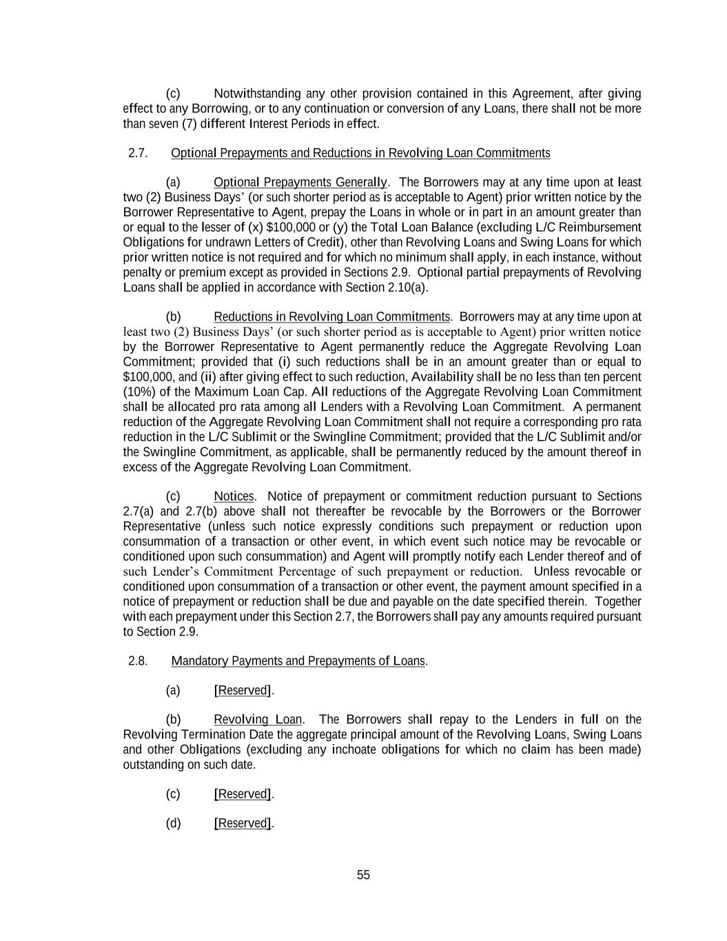 55 (c) Notwithstanding any other provision contained in this Agreement, after giving effect to any Borrowing, or to any continuation or conversion of any Loans, there shall not be more than seven (7) different Interest Periods in effect. 2.7. Optional Prepayments and Reductions in Revolving Loan Commitments (a) Optional Prepayments Generally. The Borrowers may at any time upon at least two (2) Business Days’ (or such shorter period as is acceptable to Agent) prior written notice by the Borrower Representative to Agent, prepay the Loans in whole or in part in an amount greater than or equal to the lesser of (x) $100,000 or (y) the Total Loan Balance (excluding L/C Reimbursement Obligations for undrawn Letters of Credit), other than Revolving Loans and Swing Loans for which prior written notice is not required and for which no minimum shall apply, in each instance, without penalty or premium except as provided in Sections 2.9. Optional partial prepayments of Revolving Loans shall be applied in accordance with Section 2.10(a). (b) Reductions in Revolving Loan Commitments. Borrowers may at any time upon at least two (2) Business Days’ (or such shorter period as is acceptable to Agent) prior written notice by the Borrower Representative to Agent permanently reduce the Aggregate Revolving Loan Commitment; provided that (i) such reductions shall be in an amount greater than or equal to $100,000, and (ii) after giving effect to such reduction, Availability shall be no less than ten percent (10%) of the Maximum Loan Cap. All reductions of the Aggregate Revolving Loan Commitment shall be allocated pro rata among all Lenders with a Revolving Loan Commitment. A permanent reduction of the Aggregate Revolving Loan Commitment shall not require a corresponding pro rata reduction in the L/C Sublimit or the Swingline Commitment; provided that the L/C Sublimit and/or the Swingline Commitment, as applicable, shall be permanently reduced by the amount thereof in excess of the Aggregate Revolving Loan Commitment. (c) Notices. Notice of prepayment or commitment reduction pursuant to Sections 2.7(a) and 2.7(b) above shall not thereafter be revocable by the Borrowers or the Borrower Representative (unless such notice expressly conditions such prepayment or reduction upon consummation of a transaction or other event, in which event such notice may be revocable or conditioned upon such consummation) and Agent will promptly notify each Lender thereof and of such Lender’s Commitment Percentage of such prepayment or reduction. Unless revocable or conditioned upon consummation of a transaction or other event, the payment amount specified in a notice of prepayment or reduction shall be due and payable on the date specified therein. Together with each prepayment under this Section 2.7, the Borrowers shall pay any amounts required pursuant to Section 2.9. 2.8. Mandatory Payments and Prepayments of Loans. (a) [Reserved]. (b) Revolving Loan. The Borrowers shall repay to the Lenders in full on the Revolving Termination Date the aggregate principal amount of the Revolving Loans, Swing Loans and other Obligations (excluding any inchoate obligations for which no claim has been made) outstanding on such date. (c) [Reserved]. (d) [Reserved].