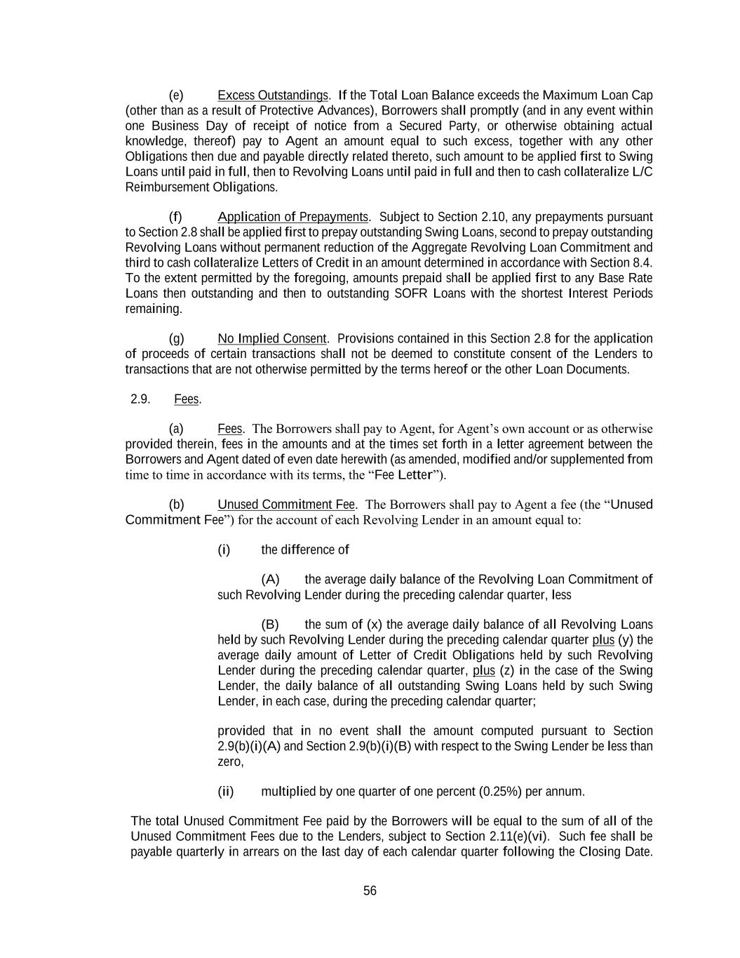 56 (e) Excess Outstandings. If the Total Loan Balance exceeds the Maximum Loan Cap (other than as a result of Protective Advances), Borrowers shall promptly (and in any event within one Business Day of receipt of notice from a Secured Party, or otherwise obtaining actual knowledge, thereof) pay to Agent an amount equal to such excess, together with any other Obligations then due and payable directly related thereto, such amount to be applied first to Swing Loans until paid in full, then to Revolving Loans until paid in full and then to cash collateralize L/C Reimbursement Obligations. (f) Application of Prepayments. Subject to Section 2.10, any prepayments pursuant to Section 2.8 shall be applied first to prepay outstanding Swing Loans, second to prepay outstanding Revolving Loans without permanent reduction of the Aggregate Revolving Loan Commitment and third to cash collateralize Letters of Credit in an amount determined in accordance with Section 8.4. To the extent permitted by the foregoing, amounts prepaid shall be applied first to any Base Rate Loans then outstanding and then to outstanding SOFR Loans with the shortest Interest Periods remaining. (g) No Implied Consent. Provisions contained in this Section 2.8 for the application of proceeds of certain transactions shall not be deemed to constitute consent of the Lenders to transactions that are not otherwise permitted by the terms hereof or the other Loan Documents. 2.9. Fees. (a) Fees. The Borrowers shall pay to Agent, for Agent’s own account or as otherwise provided therein, fees in the amounts and at the times set forth in a letter agreement between the Borrowers and Agent dated of even date herewith (as amended, modified and/or supplemented from time to time in accordance with its terms, the “Fee Letter”). (b) Unused Commitment Fee. The Borrowers shall pay to Agent a fee (the “Unused Commitment Fee”) for the account of each Revolving Lender in an amount equal to: (i) the difference of (A) the average daily balance of the Revolving Loan Commitment of such Revolving Lender during the preceding calendar quarter, less (B) the sum of (x) the average daily balance of all Revolving Loans held by such Revolving Lender during the preceding calendar quarter plus (y) the average daily amount of Letter of Credit Obligations held by such Revolving Lender during the preceding calendar quarter, plus (z) in the case of the Swing Lender, the daily balance of all outstanding Swing Loans held by such Swing Lender, in each case, during the preceding calendar quarter; provided that in no event shall the amount computed pursuant to Section 2.9(b)(i)(A) and Section 2.9(b)(i)(B) with respect to the Swing Lender be less than zero, (ii) multiplied by one quarter of one percent (0.25%) per annum. The total Unused Commitment Fee paid by the Borrowers will be equal to the sum of all of the Unused Commitment Fees due to the Lenders, subject to Section 2.11(e)(vi). Such fee shall be payable quarterly in arrears on the last day of each calendar quarter following the Closing Date.