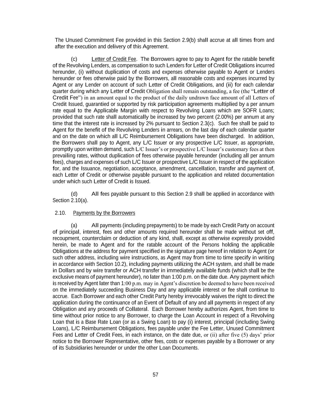 57 The Unused Commitment Fee provided in this Section 2.9(b) shall accrue at all times from and after the execution and delivery of this Agreement. (c) Letter of Credit Fee. The Borrowers agree to pay to Agent for the ratable benefit of the Revolving Lenders, as compensation to such Lenders for Letter of Credit Obligations incurred hereunder, (i) without duplication of costs and expenses otherwise payable to Agent or Lenders hereunder or fees otherwise paid by the Borrowers, all reasonable costs and expenses incurred by Agent or any Lender on account of such Letter of Credit Obligations, and (ii) for each calendar quarter during which any Letter of Credit Obligation shall remain outstanding, a fee (the “Letter of Credit Fee”) in an amount equal to the product of the daily undrawn face amount of all Letters of Credit Issued, guarantied or supported by risk participation agreements multiplied by a per annum rate equal to the Applicable Margin with respect to Revolving Loans which are SOFR Loans; provided that such rate shall automatically be increased by two percent (2.00%) per annum at any time that the interest rate is increased by 2% pursuant to Section 2.3(c). Such fee shall be paid to Agent for the benefit of the Revolving Lenders in arrears, on the last day of each calendar quarter and on the date on which all L/C Reimbursement Obligations have been discharged. In addition, the Borrowers shall pay to Agent, any L/C Issuer or any prospective L/C Issuer, as appropriate, promptly upon written demand, such L/C Issuer’s or prospective L/C Issuer’s customary fees at then prevailing rates, without duplication of fees otherwise payable hereunder (including all per annum fees), charges and expenses of such L/C Issuer or prospective L/C Issuer in respect of the application for, and the Issuance, negotiation, acceptance, amendment, cancellation, transfer and payment of, each Letter of Credit or otherwise payable pursuant to the application and related documentation under which such Letter of Credit is Issued. (d) All fees payable pursuant to this Section 2.9 shall be applied in accordance with Section 2.10(a). 2.10. Payments by the Borrowers (a) All payments (including prepayments) to be made by each Credit Party on account of principal, interest, fees and other amounts required hereunder shall be made without set off, recoupment, counterclaim or deduction of any kind, shall, except as otherwise expressly provided herein, be made to Agent and for the ratable account of the Persons holding the applicable Obligations at the address for payment specified in the signature page hereof in relation to Agent (or such other address, including wire instructions, as Agent may from time to time specify in writing in accordance with Section 10.2), including payments utilizing the ACH system, and shall be made in Dollars and by wire transfer or ACH transfer in immediately available funds (which shall be the exclusive means of payment hereunder), no later than 1:00 p.m. on the date due. Any payment which is received by Agent later than 1:00 p.m. may in Agent’s discretion be deemed to have been received on the immediately succeeding Business Day and any applicable interest or fee shall continue to accrue. Each Borrower and each other Credit Party hereby irrevocably waives the right to direct the application during the continuance of an Event of Default of any and all payments in respect of any Obligation and any proceeds of Collateral. Each Borrower hereby authorizes Agent, from time to time without prior notice to any Borrower, to charge the Loan Account in respect of a Revolving Loan that is a Base Rate Loan (or as a Swing Loan) to pay (i) interest, principal (including Swing Loans), L/C Reimbursement Obligations, fees payable under the Fee Letter, Unused Commitment Fees and Letter of Credit Fees, in each instance, on the date due, or (ii) after five (5) days’ prior notice to the Borrower Representative, other fees, costs or expenses payable by a Borrower or any of its Subsidiaries hereunder or under the other Loan Documents.