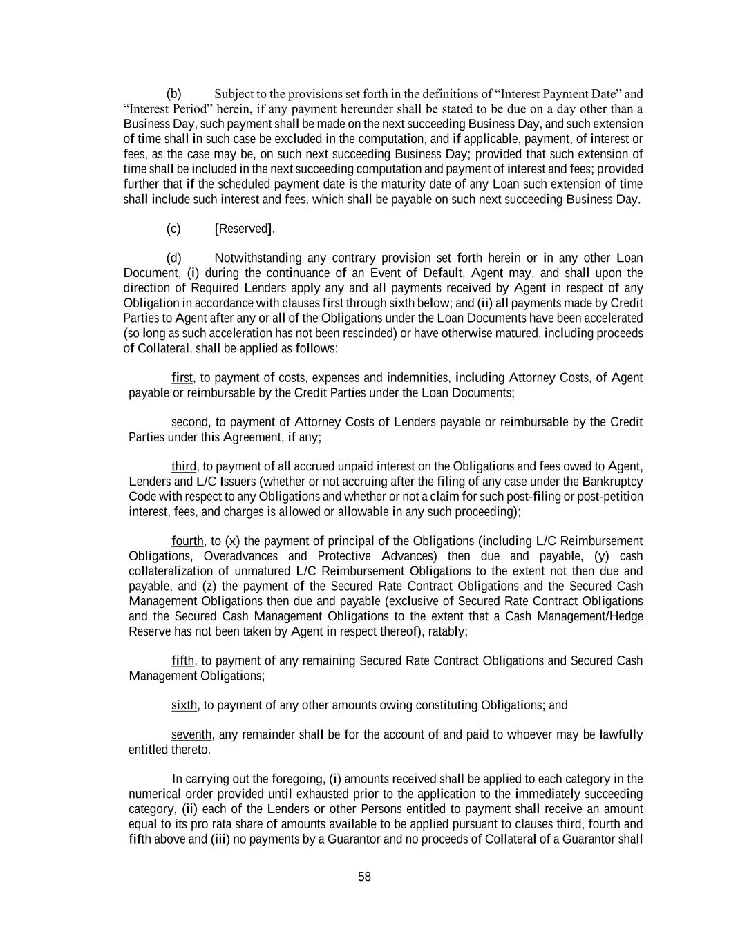 58 (b) Subject to the provisions set forth in the definitions of “Interest Payment Date” and “Interest Period” herein, if any payment hereunder shall be stated to be due on a day other than a Business Day, such payment shall be made on the next succeeding Business Day, and such extension of time shall in such case be excluded in the computation, and if applicable, payment, of interest or fees, as the case may be, on such next succeeding Business Day; provided that such extension of time shall be included in the next succeeding computation and payment of interest and fees; provided further that if the scheduled payment date is the maturity date of any Loan such extension of time shall include such interest and fees, which shall be payable on such next succeeding Business Day. (c) [Reserved]. (d) Notwithstanding any contrary provision set forth herein or in any other Loan Document, (i) during the continuance of an Event of Default, Agent may, and shall upon the direction of Required Lenders apply any and all payments received by Agent in respect of any Obligation in accordance with clauses first through sixth below; and (ii) all payments made by Credit Parties to Agent after any or all of the Obligations under the Loan Documents have been accelerated (so long as such acceleration has not been rescinded) or have otherwise matured, including proceeds of Collateral, shall be applied as follows: first, to payment of costs, expenses and indemnities, including Attorney Costs, of Agent payable or reimbursable by the Credit Parties under the Loan Documents; second, to payment of Attorney Costs of Lenders payable or reimbursable by the Credit Parties under this Agreement, if any; third, to payment of all accrued unpaid interest on the Obligations and fees owed to Agent, Lenders and L/C Issuers (whether or not accruing after the filing of any case under the Bankruptcy Code with respect to any Obligations and whether or not a claim for such post-filing or post-petition interest, fees, and charges is allowed or allowable in any such proceeding); fourth, to (x) the payment of principal of the Obligations (including L/C Reimbursement Obligations, Overadvances and Protective Advances) then due and payable, (y) cash collateralization of unmatured L/C Reimbursement Obligations to the extent not then due and payable, and (z) the payment of the Secured Rate Contract Obligations and the Secured Cash Management Obligations then due and payable (exclusive of Secured Rate Contract Obligations and the Secured Cash Management Obligations to the extent that a Cash Management/Hedge Reserve has not been taken by Agent in respect thereof), ratably; fifth, to payment of any remaining Secured Rate Contract Obligations and Secured Cash Management Obligations; sixth, to payment of any other amounts owing constituting Obligations; and seventh, any remainder shall be for the account of and paid to whoever may be lawfully entitled thereto. In carrying out the foregoing, (i) amounts received shall be applied to each category in the numerical order provided until exhausted prior to the application to the immediately succeeding category, (ii) each of the Lenders or other Persons entitled to payment shall receive an amount equal to its pro rata share of amounts available to be applied pursuant to clauses third, fourth and fifth above and (iii) no payments by a Guarantor and no proceeds of Collateral of a Guarantor shall