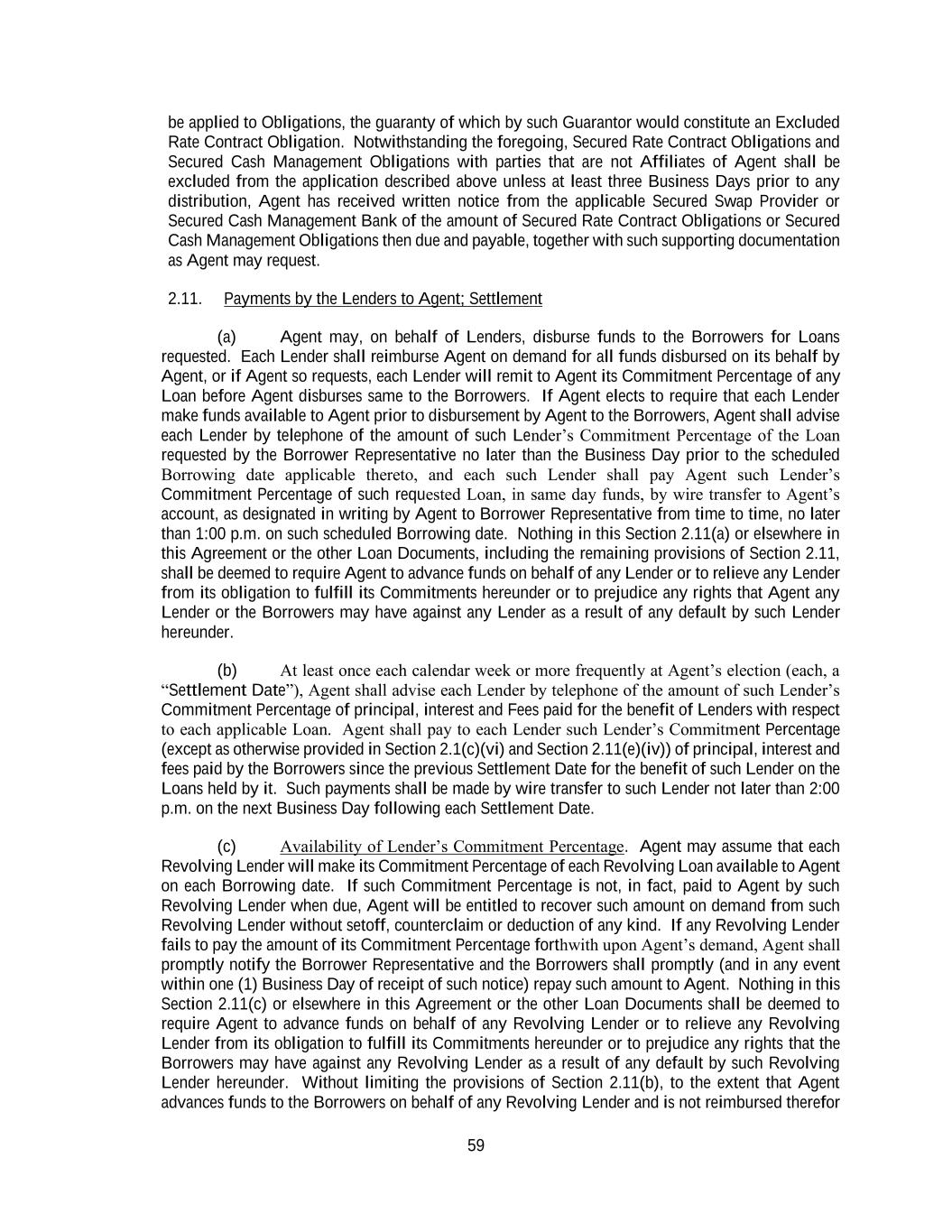 59 be applied to Obligations, the guaranty of which by such Guarantor would constitute an Excluded Rate Contract Obligation. Notwithstanding the foregoing, Secured Rate Contract Obligations and Secured Cash Management Obligations with parties that are not Affiliates of Agent shall be excluded from the application described above unless at least three Business Days prior to any distribution, Agent has received written notice from the applicable Secured Swap Provider or Secured Cash Management Bank of the amount of Secured Rate Contract Obligations or Secured Cash Management Obligations then due and payable, together with such supporting documentation as Agent may request. 2.11. Payments by the Lenders to Agent; Settlement (a) Agent may, on behalf of Lenders, disburse funds to the Borrowers for Loans requested. Each Lender shall reimburse Agent on demand for all funds disbursed on its behalf by Agent, or if Agent so requests, each Lender will remit to Agent its Commitment Percentage of any Loan before Agent disburses same to the Borrowers. If Agent elects to require that each Lender make funds available to Agent prior to disbursement by Agent to the Borrowers, Agent shall advise each Lender by telephone of the amount of such Lender’s Commitment Percentage of the Loan requested by the Borrower Representative no later than the Business Day prior to the scheduled Borrowing date applicable thereto, and each such Lender shall pay Agent such Lender’s Commitment Percentage of such requested Loan, in same day funds, by wire transfer to Agent’s account, as designated in writing by Agent to Borrower Representative from time to time, no later than 1:00 p.m. on such scheduled Borrowing date. Nothing in this Section 2.11(a) or elsewhere in this Agreement or the other Loan Documents, including the remaining provisions of Section 2.11, shall be deemed to require Agent to advance funds on behalf of any Lender or to relieve any Lender from its obligation to fulfill its Commitments hereunder or to prejudice any rights that Agent any Lender or the Borrowers may have against any Lender as a result of any default by such Lender hereunder. (b) At least once each calendar week or more frequently at Agent’s election (each, a “Settlement Date”), Agent shall advise each Lender by telephone of the amount of such Lender’s Commitment Percentage of principal, interest and Fees paid for the benefit of Lenders with respect to each applicable Loan. Agent shall pay to each Lender such Lender’s Commitment Percentage (except as otherwise provided in Section 2.1(c)(vi) and Section 2.11(e)(iv)) of principal, interest and fees paid by the Borrowers since the previous Settlement Date for the benefit of such Lender on the Loans held by it. Such payments shall be made by wire transfer to such Lender not later than 2:00 p.m. on the next Business Day following each Settlement Date. (c) Availability of Lender’s Commitment Percentage. Agent may assume that each Revolving Lender will make its Commitment Percentage of each Revolving Loan available to Agent on each Borrowing date. If such Commitment Percentage is not, in fact, paid to Agent by such Revolving Lender when due, Agent will be entitled to recover such amount on demand from such Revolving Lender without setoff, counterclaim or deduction of any kind. If any Revolving Lender fails to pay the amount of its Commitment Percentage forthwith upon Agent’s demand, Agent shall promptly notify the Borrower Representative and the Borrowers shall promptly (and in any event within one (1) Business Day of receipt of such notice) repay such amount to Agent. Nothing in this Section 2.11(c) or elsewhere in this Agreement or the other Loan Documents shall be deemed to require Agent to advance funds on behalf of any Revolving Lender or to relieve any Revolving Lender from its obligation to fulfill its Commitments hereunder or to prejudice any rights that the Borrowers may have against any Revolving Lender as a result of any default by such Revolving Lender hereunder. Without limiting the provisions of Section 2.11(b), to the extent that Agent advances funds to the Borrowers on behalf of any Revolving Lender and is not reimbursed therefor