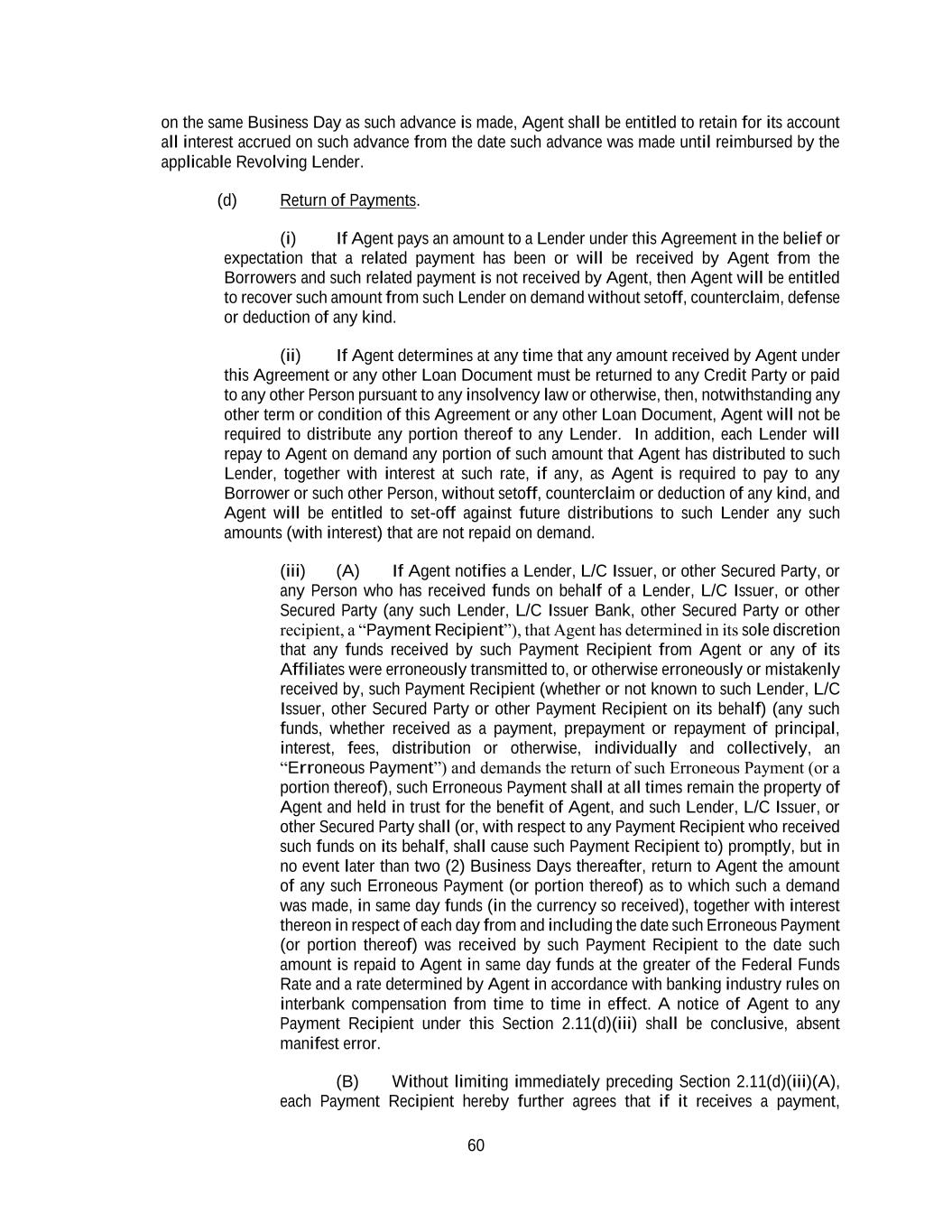 60 on the same Business Day as such advance is made, Agent shall be entitled to retain for its account all interest accrued on such advance from the date such advance was made until reimbursed by the applicable Revolving Lender. (d) Return of Payments. (i) If Agent pays an amount to a Lender under this Agreement in the belief or expectation that a related payment has been or will be received by Agent from the Borrowers and such related payment is not received by Agent, then Agent will be entitled to recover such amount from such Lender on demand without setoff, counterclaim, defense or deduction of any kind. (ii) If Agent determines at any time that any amount received by Agent under this Agreement or any other Loan Document must be returned to any Credit Party or paid to any other Person pursuant to any insolvency law or otherwise, then, notwithstanding any other term or condition of this Agreement or any other Loan Document, Agent will not be required to distribute any portion thereof to any Lender. In addition, each Lender will repay to Agent on demand any portion of such amount that Agent has distributed to such Lender, together with interest at such rate, if any, as Agent is required to pay to any Borrower or such other Person, without setoff, counterclaim or deduction of any kind, and Agent will be entitled to set-off against future distributions to such Lender any such amounts (with interest) that are not repaid on demand. (iii) (A) If Agent notifies a Lender, L/C Issuer, or other Secured Party, or any Person who has received funds on behalf of a Lender, L/C Issuer, or other Secured Party (any such Lender, L/C Issuer Bank, other Secured Party or other recipient, a “Payment Recipient”), that Agent has determined in its sole discretion that any funds received by such Payment Recipient from Agent or any of its Affiliates were erroneously transmitted to, or otherwise erroneously or mistakenly received by, such Payment Recipient (whether or not known to such Lender, L/C Issuer, other Secured Party or other Payment Recipient on its behalf) (any such funds, whether received as a payment, prepayment or repayment of principal, interest, fees, distribution or otherwise, individually and collectively, an “Erroneous Payment”) and demands the return of such Erroneous Payment (or a portion thereof), such Erroneous Payment shall at all times remain the property of Agent and held in trust for the benefit of Agent, and such Lender, L/C Issuer, or other Secured Party shall (or, with respect to any Payment Recipient who received such funds on its behalf, shall cause such Payment Recipient to) promptly, but in no event later than two (2) Business Days thereafter, return to Agent the amount of any such Erroneous Payment (or portion thereof) as to which such a demand was made, in same day funds (in the currency so received), together with interest thereon in respect of each day from and including the date such Erroneous Payment (or portion thereof) was received by such Payment Recipient to the date such amount is repaid to Agent in same day funds at the greater of the Federal Funds Rate and a rate determined by Agent in accordance with banking industry rules on interbank compensation from time to time in effect. A notice of Agent to any Payment Recipient under this Section 2.11(d)(iii) shall be conclusive, absent manifest error. (B) Without limiting immediately preceding Section 2.11(d)(iii)(A), each Payment Recipient hereby further agrees that if it receives a payment,