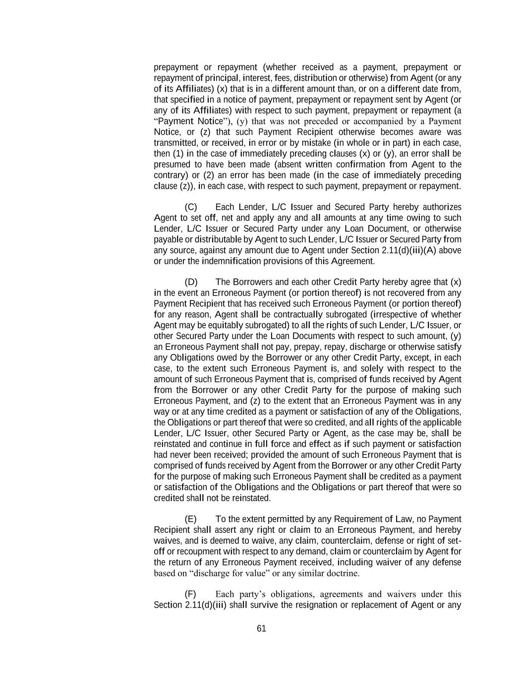 61 prepayment or repayment (whether received as a payment, prepayment or repayment of principal, interest, fees, distribution or otherwise) from Agent (or any of its Affiliates) (x) that is in a different amount than, or on a different date from, that specified in a notice of payment, prepayment or repayment sent by Agent (or any of its Affiliates) with respect to such payment, prepayment or repayment (a “Payment Notice”), (y) that was not preceded or accompanied by a Payment Notice, or (z) that such Payment Recipient otherwise becomes aware was transmitted, or received, in error or by mistake (in whole or in part) in each case, then (1) in the case of immediately preceding clauses (x) or (y), an error shall be presumed to have been made (absent written confirmation from Agent to the contrary) or (2) an error has been made (in the case of immediately preceding clause (z)), in each case, with respect to such payment, prepayment or repayment. (C) Each Lender, L/C Issuer and Secured Party hereby authorizes Agent to set off, net and apply any and all amounts at any time owing to such Lender, L/C Issuer or Secured Party under any Loan Document, or otherwise payable or distributable by Agent to such Lender, L/C Issuer or Secured Party from any source, against any amount due to Agent under Section 2.11(d)(iii)(A) above or under the indemnification provisions of this Agreement. (D) The Borrowers and each other Credit Party hereby agree that (x) in the event an Erroneous Payment (or portion thereof) is not recovered from any Payment Recipient that has received such Erroneous Payment (or portion thereof) for any reason, Agent shall be contractually subrogated (irrespective of whether Agent may be equitably subrogated) to all the rights of such Lender, L/C Issuer, or other Secured Party under the Loan Documents with respect to such amount, (y) an Erroneous Payment shall not pay, prepay, repay, discharge or otherwise satisfy any Obligations owed by the Borrower or any other Credit Party, except, in each case, to the extent such Erroneous Payment is, and solely with respect to the amount of such Erroneous Payment that is, comprised of funds received by Agent from the Borrower or any other Credit Party for the purpose of making such Erroneous Payment, and (z) to the extent that an Erroneous Payment was in any way or at any time credited as a payment or satisfaction of any of the Obligations, the Obligations or part thereof that were so credited, and all rights of the applicable Lender, L/C Issuer, other Secured Party or Agent, as the case may be, shall be reinstated and continue in full force and effect as if such payment or satisfaction had never been received; provided the amount of such Erroneous Payment that is comprised of funds received by Agent from the Borrower or any other Credit Party for the purpose of making such Erroneous Payment shall be credited as a payment or satisfaction of the Obligations and the Obligations or part thereof that were so credited shall not be reinstated. (E) To the extent permitted by any Requirement of Law, no Payment Recipient shall assert any right or claim to an Erroneous Payment, and hereby waives, and is deemed to waive, any claim, counterclaim, defense or right of set- off or recoupment with respect to any demand, claim or counterclaim by Agent for the return of any Erroneous Payment received, including waiver of any defense based on “discharge for value” or any similar doctrine. (F) Each party’s obligations, agreements and waivers under this Section 2.11(d)(iii) shall survive the resignation or replacement of Agent or any
